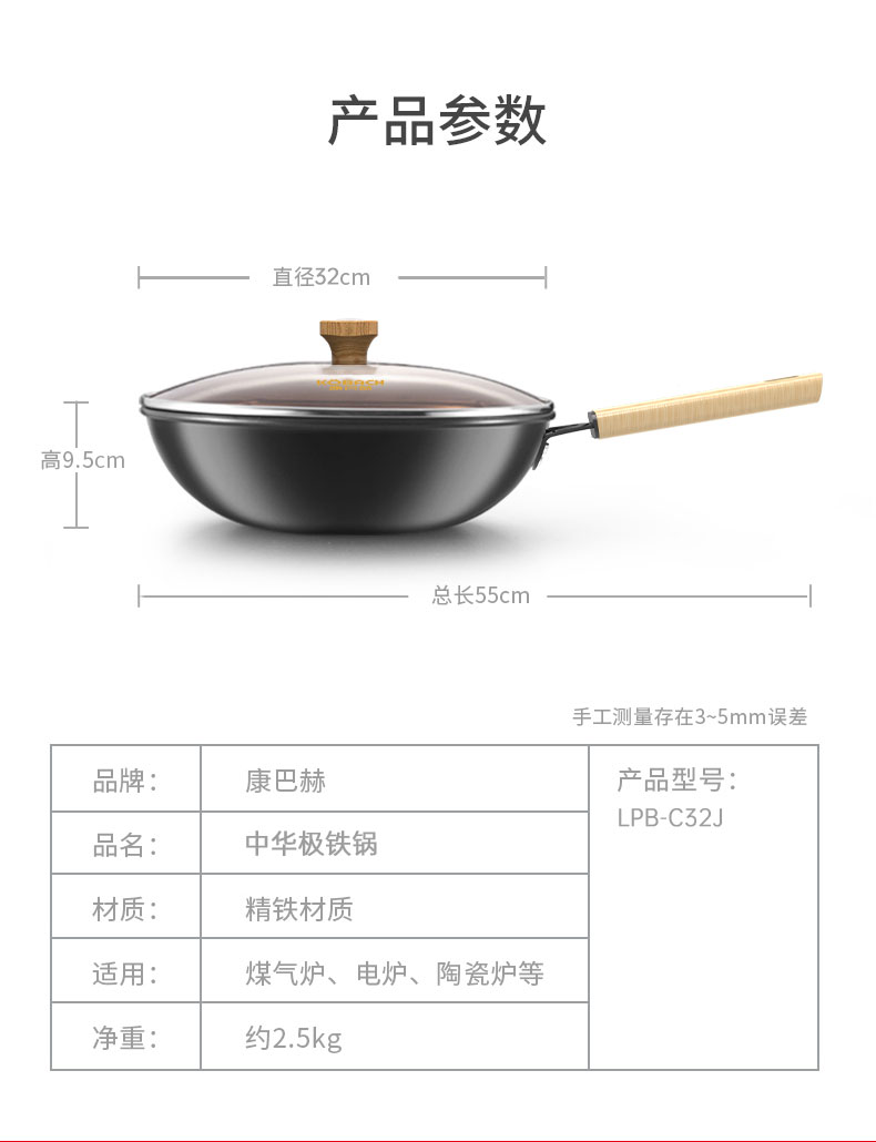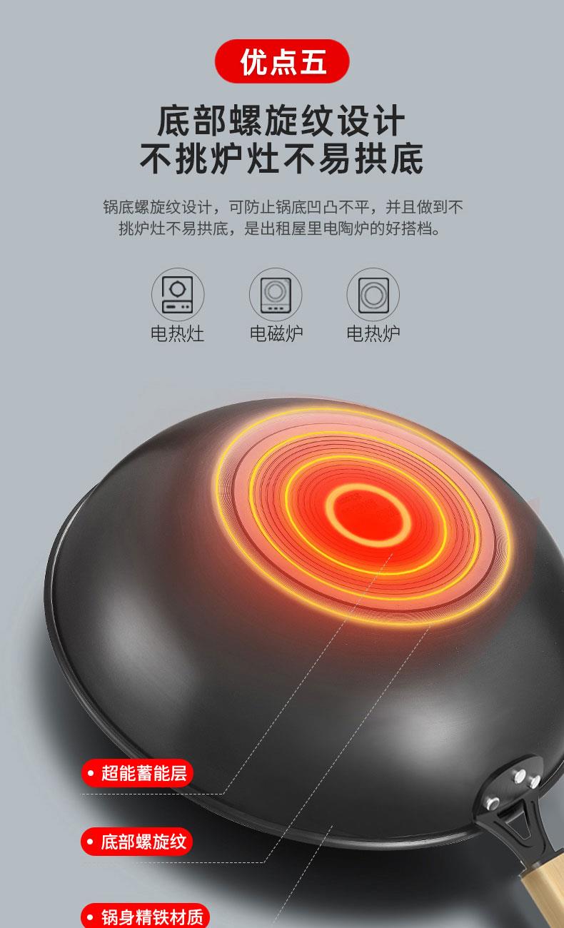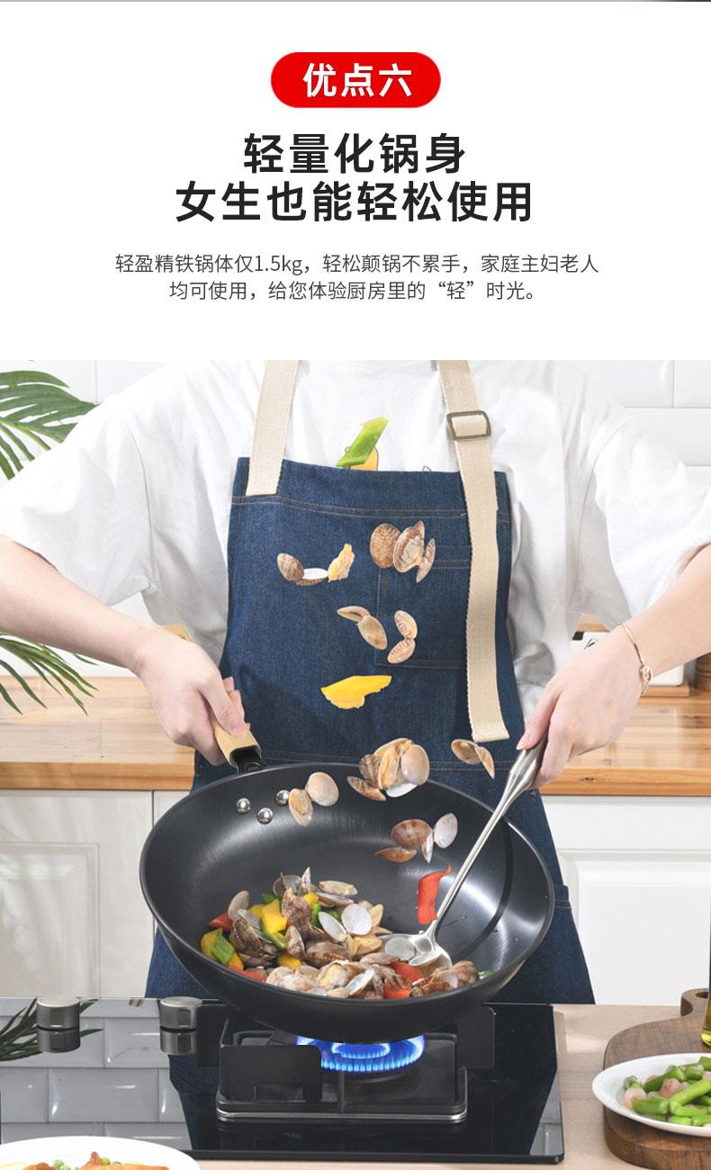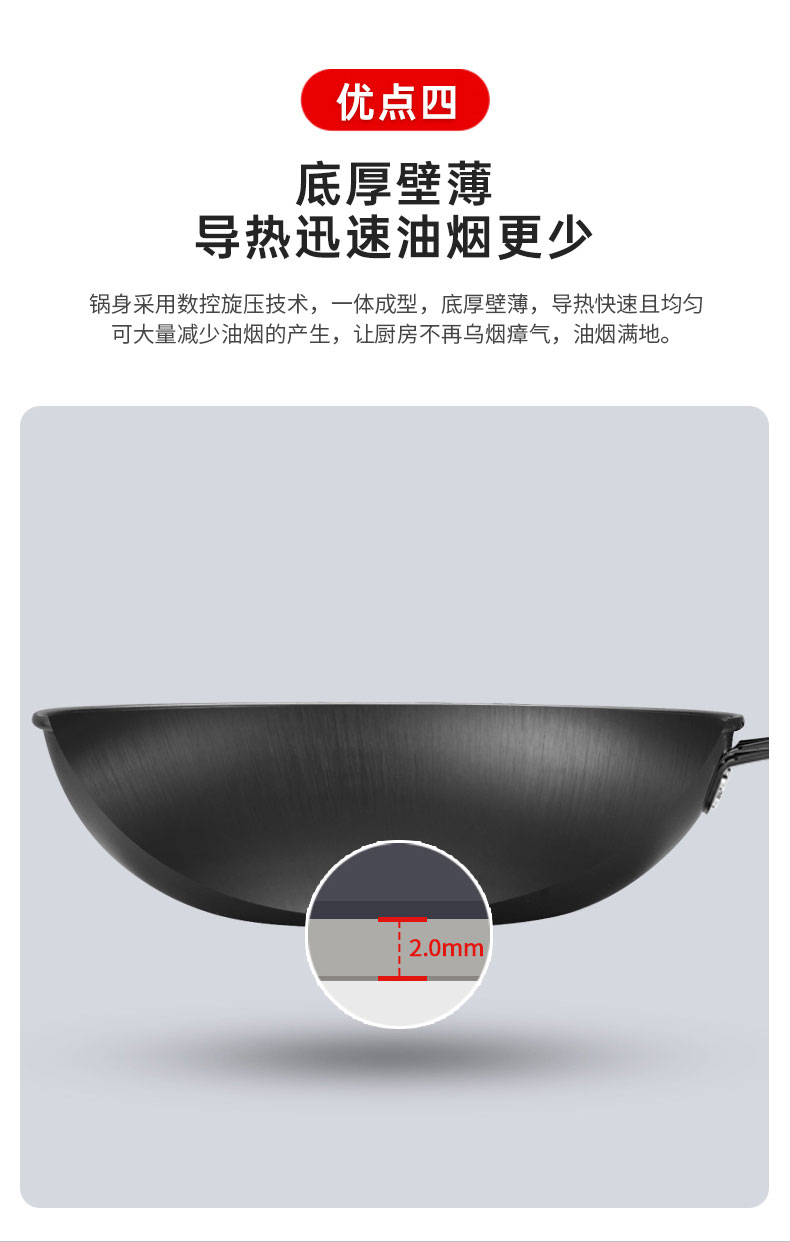 规格:32cm 重量:2.6kg 包装尺寸:77*40*53cm ◎甄选优质精铁打造锅身,不挑锅铲,金属、硅胶、木质锅铲等都可以使用;不挑食材,花蛤、螺师、排骨都可以轻松驾驭;不挑清洁工具,钢丝球、百洁布都可以洗涤,无涂层,坚硬耐磨,再不用担心掉漆了。 ◎采用渗氮处理新型技术,经两次高温熔炼提纯工艺,提高了铁的硬度和密度,大大增强铁锅防锈能力,再也不用担心锈迹斑斓危害身体健康。 ◎铁锅在开锅后,锅体表面自然形成防粘油膜,有效防止食物粘锅,爆炒更加得心应手。 ◎锅身采用数控旋压技术,一体成型,底厚壁薄,导热快速且均匀可大量减少油烟的产生,让厨房不再乌烟瘴气,油烟满地。 ◎锅底螺旋纹设计,可防止锅底凹凸不平,并且做到不挑炉灶不易拱底,是出租屋里电陶炉的好搭档。