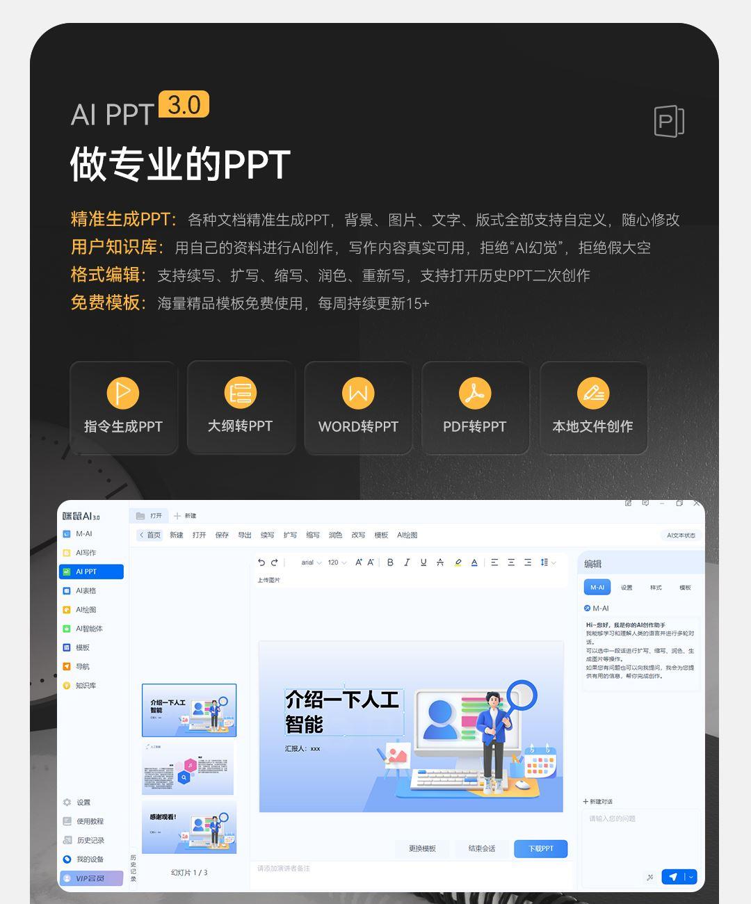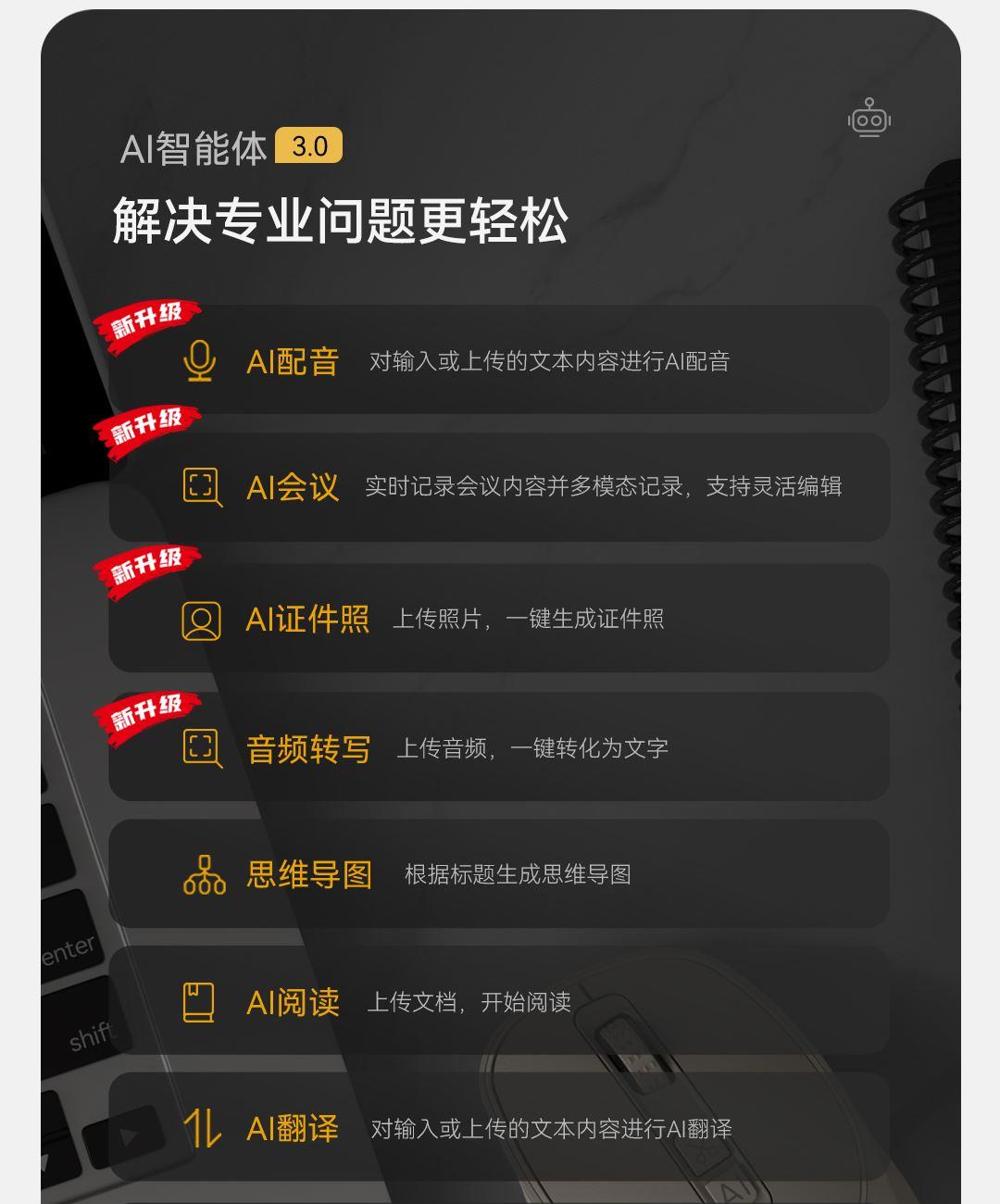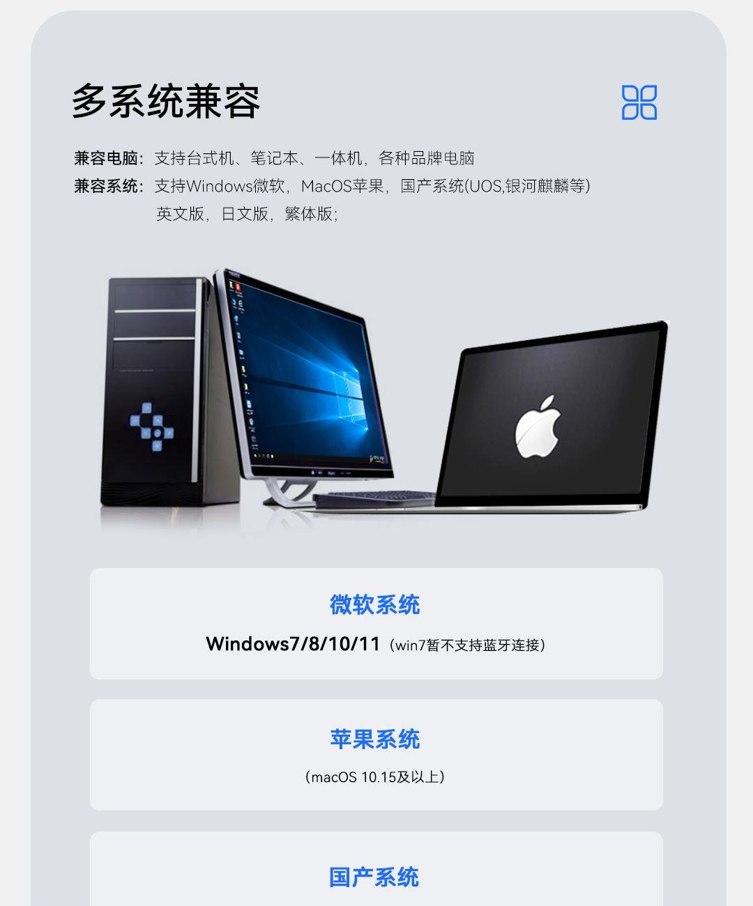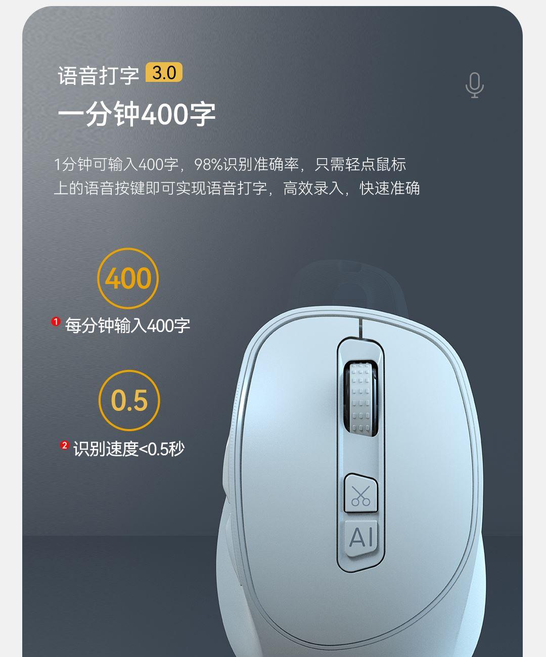 1.材质:ABS 2.搭载AI大模型:搭载9款 AI大模型 3.同时连接设备数量:3台 4.连接方式:无线2.4G 蓝牙 5.兼容系统:兼容多系统 6.鼠标类型:对称手型 7. 供电方式:充电电池 8.电池容量600mAh 1.搭载Deepseek-R1模型6大通用模型+3大专业模型 2.AI问答 3.0 上知天文 下知地理 3.AI写作 3.0写有用的文章 4.AI PPT 3.0 做专业的PPT 5.AI绘图3.0绘画图片 6.AI智能体 3.0 解决专业问题更轻松 7.AI 3.0表格做全面的表格 8.AI 3.0 表格做全面的表格 9.语音打字3.0 一分钟400字 10.语音打字3.0 一分钟400字 11.AI截图 3.0一键截图提取 轻松编辑 12.双模更便利 13. 多系统接入