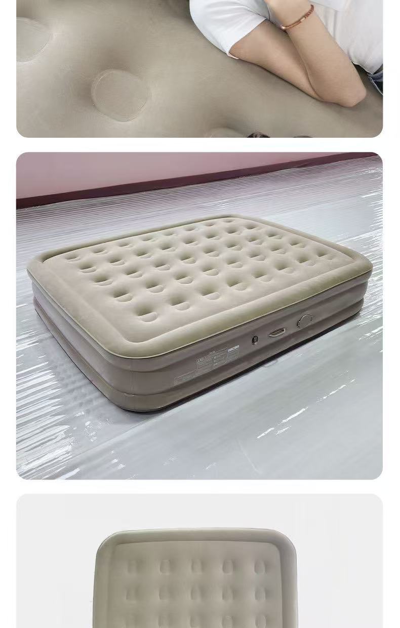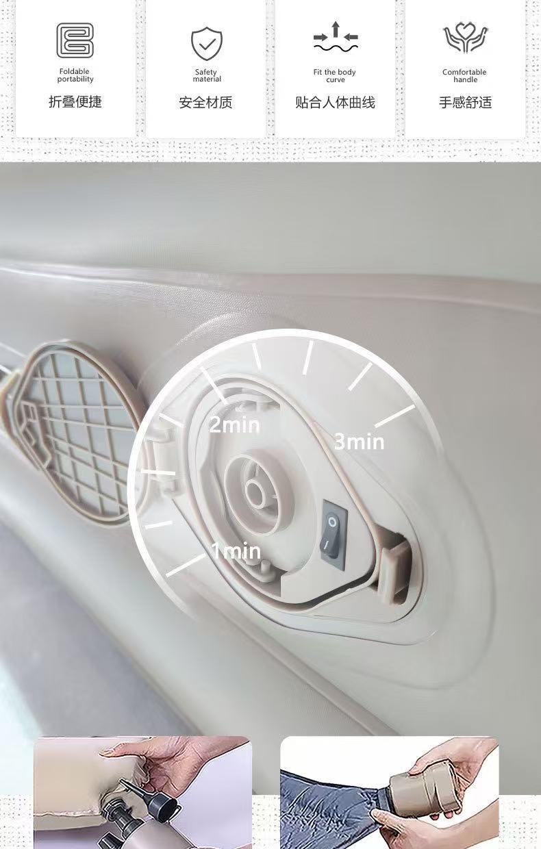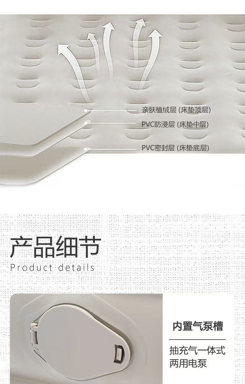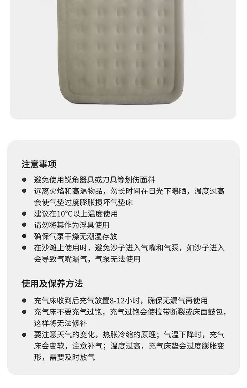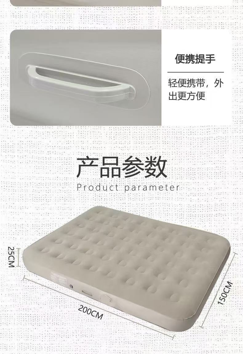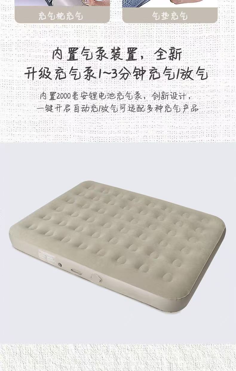 材质:PVC植绒 配置:自动充气床×1、充气枕×2、修补包×1、收纳袋×1 颜色:香槟棕色 展开尺寸:200×150×25CM 重量:约5kg 承重:约220KG 1、PVC植绒亲肤面料,柔软贴肤隔热; 2、内置2600毫安电池自动充气泵,自动充气放气; 3、便携设计,不占空间,携带方便; 4、1.5×2m加宽尺寸,适用多种户外场景; 5、内配枕头2个,收纳袋1个;