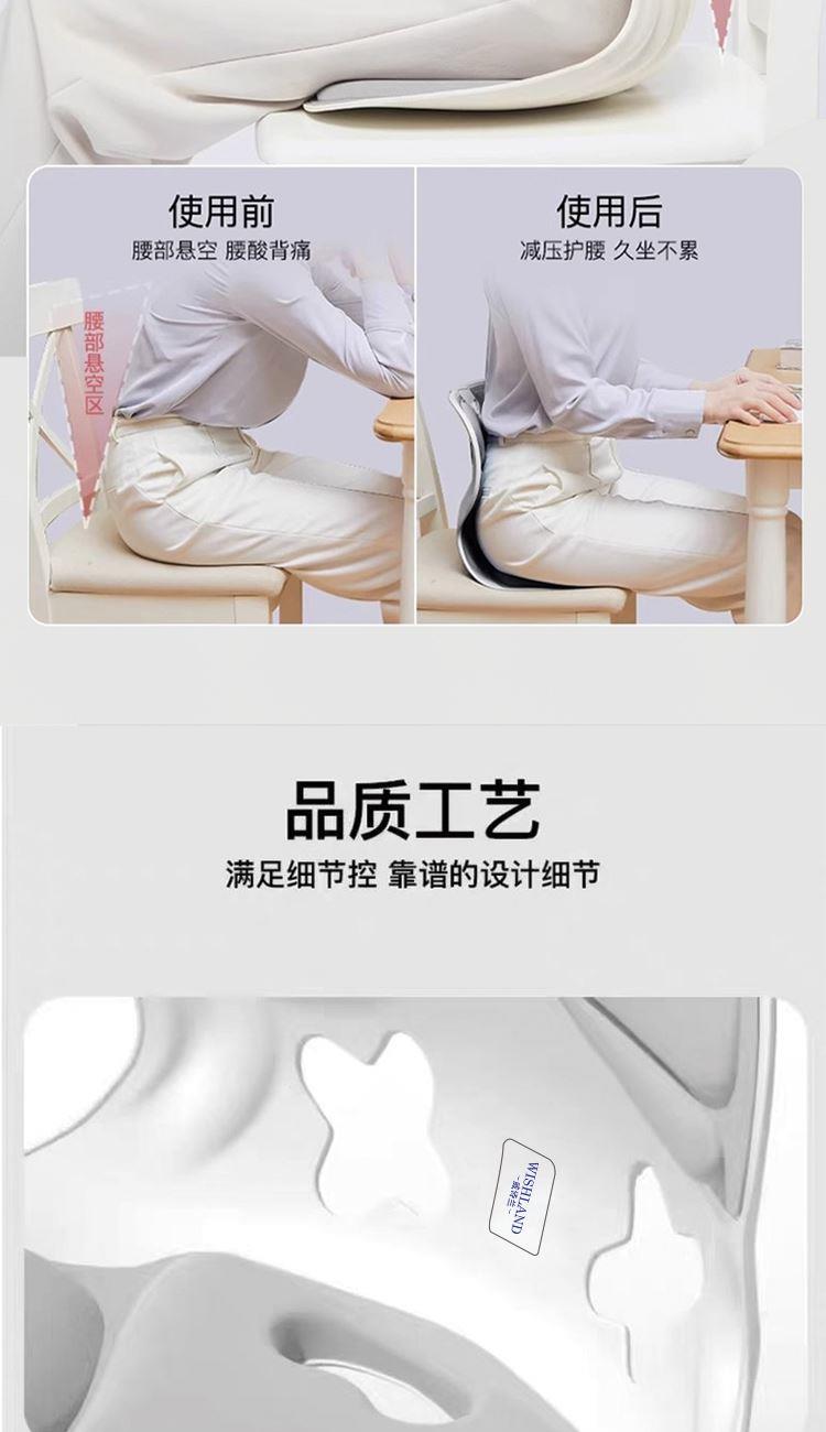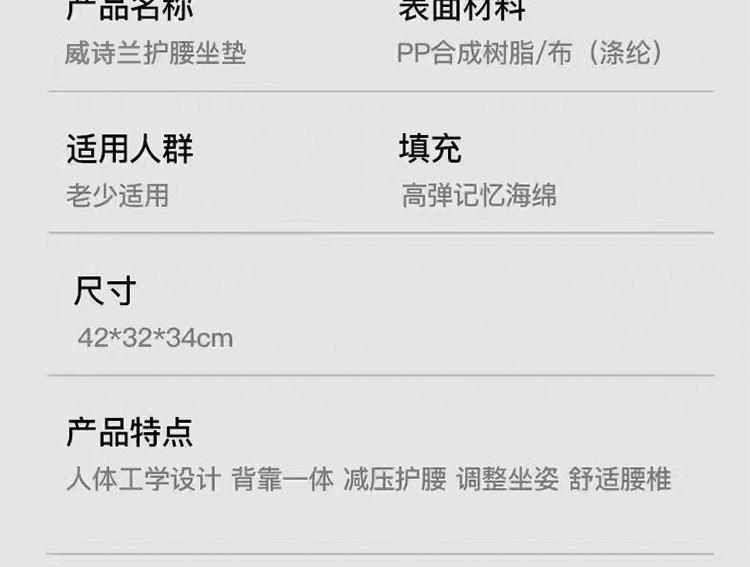 产品配置: 1、黄包款式: 护腰坐垫*1、精美黄盒*1 2、彩盒款式: 护腰坐垫*1、精美彩盒*12、气泡袋款式(一件代发方式): 护腰坐垫*1、气泡袋*1 产品规格: 护腰坐垫WL-Y05 表面材料:PP合成树脂/布(涤纶) 填充:高弹记忆海绵 尺寸:42*32*34cm