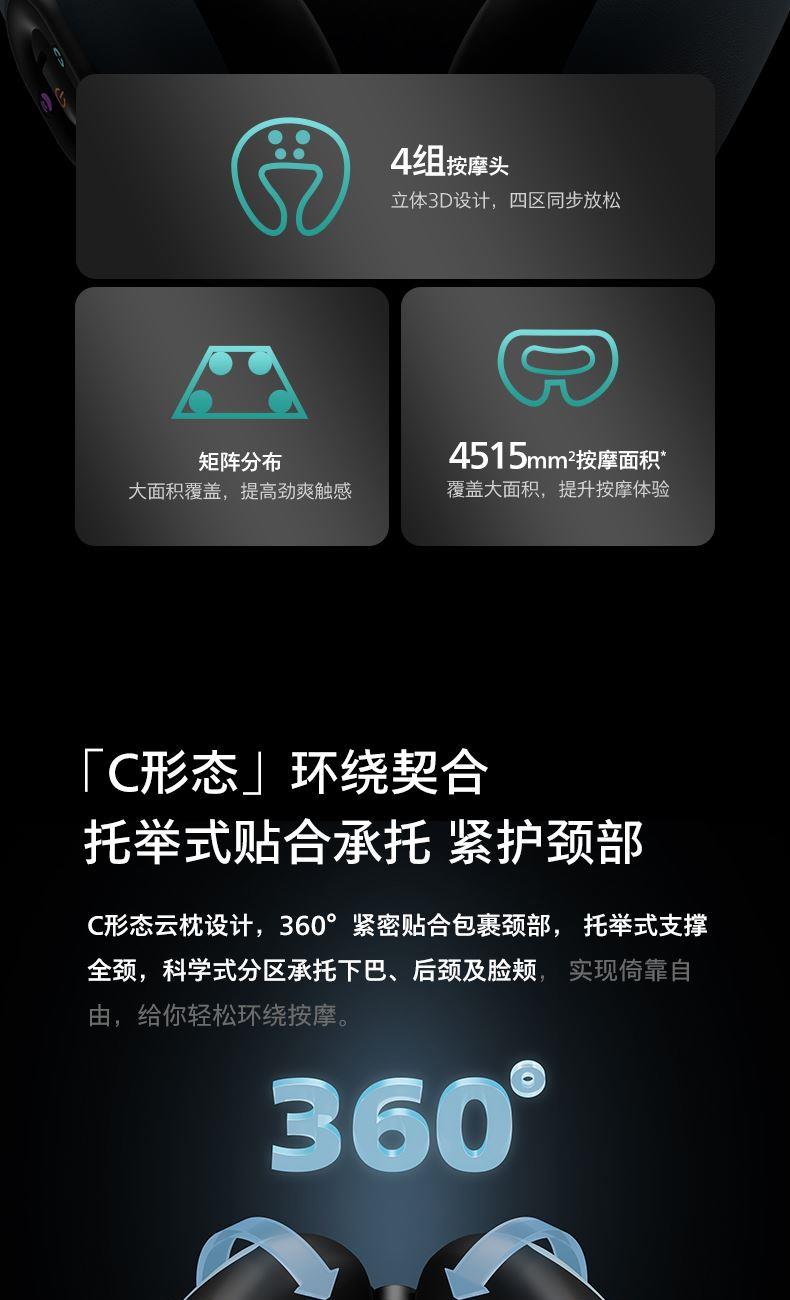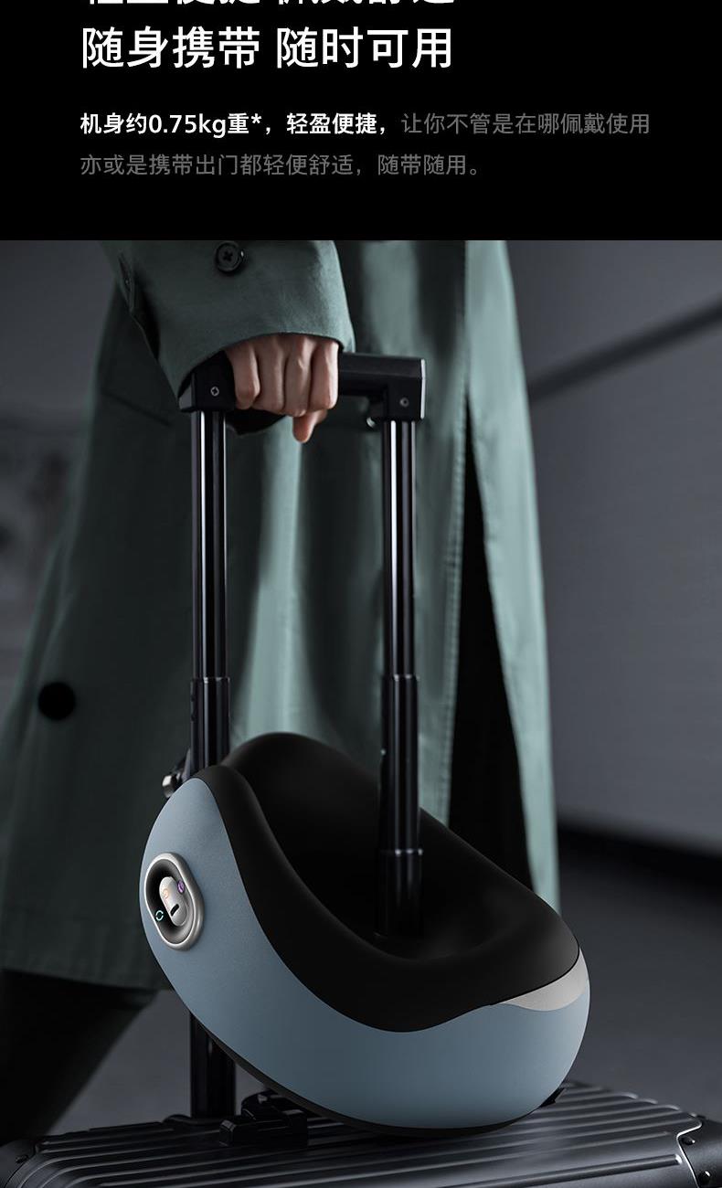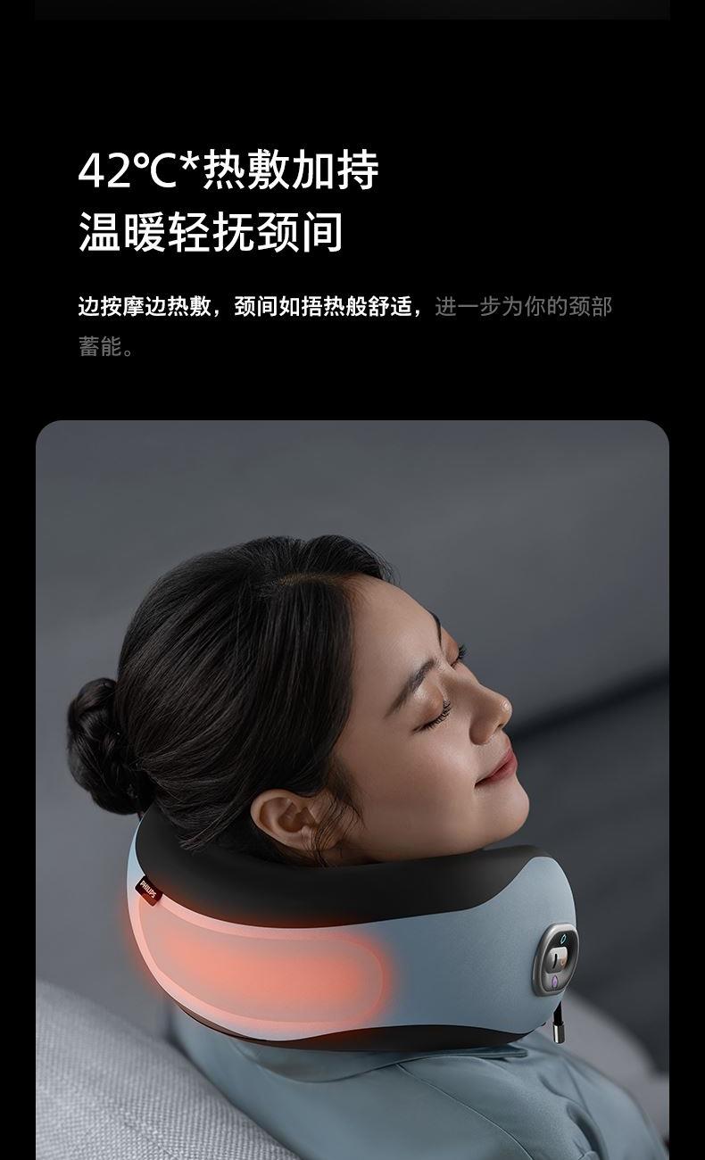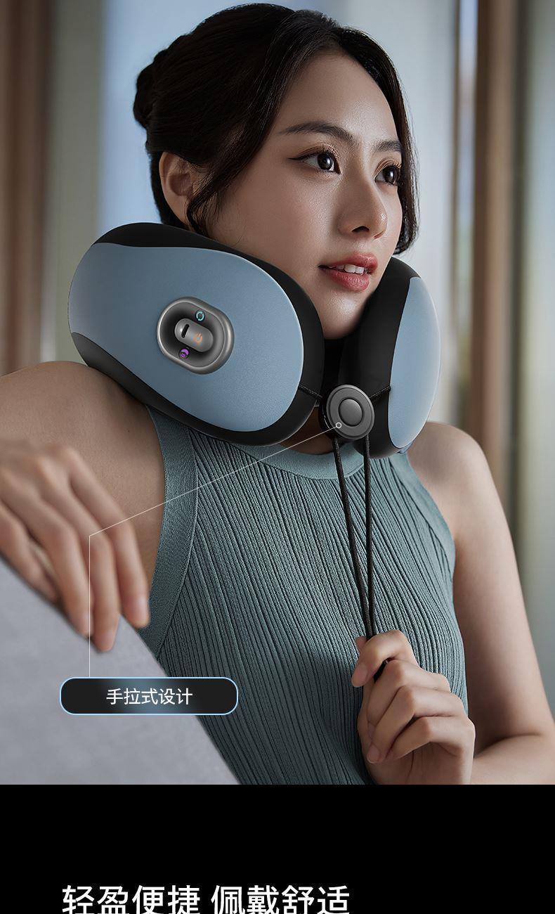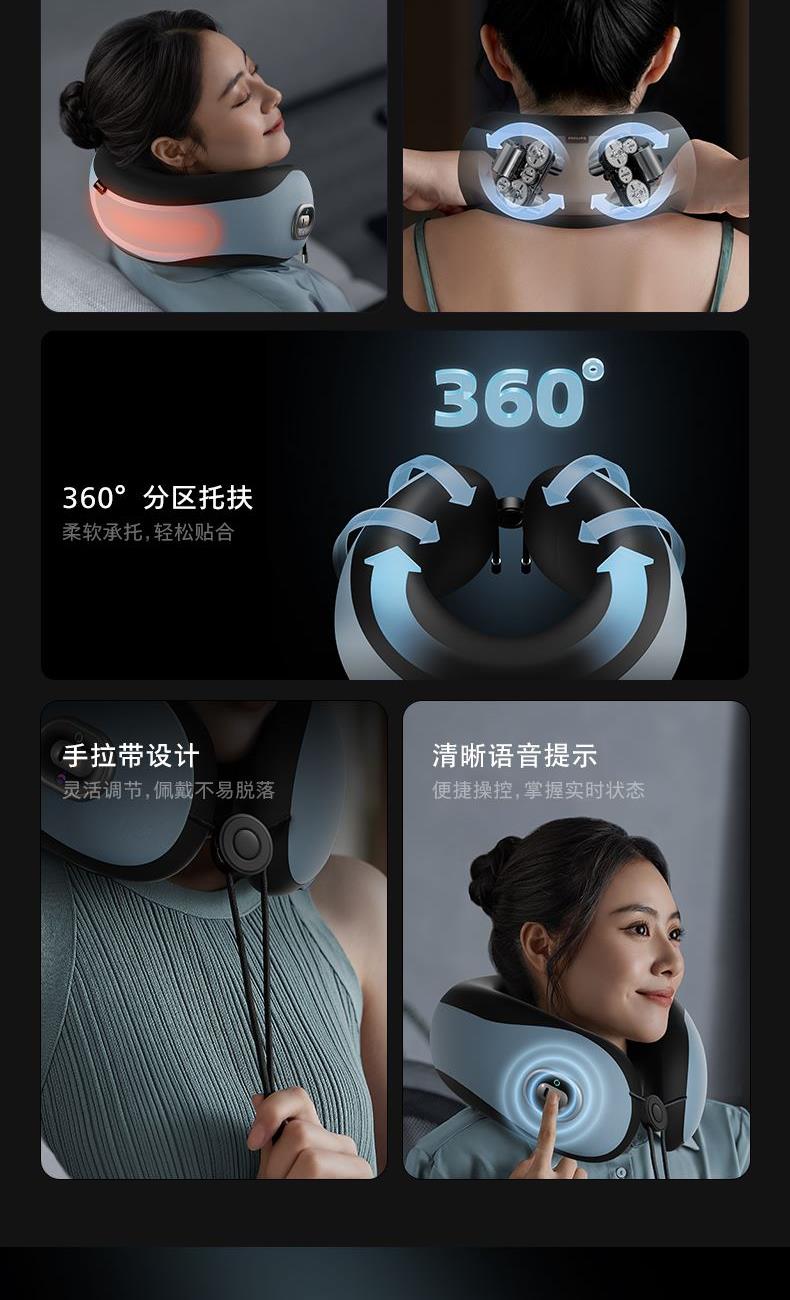 功能:颈部支撑、按摩、热敷 工作电压:3.7V⎓ 工作功率:12W 充电电压:5V⎓ 充电电流:1A 产品尺寸:282*240*115mm 产品净重:约0.75kg 电池容量:2000mAh 续航时间:约90min 包装尺寸:0.75kg 毛重:约1.3kg 产品卖点 1、四组3D按摩头,八字型按摩阵列覆盖颈部 2、42℃热敷加持,温暖轻抚颈部不适 3、C形态云枕设计,360°紧密贴合包裹颈部 4、内填充慢回弹记忆棉,轻盈柔韧有力量 5、手拉带设计可随意调节松紧度