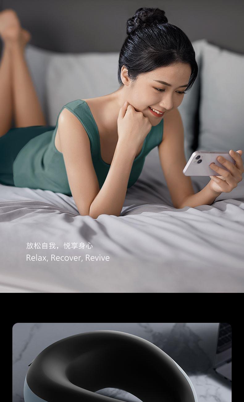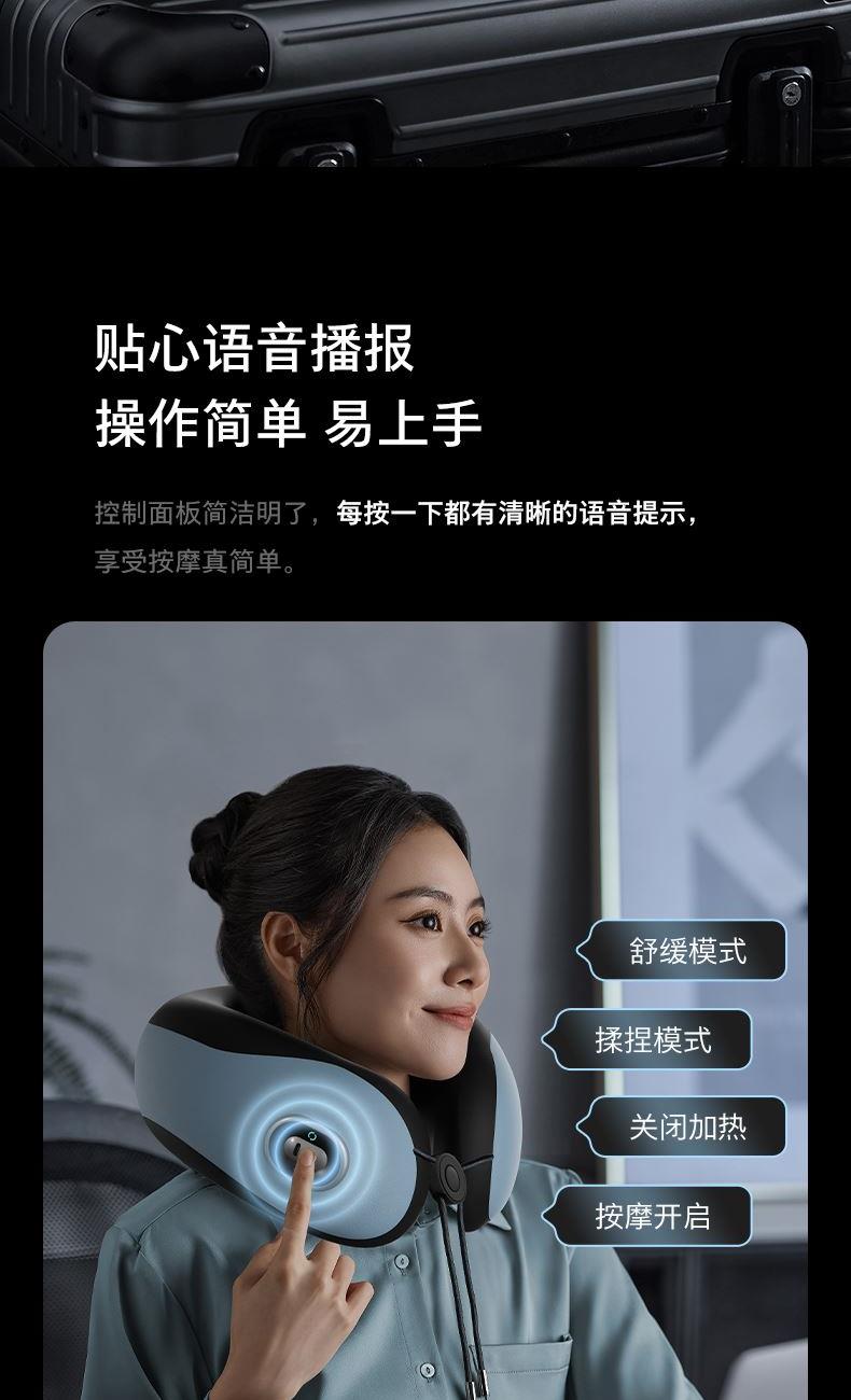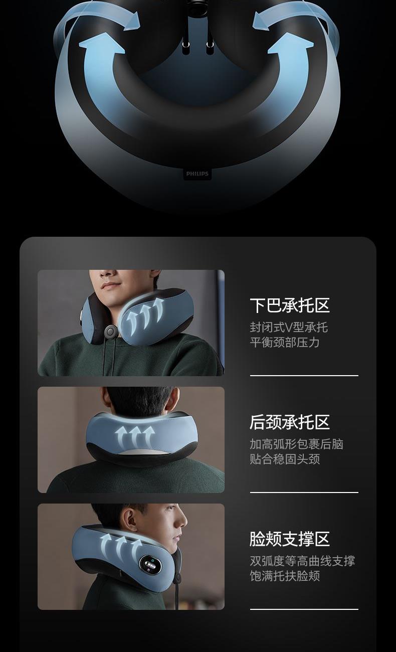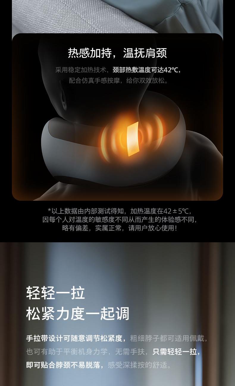 功能:颈部支撑、按摩、热敷 工作电压:3.7V⎓ 工作功率:12W 充电电压:5V⎓ 充电电流:1A 产品尺寸:282*240*115mm 产品净重:约0.75kg 电池容量:2000mAh 续航时间:约90min 包装尺寸:0.75kg 毛重:约1.3kg 产品卖点 1、四组3D按摩头,八字型按摩阵列覆盖颈部 2、42℃热敷加持,温暖轻抚颈部不适 3、C形态云枕设计,360°紧密贴合包裹颈部 4、内填充慢回弹记忆棉,轻盈柔韧有力量 5、手拉带设计可随意调节松紧度