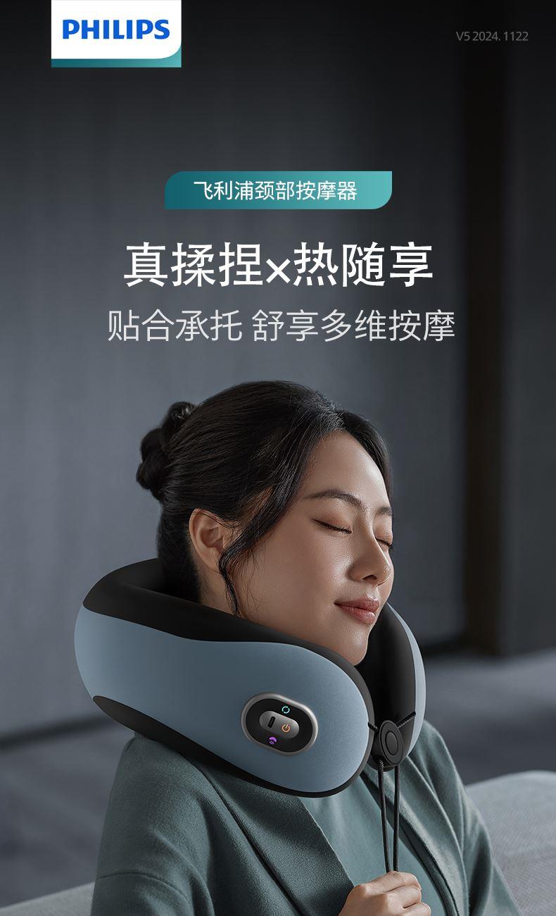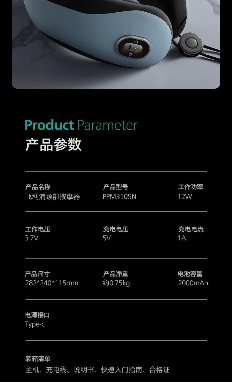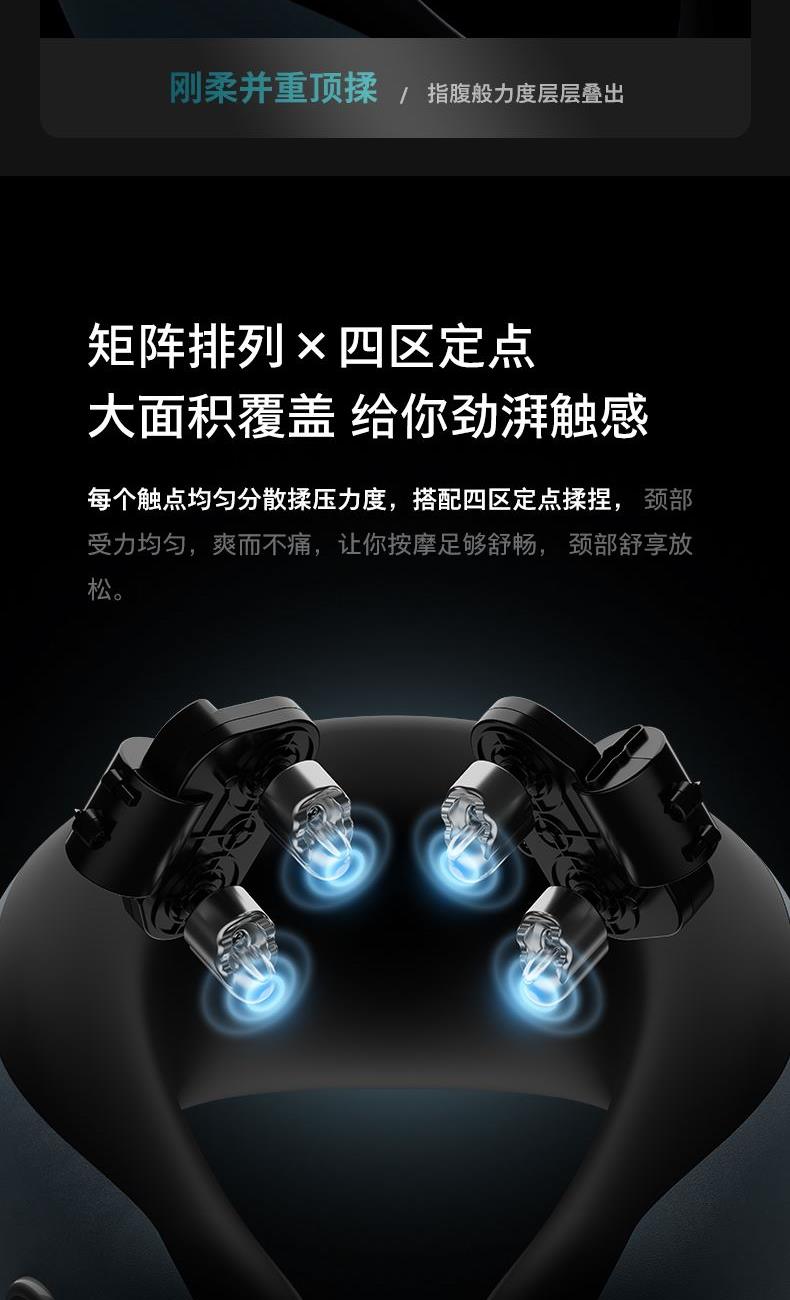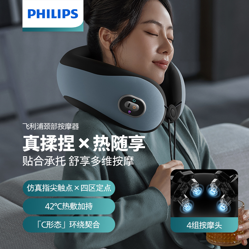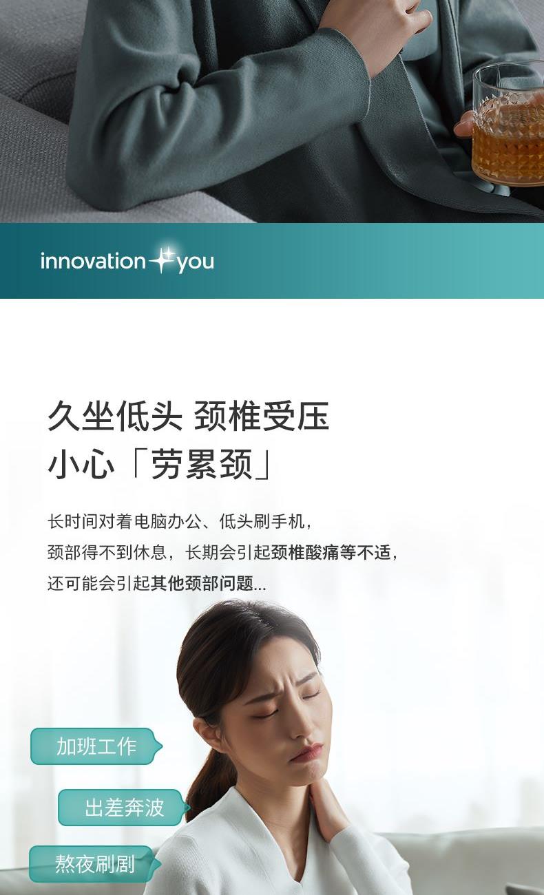 功能:颈部支撑、按摩、热敷 工作电压:3.7V⎓ 工作功率:12W 充电电压:5V⎓ 充电电流:1A 产品尺寸:282*240*115mm 产品净重:约0.75kg 电池容量:2000mAh 续航时间:约90min 包装尺寸:0.75kg 毛重:约1.3kg 产品卖点 1、四组3D按摩头,八字型按摩阵列覆盖颈部 2、42℃热敷加持,温暖轻抚颈部不适 3、C形态云枕设计,360°紧密贴合包裹颈部 4、内填充慢回弹记忆棉,轻盈柔韧有力量 5、手拉带设计可随意调节松紧度
