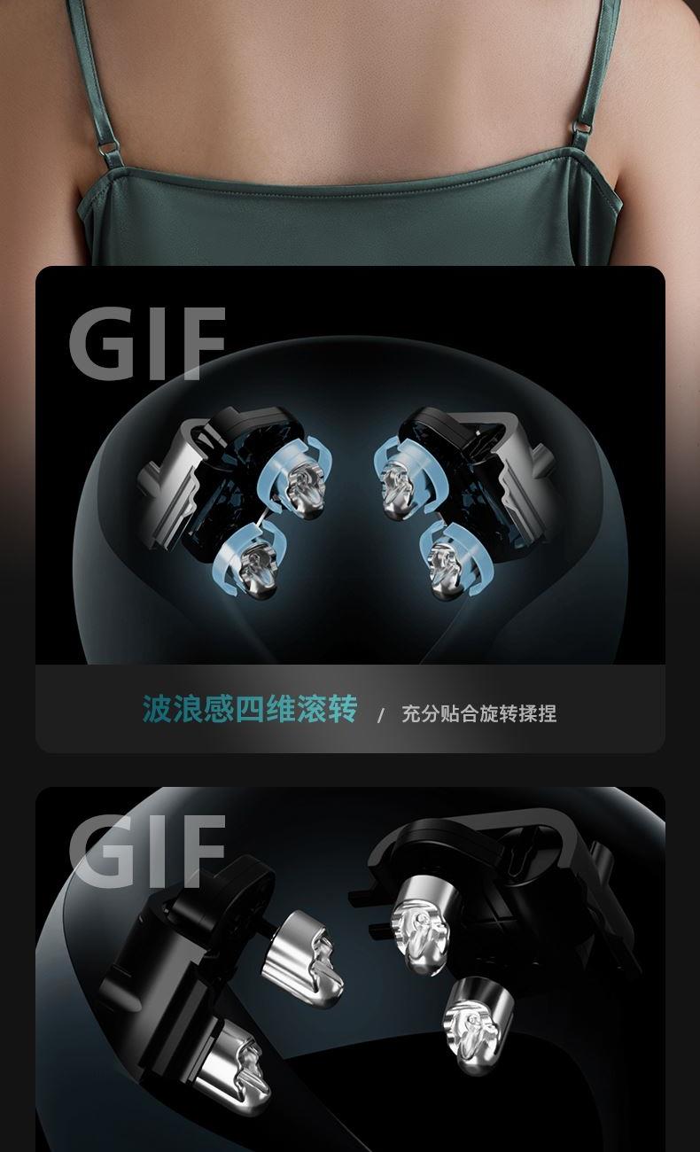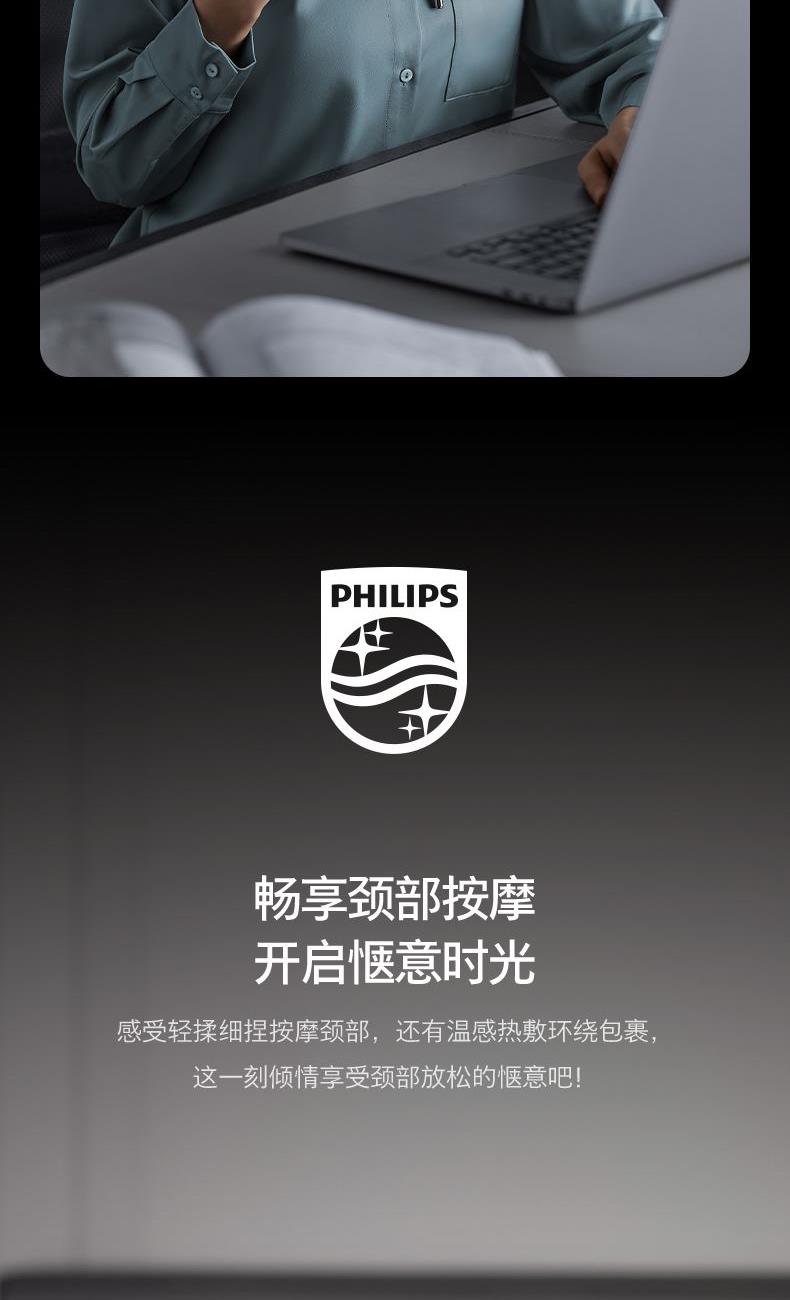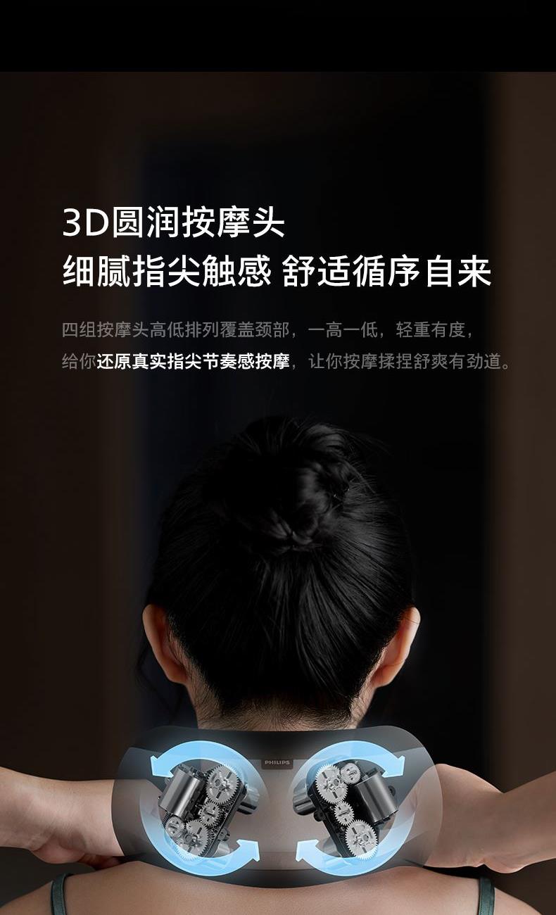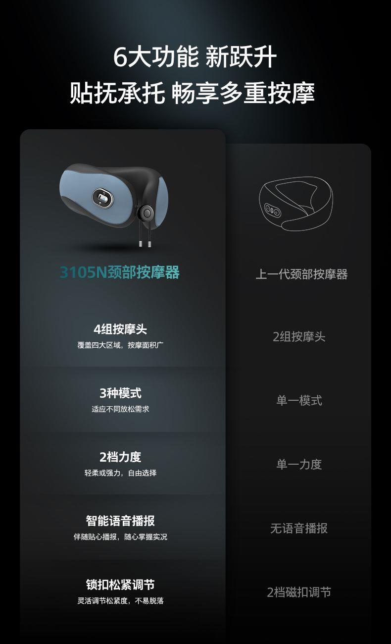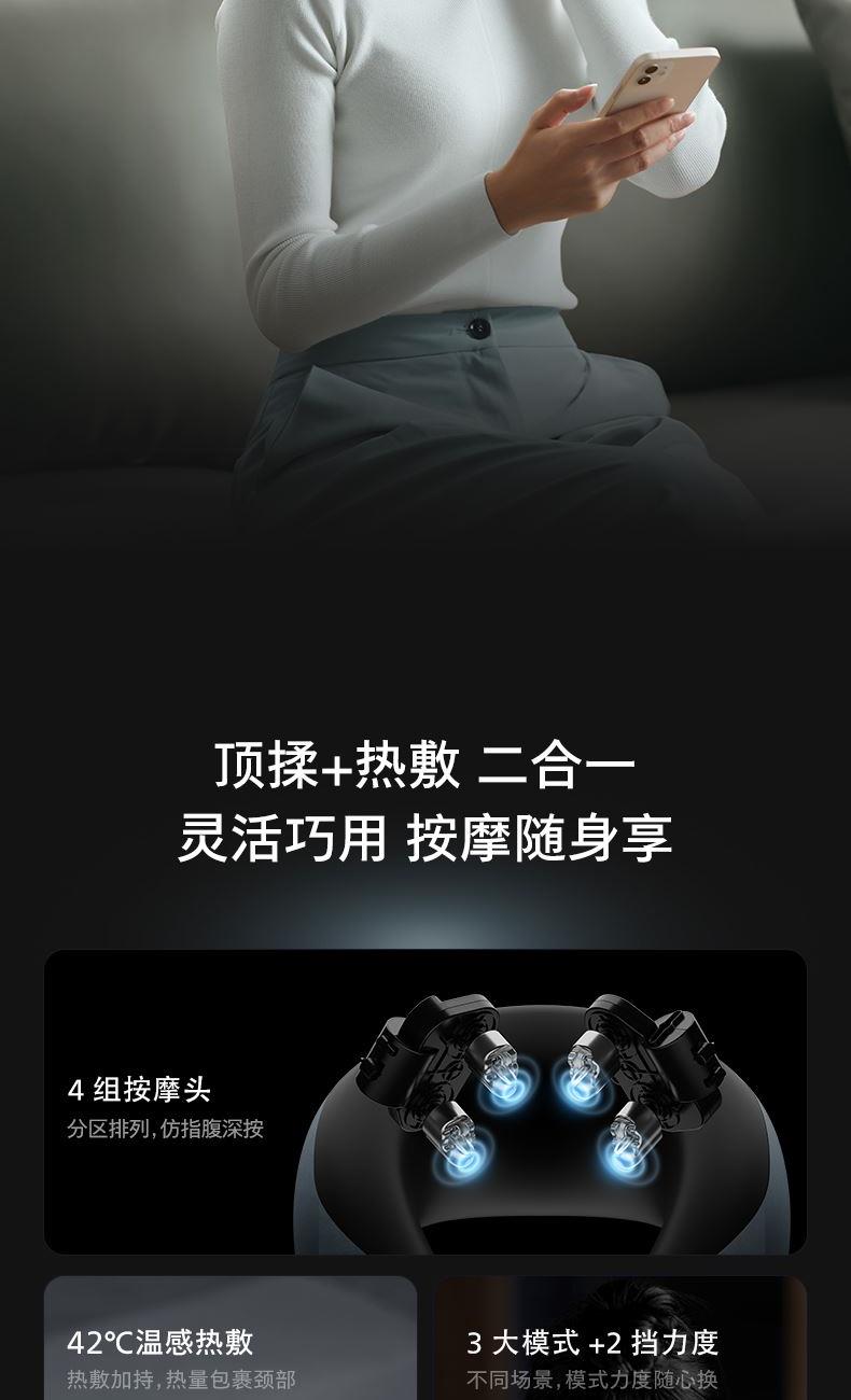 功能:颈部支撑、按摩、热敷 工作电压:3.7V⎓ 工作功率:12W 充电电压:5V⎓ 充电电流:1A 产品尺寸:282*240*115mm 产品净重:约0.75kg 电池容量:2000mAh 续航时间:约90min 包装尺寸:0.75kg 毛重:约1.3kg 产品卖点 1、四组3D按摩头,八字型按摩阵列覆盖颈部 2、42℃热敷加持,温暖轻抚颈部不适 3、C形态云枕设计,360°紧密贴合包裹颈部 4、内填充慢回弹记忆棉,轻盈柔韧有力量 5、手拉带设计可随意调节松紧度