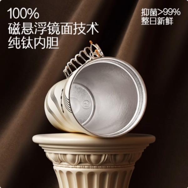 容量:410ml 带吸管内外纯钛双饮咖啡杯 中欧科技艺术融合 抑制细菌、磁悬镜面工艺技术、艺术设计 全球「磁悬镜面工艺」(0.02μm) 发明号CN202510262880.8 我们承诺:坚决不用通过强酸化学反应工艺加工钛杯。
