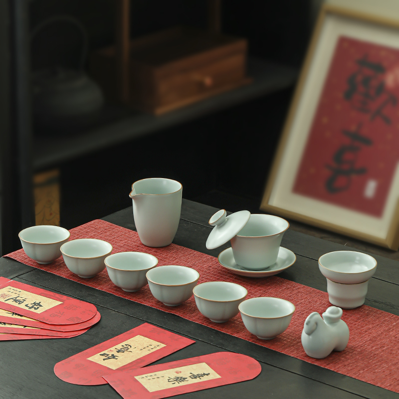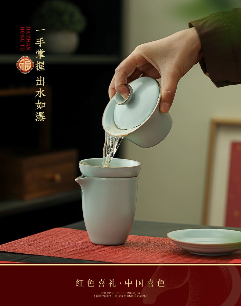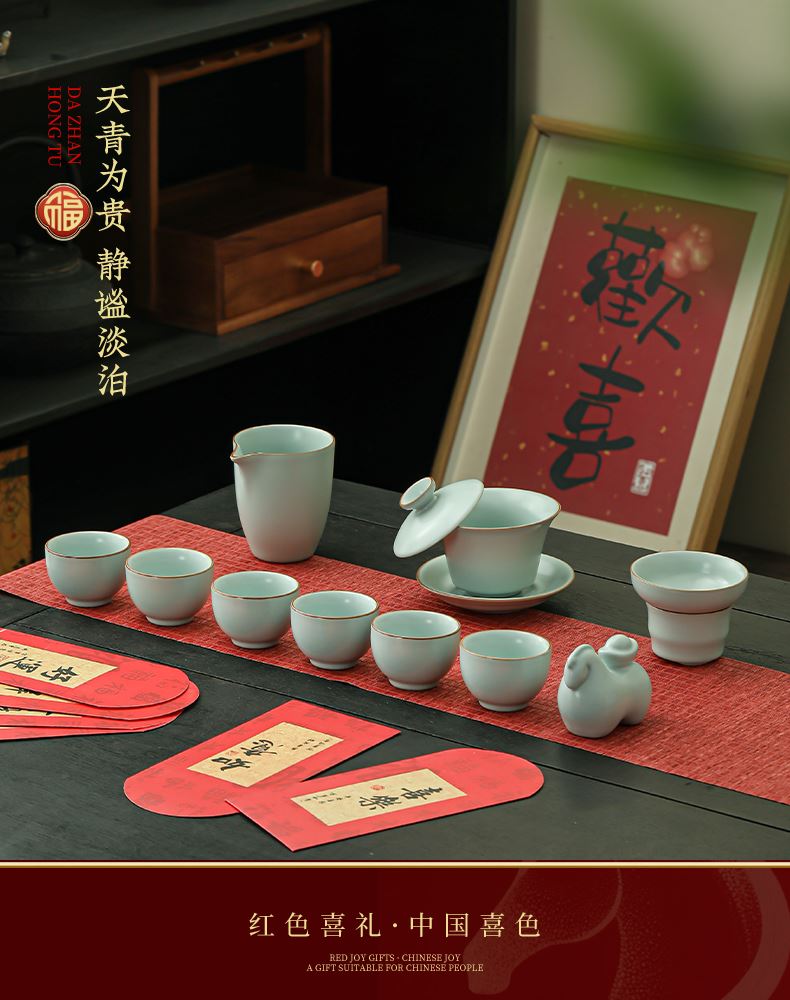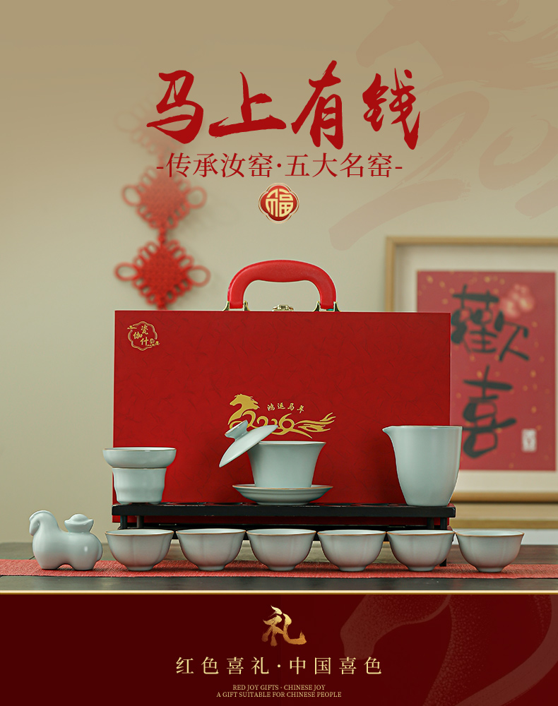 盖碗1:11.2cm*10.6cm 170ml 茶海1:8.7cm*8.7cm 160ml 茶杯6:7.2cm*4.6cm 48ml 茶漏1:8cm*6.4cm 马上有钱茶宠1:8cm*4.cm5*6.4cm 礼盒1:38cm*25.5cm*12cm 严选泥料经数十道工序,三次施釉,两道窑烧,大器天成 外壁玛瑙入釉,蕴润柔和,如脂似玉,肥厚莹润。 禅意开片,茶养金线,开片成画,承载岁月诗情。 马上有钱 摆件、盖置两用,萌宠有趣,寓意吉祥美好。 红色喜庆礼盒设计,寄托美好祝福,送礼佳品。