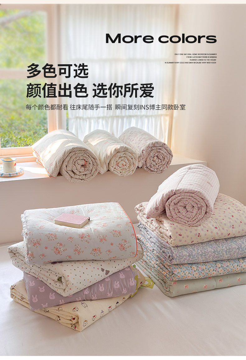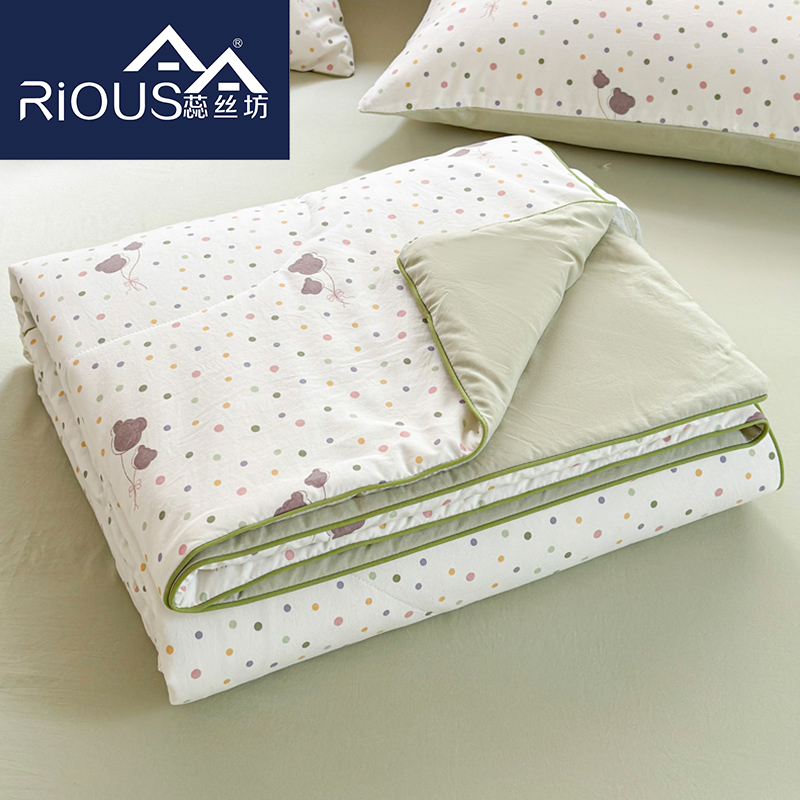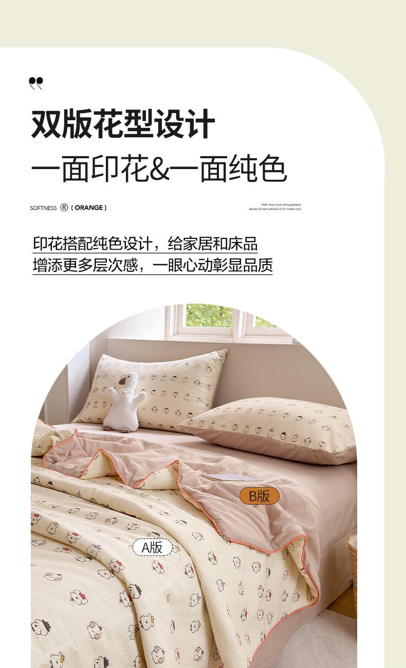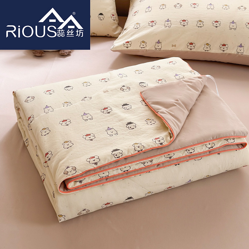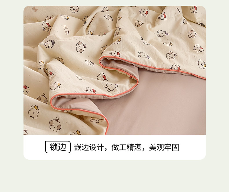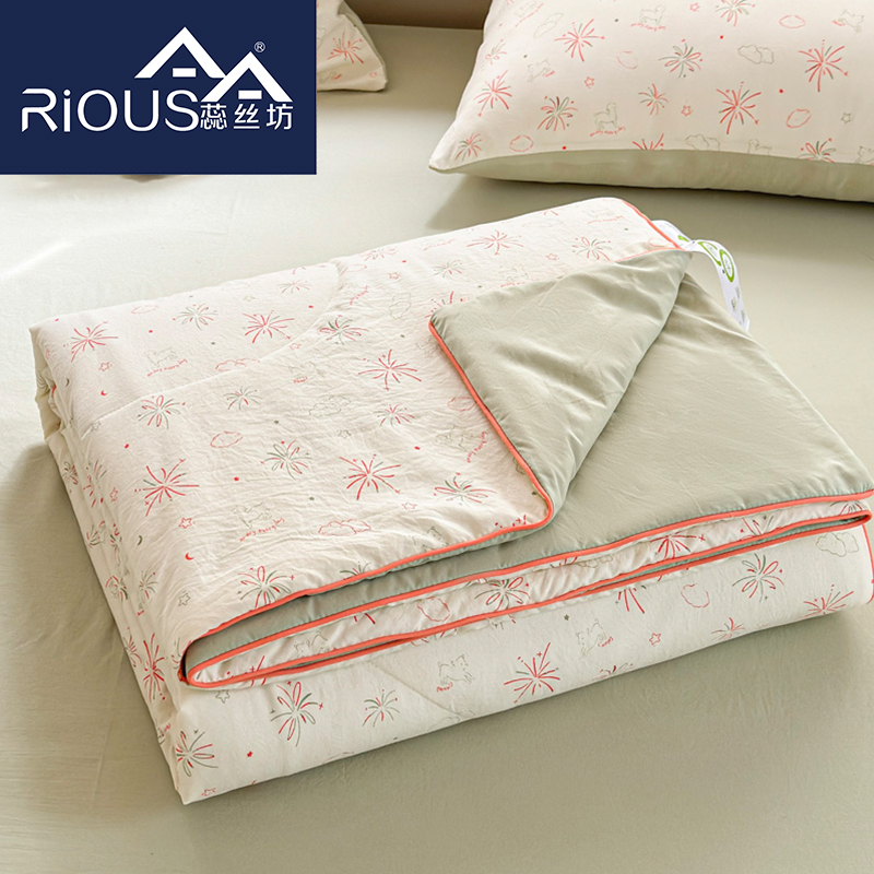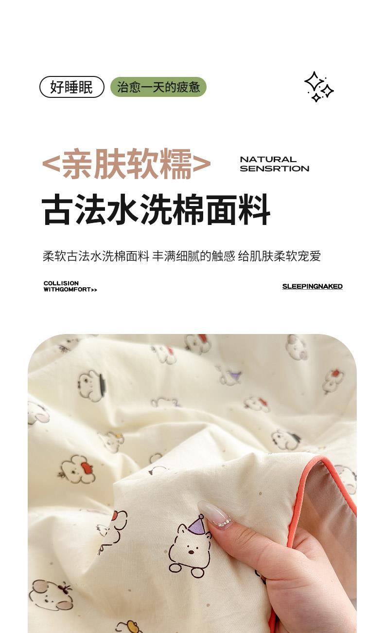 规格:150*200cm 面料:古法水洗棉/聚酯纤维 填充:整张羽丝棉/聚酯纤维 花型:百变狗、爆汁樱桃、波点熊、呆萌兔、花的芳香、花影、曼紫、梦中情兔、莫奈花园、小马哒哒、寻花、烟花秀 古法水洗棉面料,仿全棉的软糯触感,柔软蓬松,像云朵裹身,亲肤不扎身;清新颜值拉满,适配各种卧室风格;易打理不费心,抗皱、不起球、不跑棉,直接机洗不变形、不褪色,懒人友好。