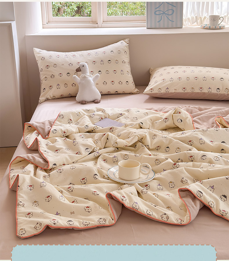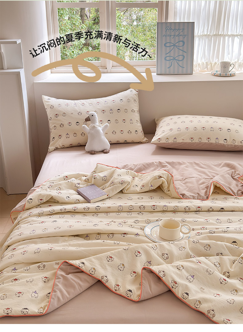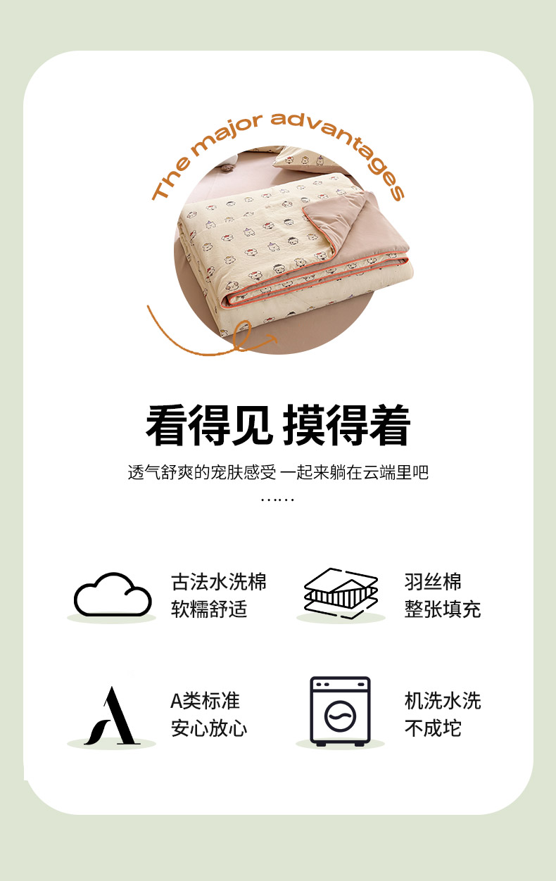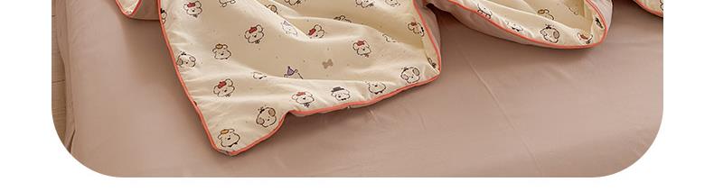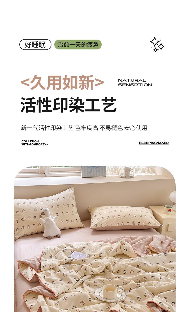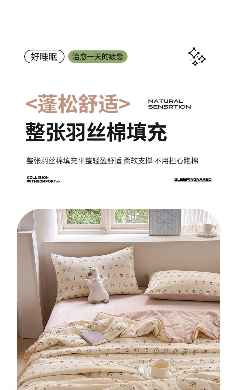 规格:150*200cm 面料:古法水洗棉/聚酯纤维 填充:整张羽丝棉/聚酯纤维 花型:百变狗、爆汁樱桃、波点熊、呆萌兔、花的芳香、花影、曼紫、梦中情兔、莫奈花园、小马哒哒、寻花、烟花秀 古法水洗棉面料,仿全棉的软糯触感,柔软蓬松,像云朵裹身,亲肤不扎身;清新颜值拉满,适配各种卧室风格;易打理不费心,抗皱、不起球、不跑棉,直接机洗不变形、不褪色,懒人友好。