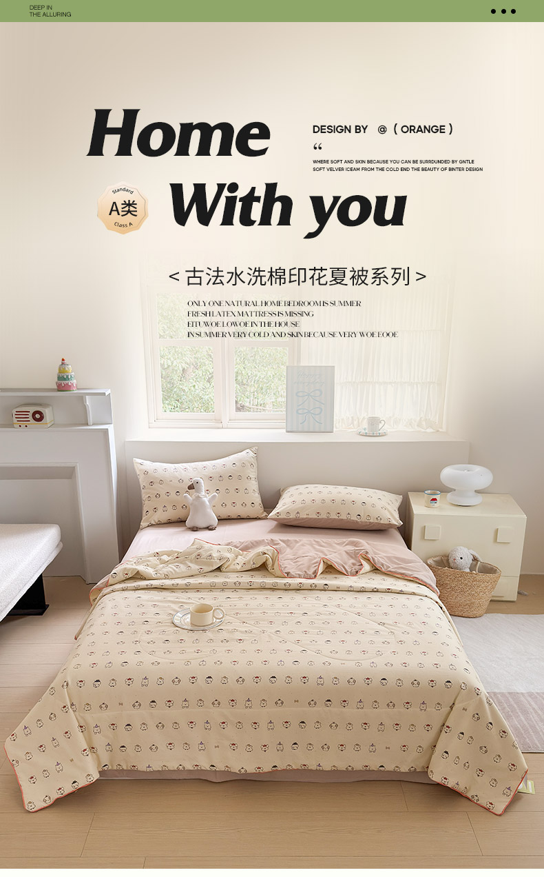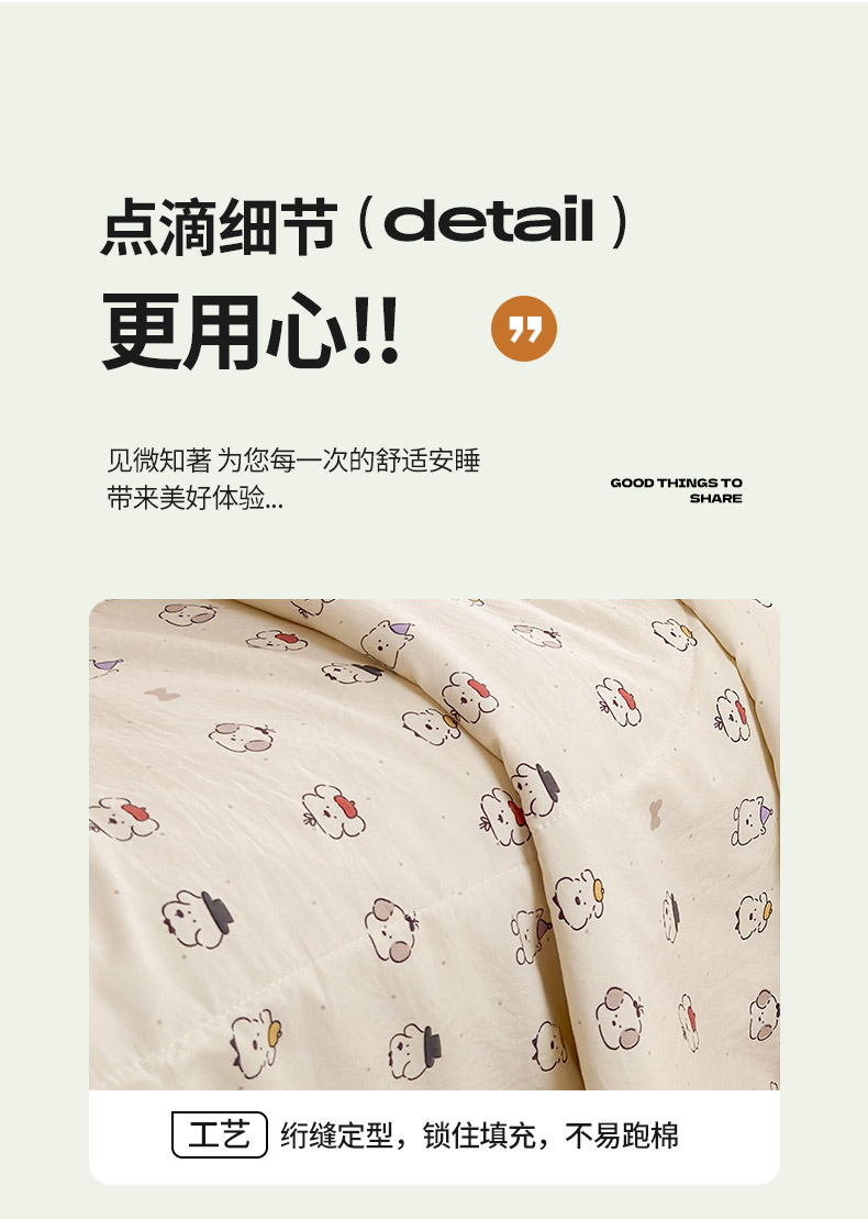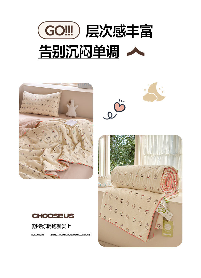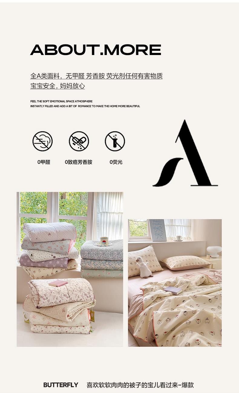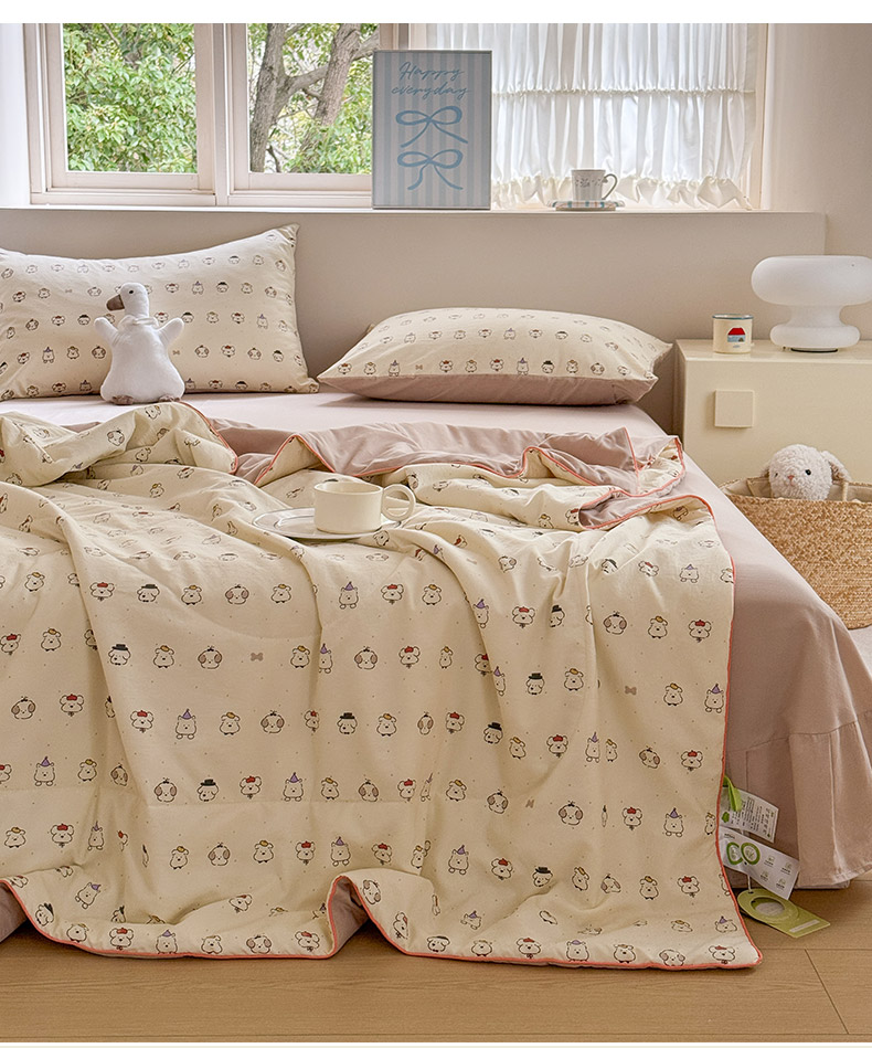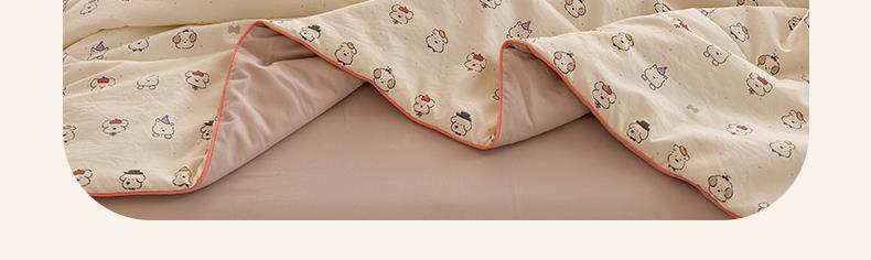 规格:150*200cm 面料:古法水洗棉/聚酯纤维 填充:整张羽丝棉/聚酯纤维 花型:百变狗、爆汁樱桃、波点熊、呆萌兔、花的芳香、花影、曼紫、梦中情兔、莫奈花园、小马哒哒、寻花、烟花秀 古法水洗棉面料,仿全棉的软糯触感,柔软蓬松,像云朵裹身,亲肤不扎身;清新颜值拉满,适配各种卧室风格;易打理不费心,抗皱、不起球、不跑棉,直接机洗不变形、不褪色,懒人友好。