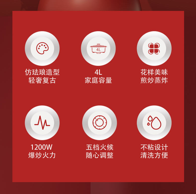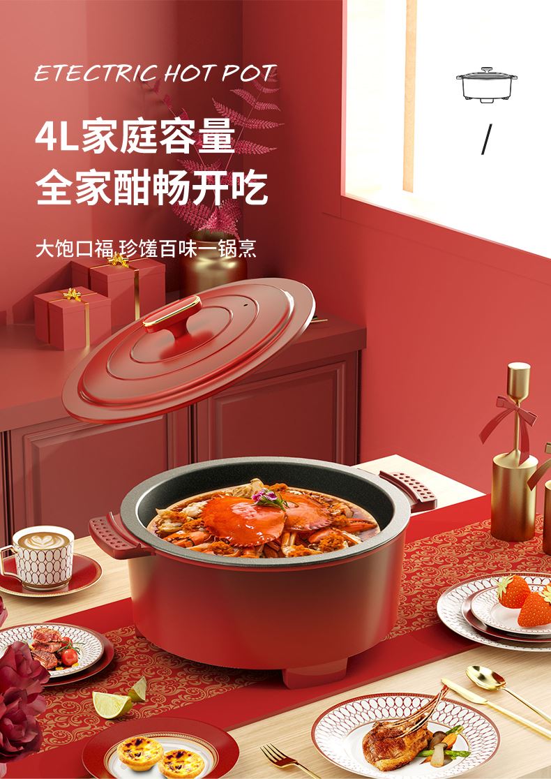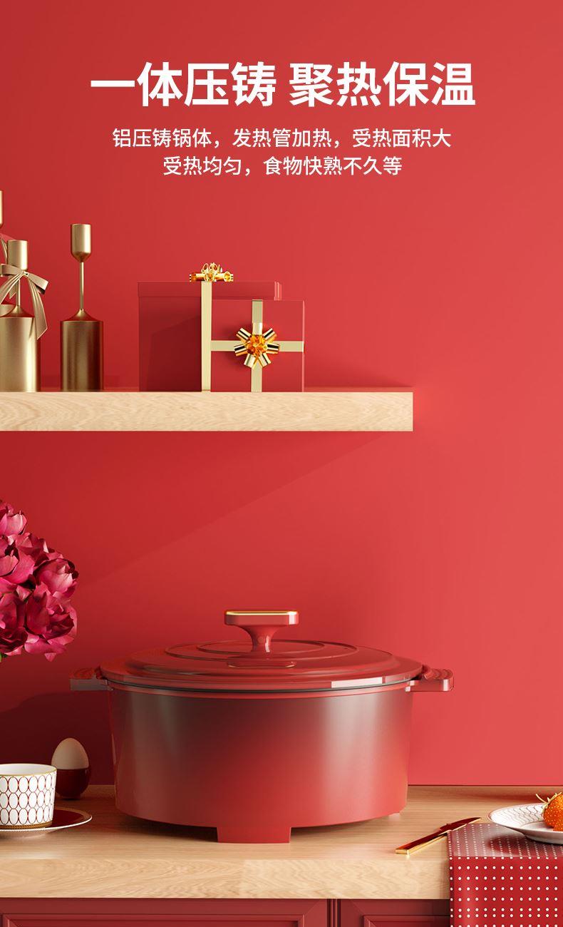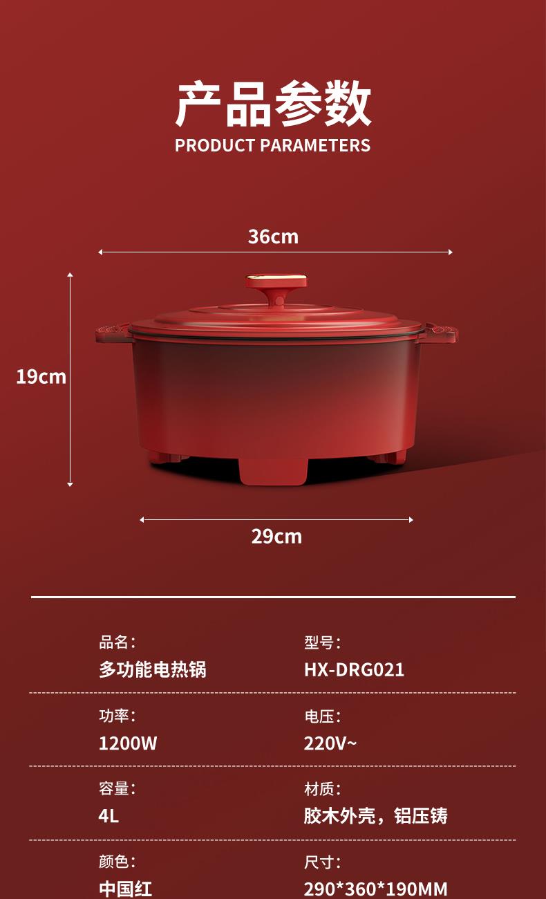 额定功率:1200W 额定电压:220V/50HZ 额定容量:4L 产品净重/毛重:2.42㎏/2.96㎏ 产品材质:胶木外壳,铝压铸锅体 产品颜色:中国红 产品规格:290*360*190mm 彩盒尺寸:342*175*350mm 外箱尺寸:695*355*575mm 多档调温,一体压铸成型锅体,可煎烤、可火锅、可焖煮、可煲炖,一锅多用。 盖内多个圆珠设计,防蒸汽滴漏,营养不流失。 中国红外观配立体环形锅盖,时尚典雅。