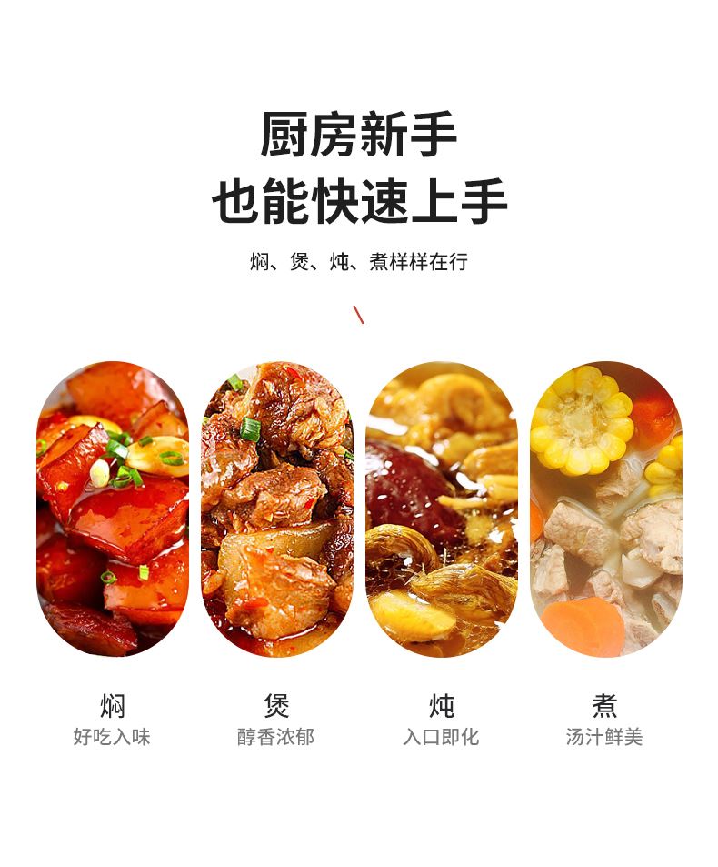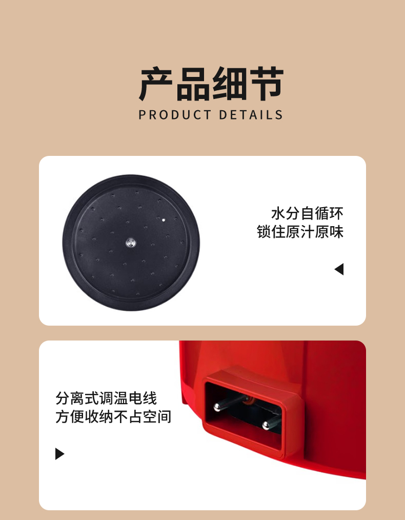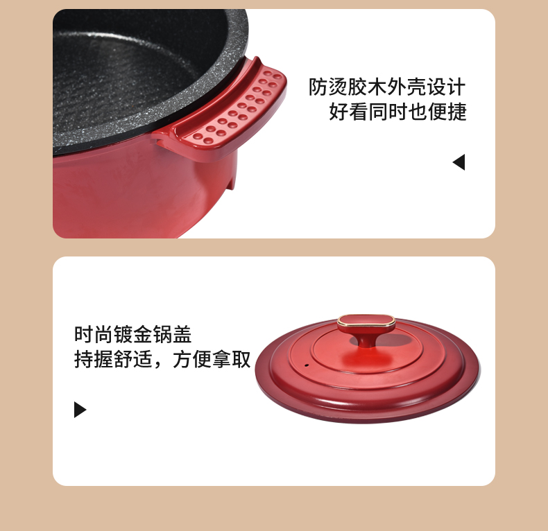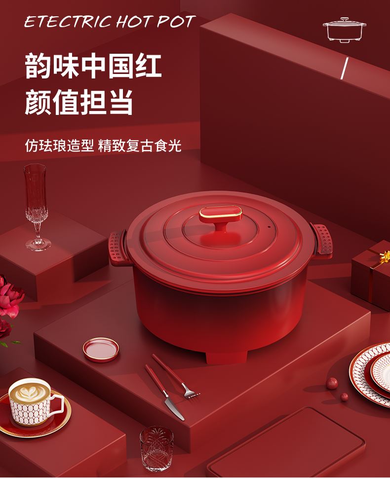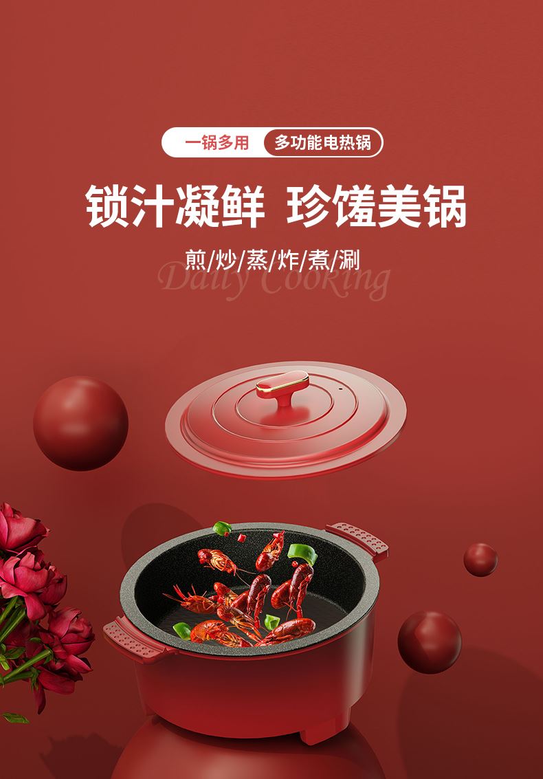 额定功率:1200W 额定电压:220V/50HZ 额定容量:4L 产品净重/毛重:2.42㎏/2.96㎏ 产品材质:胶木外壳,铝压铸锅体 产品颜色:中国红 产品规格:290*360*190mm 彩盒尺寸:342*175*350mm 外箱尺寸:695*355*575mm 多档调温,一体压铸成型锅体,可煎烤、可火锅、可焖煮、可煲炖,一锅多用。 盖内多个圆珠设计,防蒸汽滴漏,营养不流失。 中国红外观配立体环形锅盖,时尚典雅。