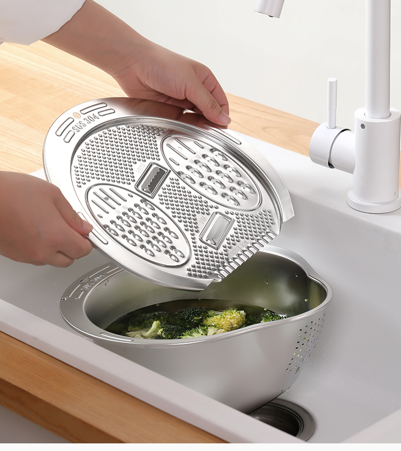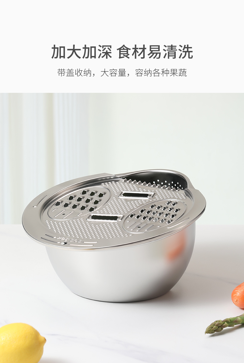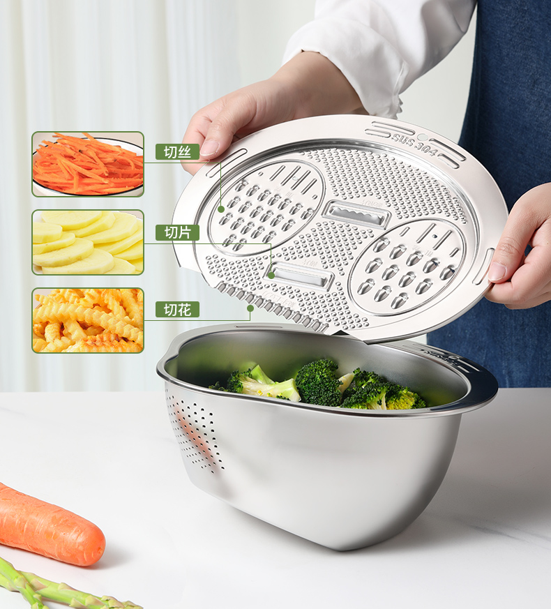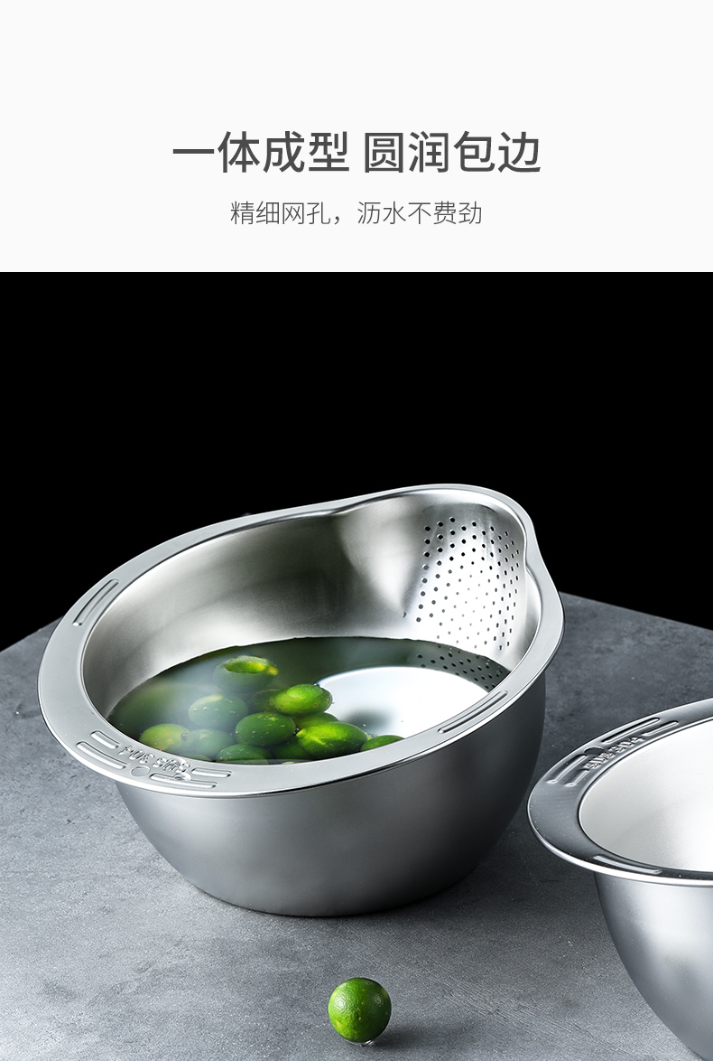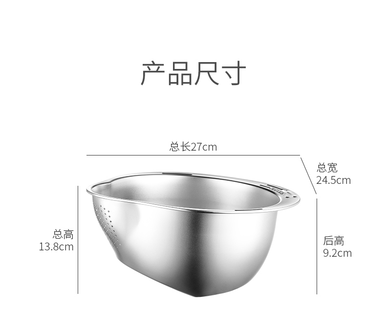 产品型号 :SG-LSP024 产品规格 :24CM 产品材质 :304不锈钢 彩盒尺寸 :250*125*250MM 采用国际标准不锈钢板材,新型倾斜设计,造型美观,一盆多用。 一体成型技术,精细网孔,圆弧包边,光滑舒适,方便拿取。 斜壁可沥水,盆底可搓米,轻微倾斜,即可轻松沥水。 洗菜切菜收纳三合一,轻松切片,轻轻倾斜,即可清洗沥水。 大容量收纳盆,一次备完所有菜,切菜随心所欲,不担心满溢出来。