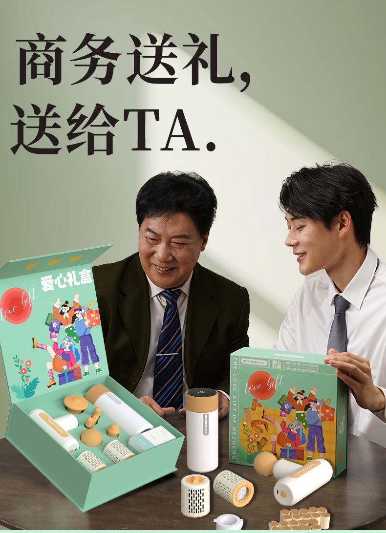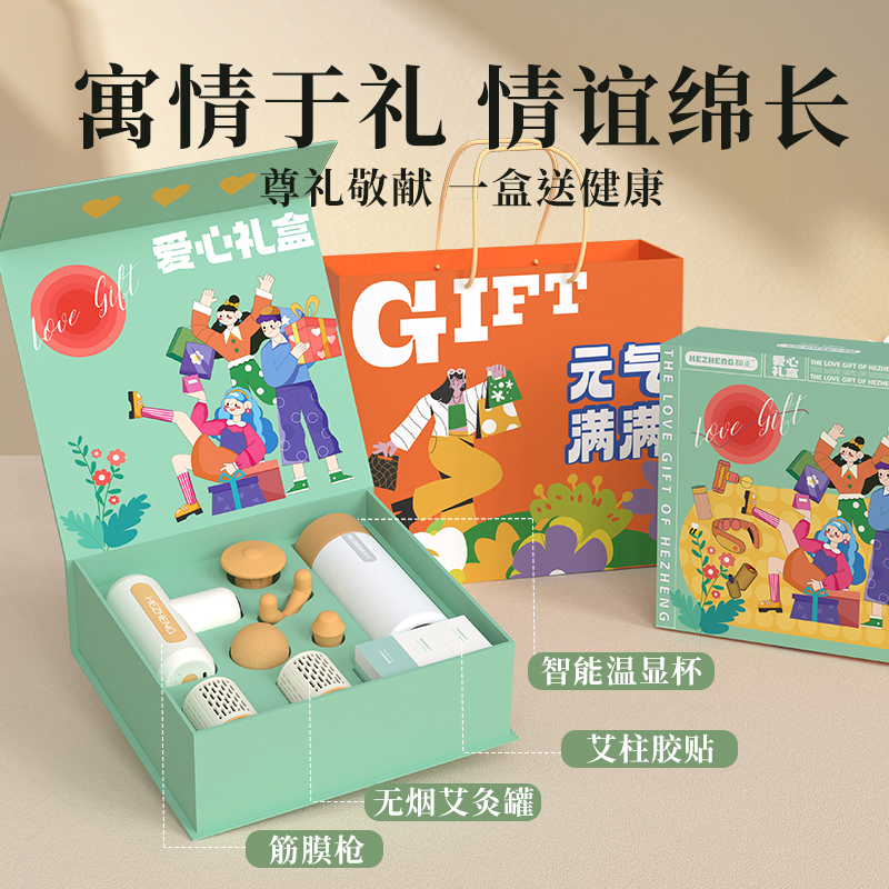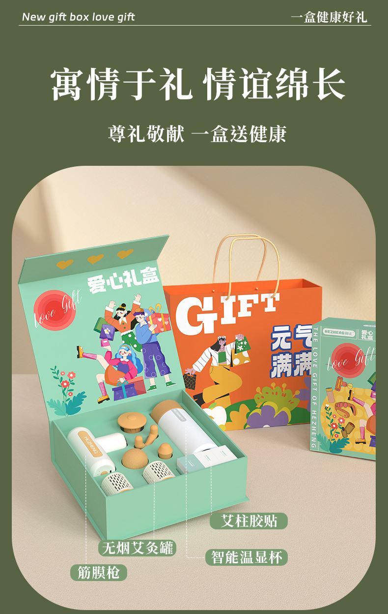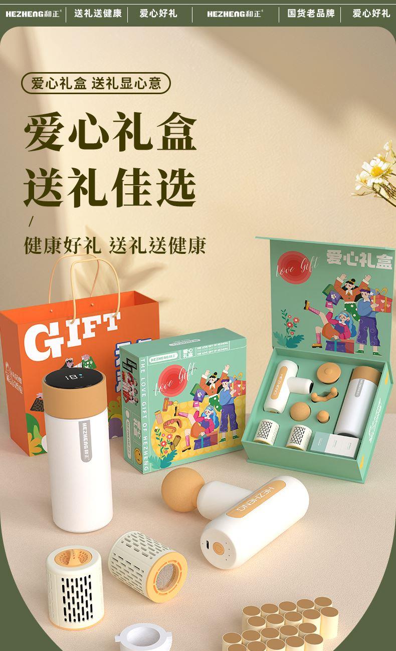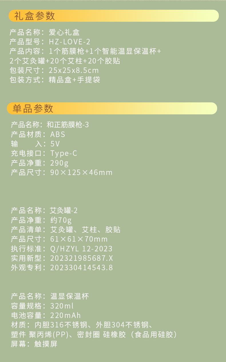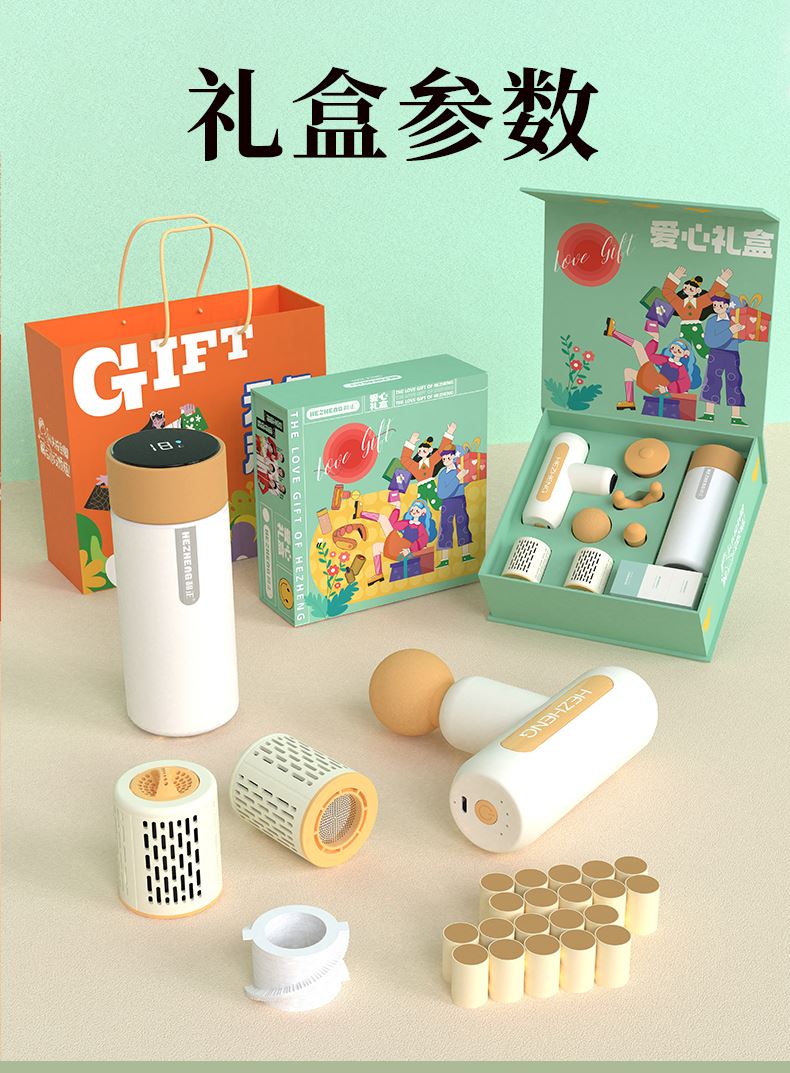 产品内容: 1个筋膜枪+1个智能温显保温杯+ 2个艾灸罐+20个艾柱+20个胶贴 包装尺寸:25x25x8.5cm 69码:6921311513369 包装方式:精品盒+手提袋 筋膜枪HZ-JMQ-3 产品材质:ABS 电池容量:1600mAh 分贝:60 档 位:4档调节 转 速:1100-2600转/分 按摩头:球形头/Y形头/T形头/子弹头