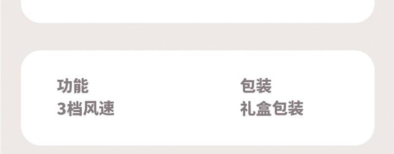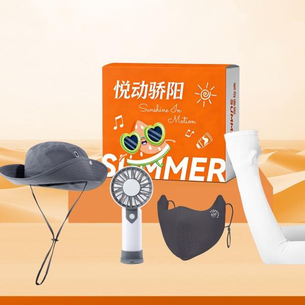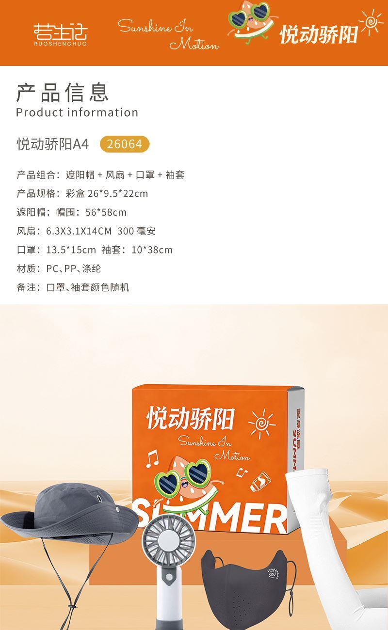 产品组合:遮阳帽+风扇+口罩+袖套 遮阳帽:帽围:56*58cm 风扇:6.3X3.1X14CM 300毫安 口罩:13.5*15cm 袖套: 10*38cm 材质:PC、PP、涤纶 包装:彩盒 备注:口罩、袖套颜色随机