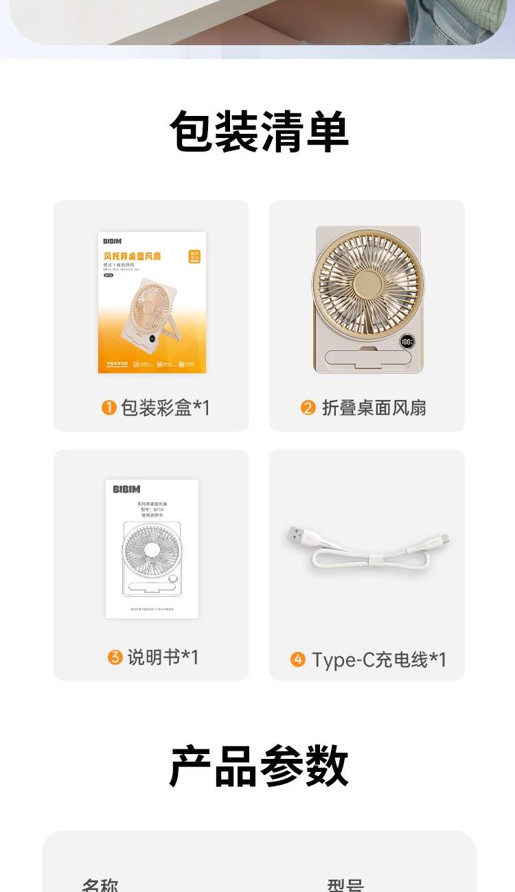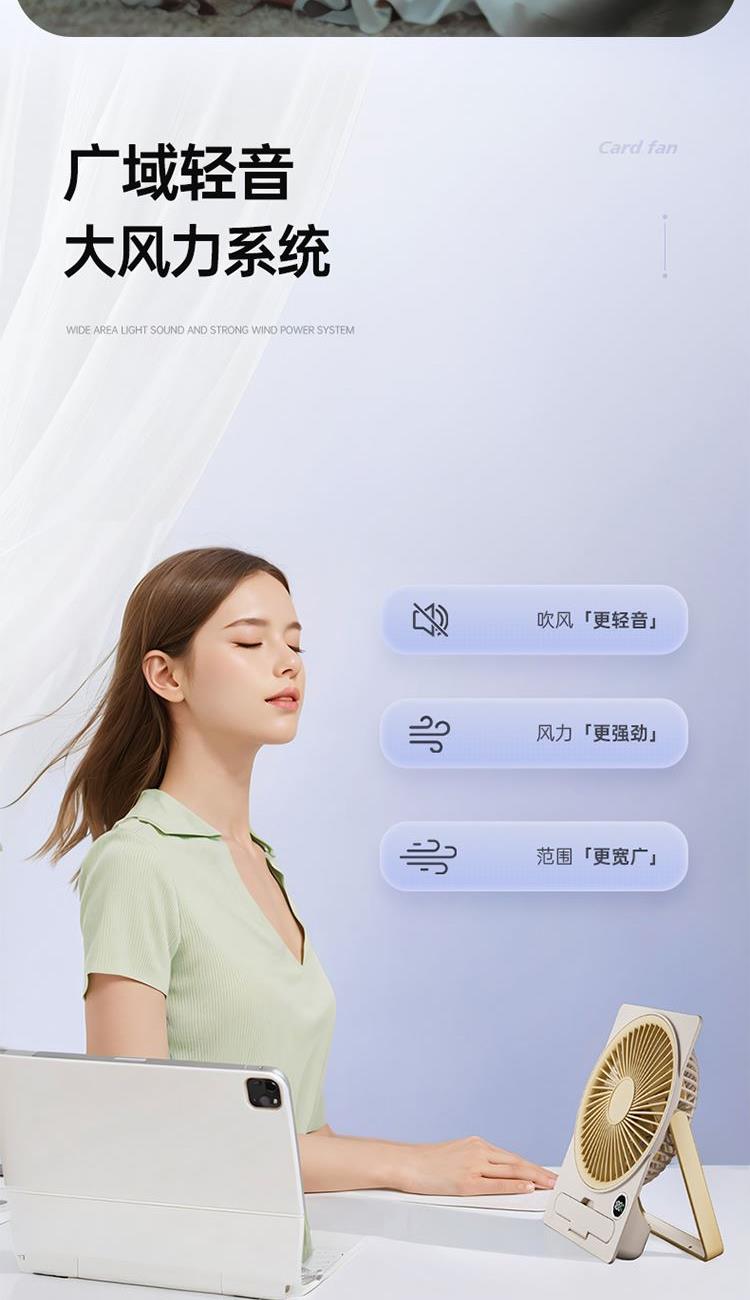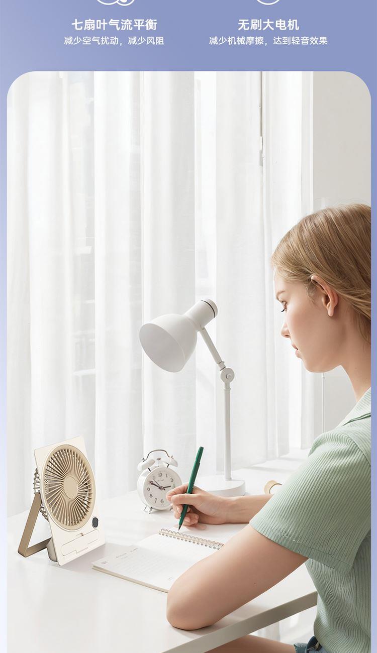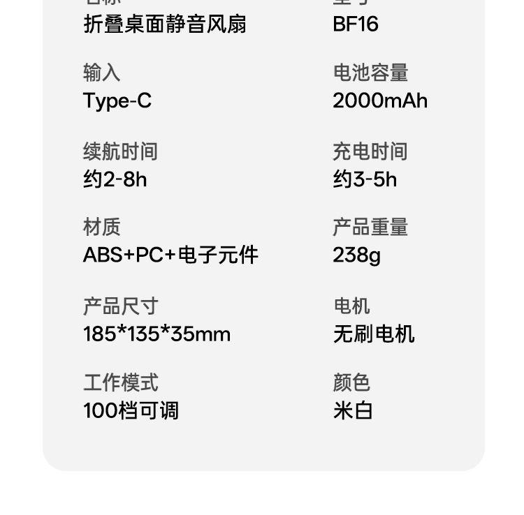 电池容量:1800mAh 产品尺寸:18.5*13.5*3.5mm 包装尺寸:外箱尺寸:59*45*45CM产品重量: 净重238g 电机:无刷电机 功率:3.5W 续航时间:约2-8h充电时间:约3-5h颜色:米白 材质:ABS+PP+电子元器件 静音无刷电机,搭配1800mAh电池,超长续航,桌面壁挂多场景使用,带支架功能, 超薄尺寸,方便收纳,高清数显,档位点量一目了然 100档可调风力满足不同需求,带多角度调节支架,TYPE-C接口快速充电
