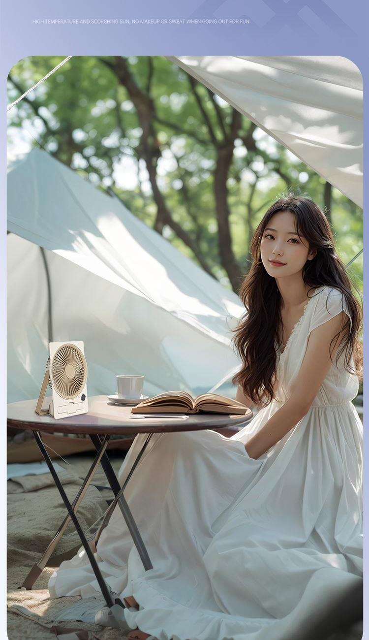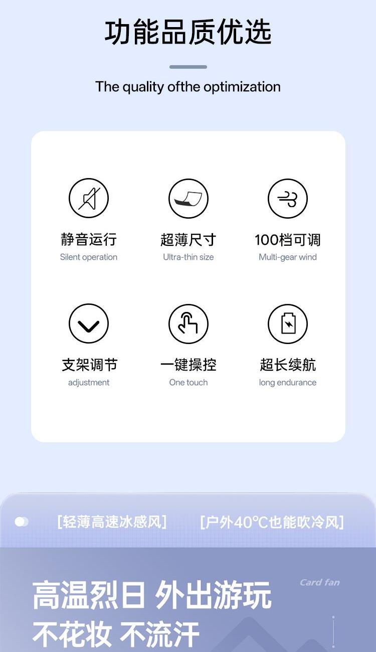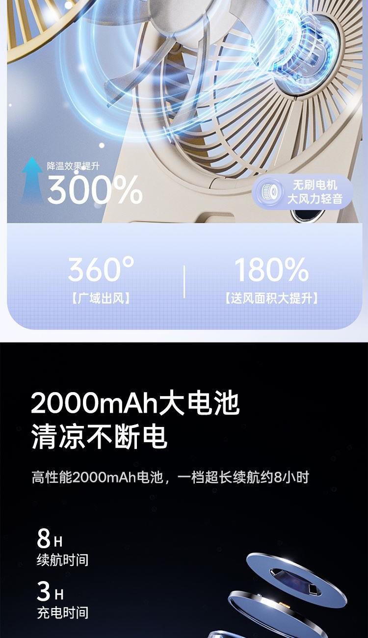 电池容量:1800mAh 产品尺寸:18.5*13.5*3.5mm 包装尺寸:外箱尺寸:59*45*45CM产品重量: 净重238g 电机:无刷电机 功率:3.5W 续航时间:约2-8h充电时间:约3-5h颜色:米白 材质:ABS+PP+电子元器件 静音无刷电机,搭配1800mAh电池,超长续航,桌面壁挂多场景使用,带支架功能, 超薄尺寸,方便收纳,高清数显,档位点量一目了然 100档可调风力满足不同需求,带多角度调节支架,TYPE-C接口快速充电