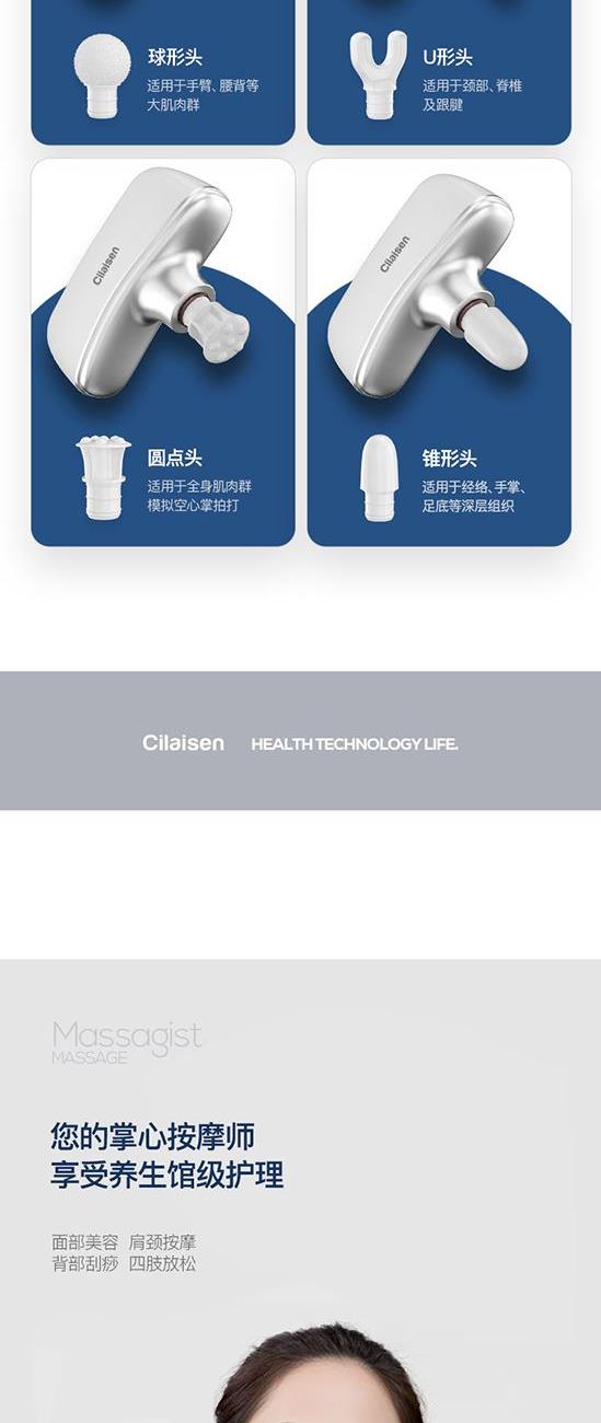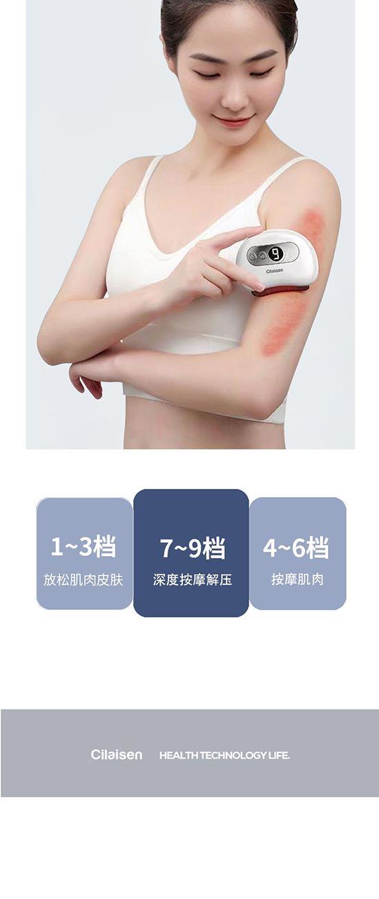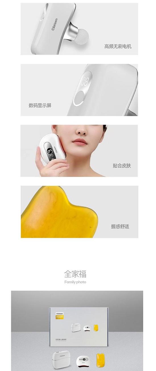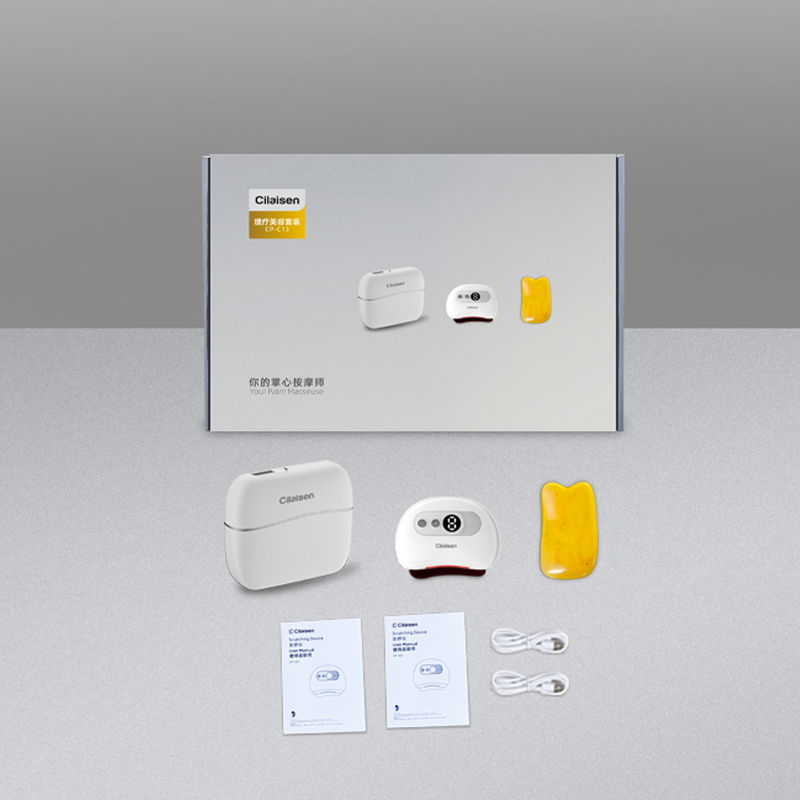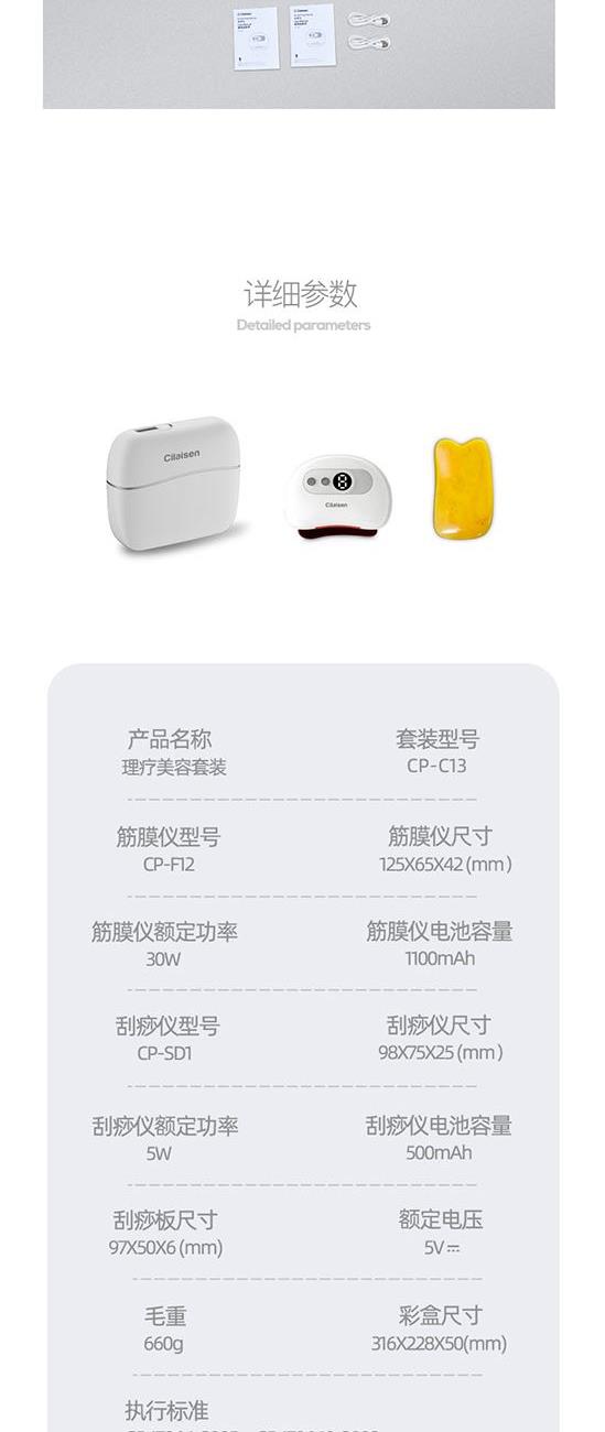 产品参数: 套装型号:CP-C13 商品条码 : 6972831861034 筋膜枪型号:CP-F12 筋膜枪尺寸:125x65x42mm 筋膜枪额定功率:30W 筋膜枪电池容量 : 1100mAh 刮痧仪型号:CP-SD1 刮痧仪尺寸:98x75x25mm 刮痧仪额定功率:5W 刮痧仪电池容量:500mAh 额定电压:5V⎓ 刮痧板尺寸:97x50x6mm 产品毛重:660g 彩盒尺寸:316x228x50mm 装 箱 数 : 20pcs 外箱尺寸:652X476X275mm 包装清单:筋膜枪X1、刮痧仪X1、刮痧板X1、充电线X2、说明书X1 核心卖点: 1、筋膜枪:10档力度调节、一体化设计、持久续航、高效电池 ,安全便携小机身大动力、4款个性化按摩头、小巧不占地,轻松放进口袋、背包 2、刮痧仪:面部美容、肩颈按摩、背部刮痧、四肢放松;9档调节,恒温发热 释放砭石微量元素,深层养护;高频微震动,按摩放松; 3、刮痧板:蜜蜡刮痧板,多种用法 疏通经络;圆润板身,舒适握感 贴合皮肤,一板多用。