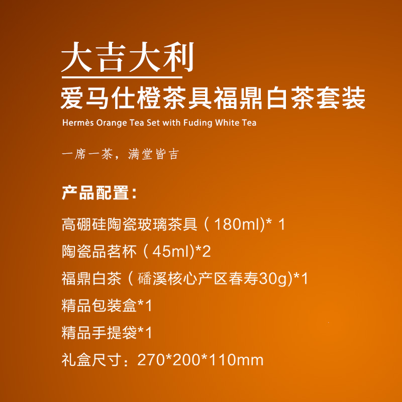 【产品配置】 高硼硅陶瓷玻璃茶具(180ml)*1 陶瓷品茗杯(45ml)*2 福鼎白茶(磻溪核心产区春寿30g)*1 精品包装盒*1 精品手提袋*1 【产品说明】 爱马仕橙外观,礼品视觉吸睛; 福鼎磻溪核心产区春寿白茶,茶品品质上乘; 高硼硅陶瓷玻璃茶具,耐用且泡茶体验佳; “大吉大利”吉祥寓意,开门红送礼讨喜; 精品礼盒+手提袋,包装精致送礼有面。
