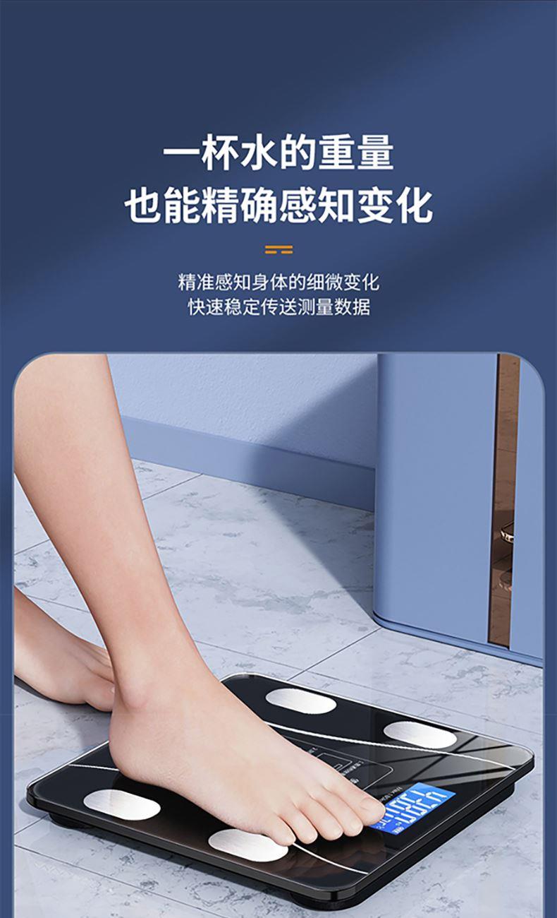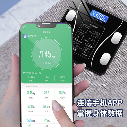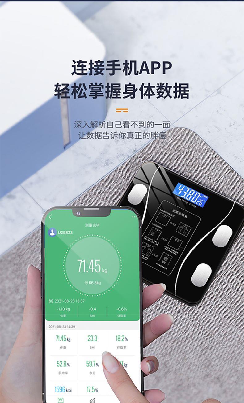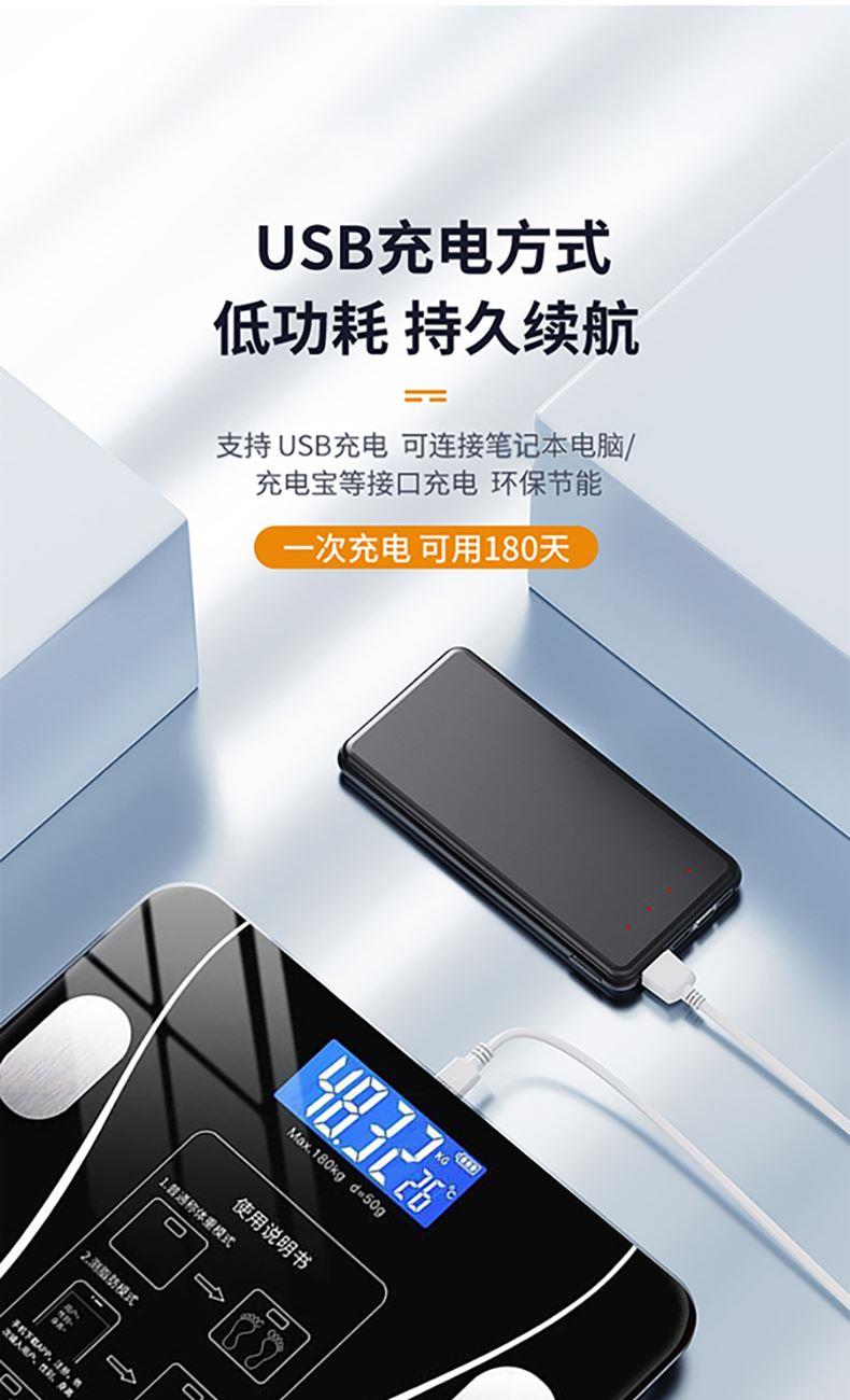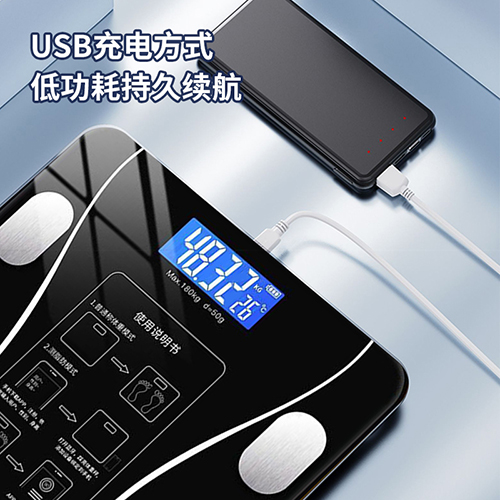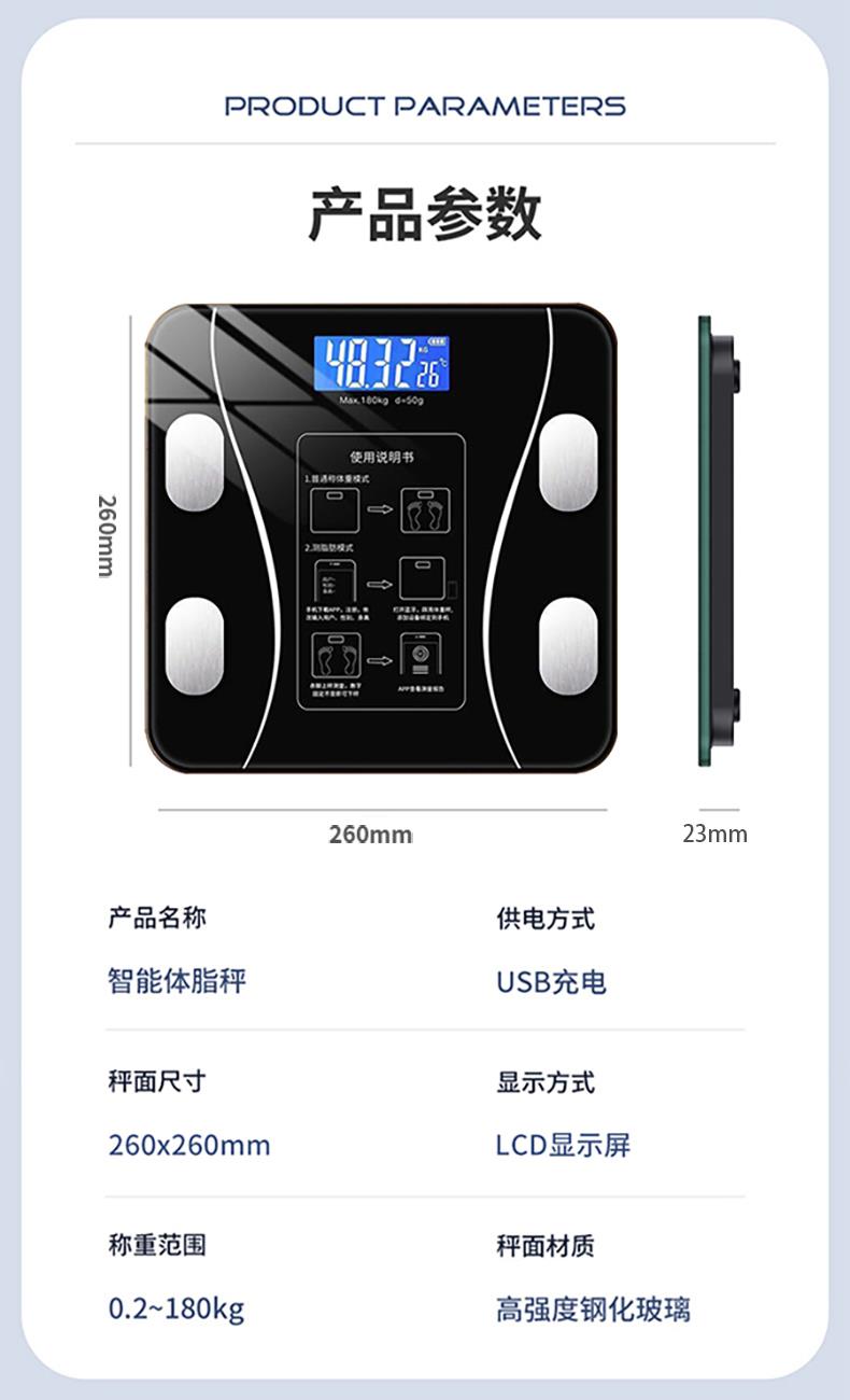 产品材质:钢化玻璃 供电方式:USB充电 产品尺寸:26*26cm 称重范围:0.2~180KG 显示方式:LED显示 单位:KG/斤 彩盒尺寸:29*4.5*29cm 外箱尺寸:53×31×31cm智能体脂秤,您的体脂数据管家; LED大屏蓝膜显示,昼夜皆清晰; 四点式传感器,受力更集中,测量更无误; 连接手机APP,轻松掌握身体数据,确切管理; 钢化玻璃材质,坚固耐用, 200g起称; 可测室温, 预防中暑, 添加衣物;