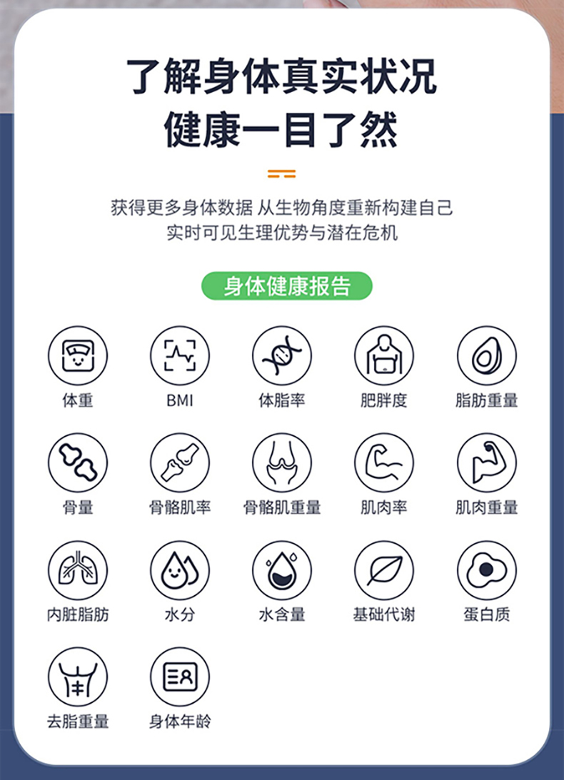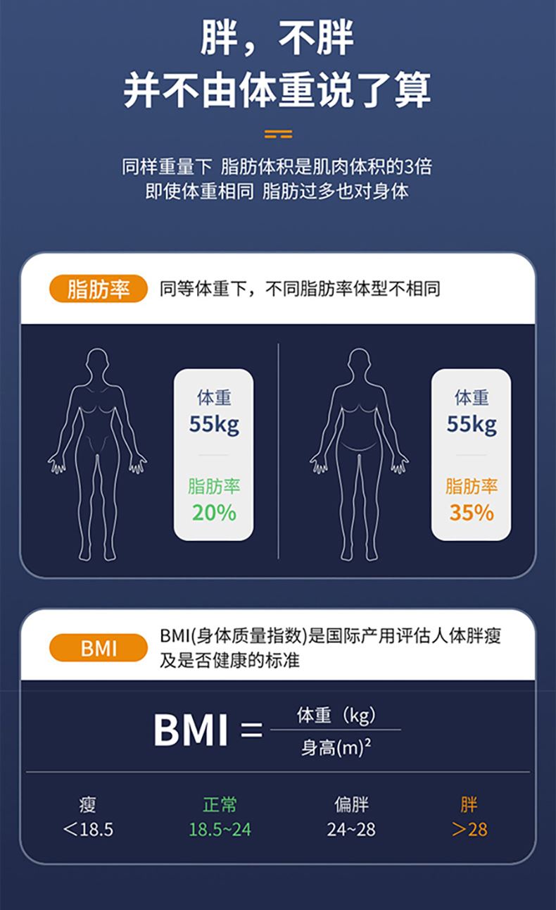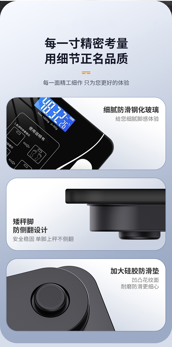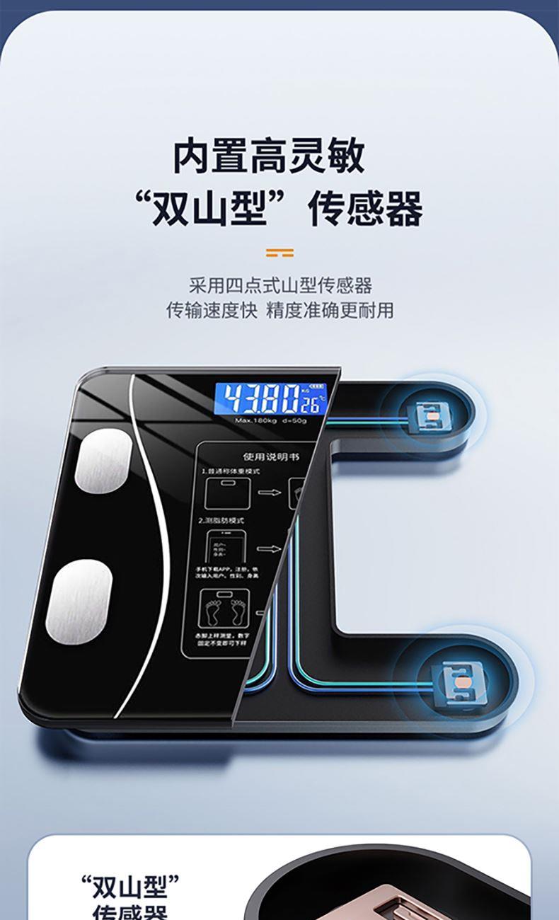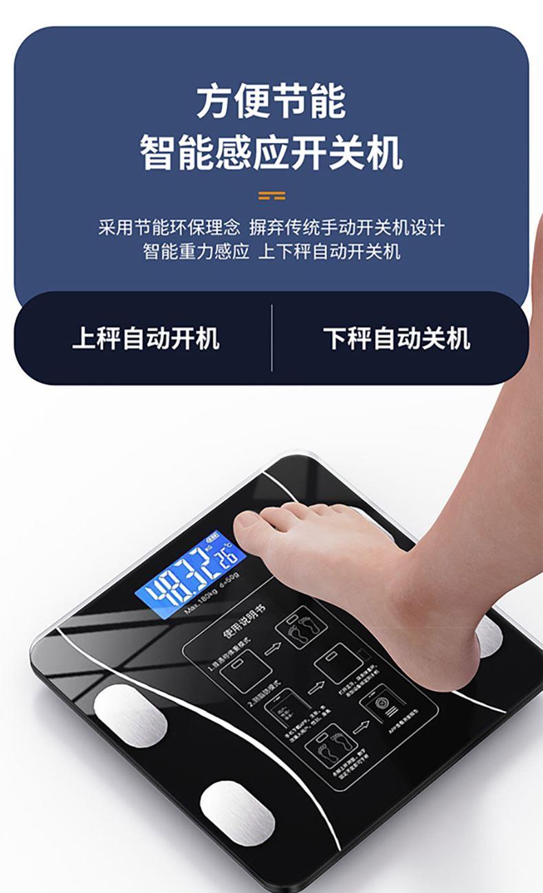 产品材质:钢化玻璃 供电方式:USB充电 产品尺寸:26*26cm 称重范围:0.2~180KG 显示方式:LED显示 单位:KG/斤 彩盒尺寸:29*4.5*29cm 外箱尺寸:53×31×31cm智能体脂秤,您的体脂数据管家; LED大屏蓝膜显示,昼夜皆清晰; 四点式传感器,受力更集中,测量更无误; 连接手机APP,轻松掌握身体数据,确切管理; 钢化玻璃材质,坚固耐用, 200g起称; 可测室温, 预防中暑, 添加衣物;