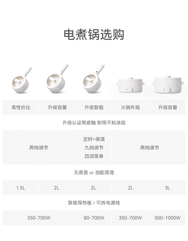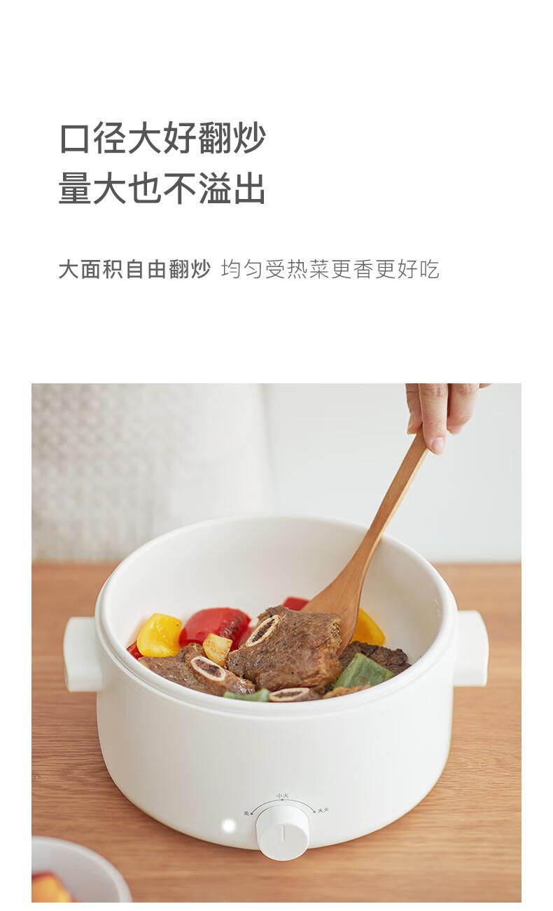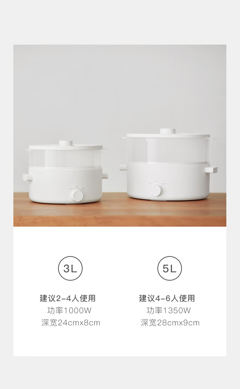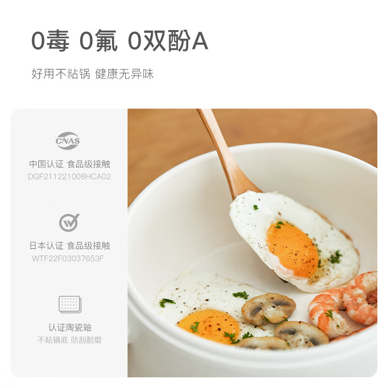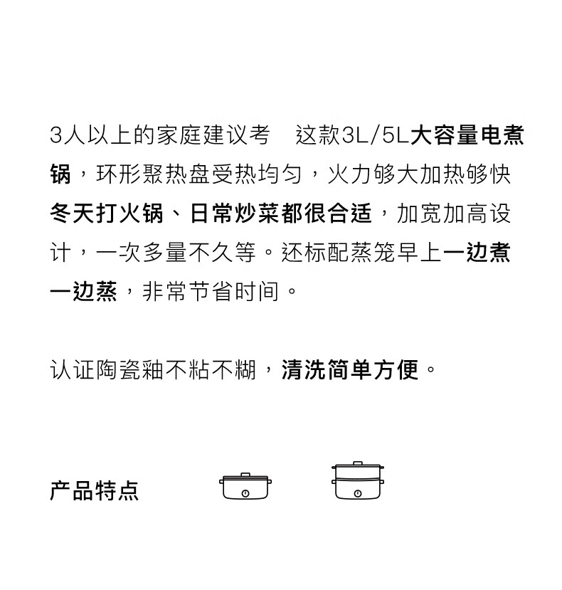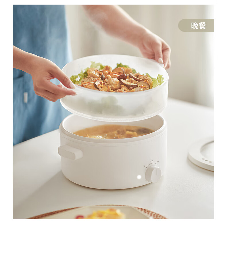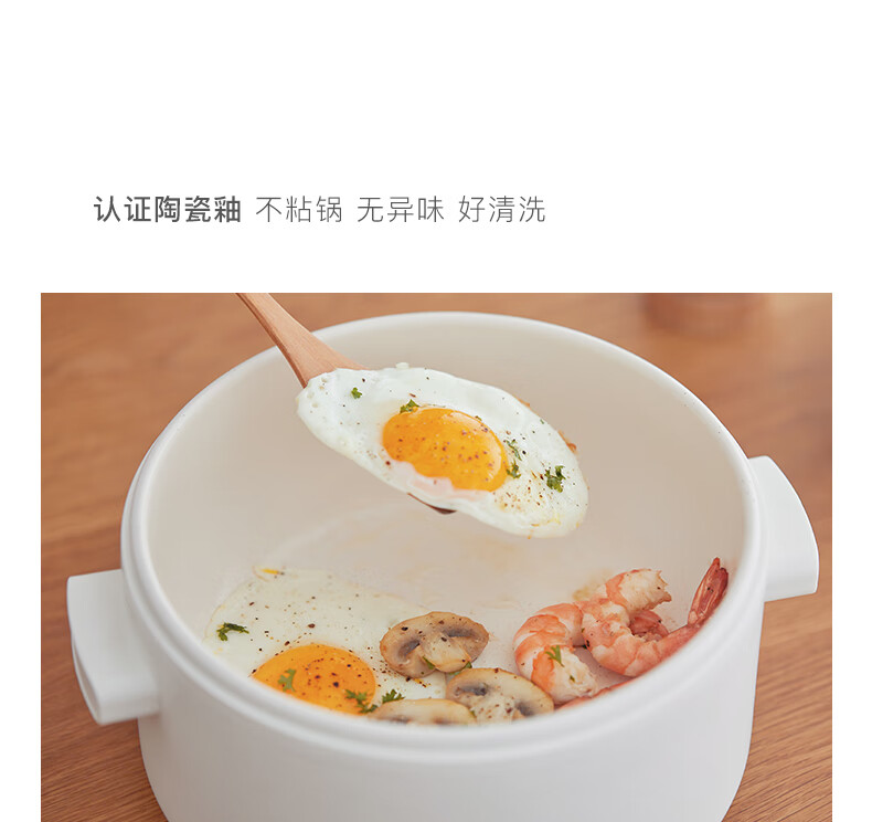 额定功率:1000W 额定容量:3L 毛重:2.5kg 包装尺寸:283*283*240mm 条码:6941927406473 1. 聚能导热快,真正不糊底 2. 陶瓷釉内胆,安全易清洗,硬度8H 无惧钢丝刷 3. 21cm大口径,锅深7cm,翻炒从容 4. 360°整圈发热,温度稳定,防干烧自动断电 5. 上蒸下煮,高透明食品级PP蒸笼(耐温180度)