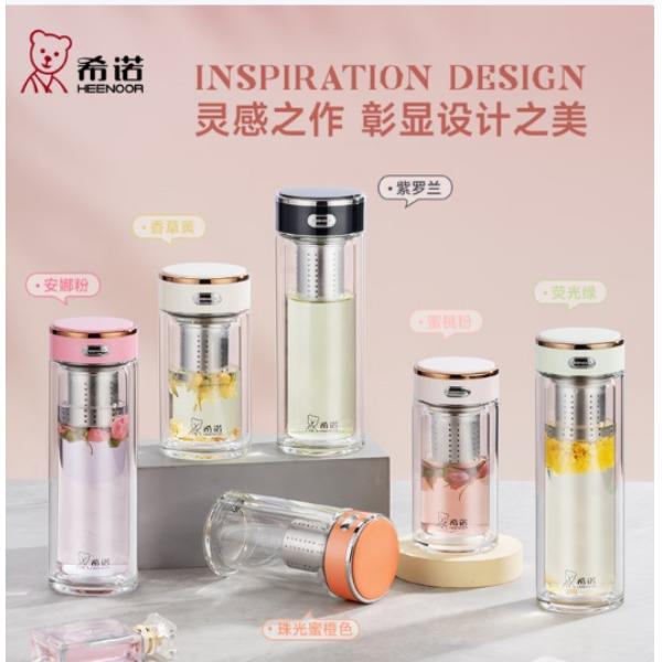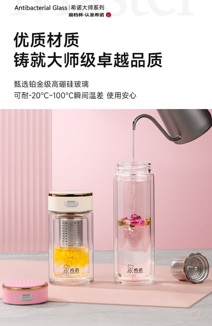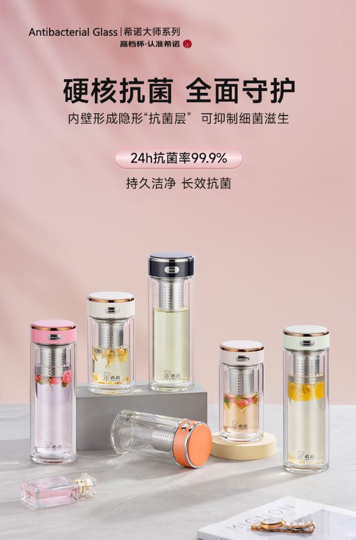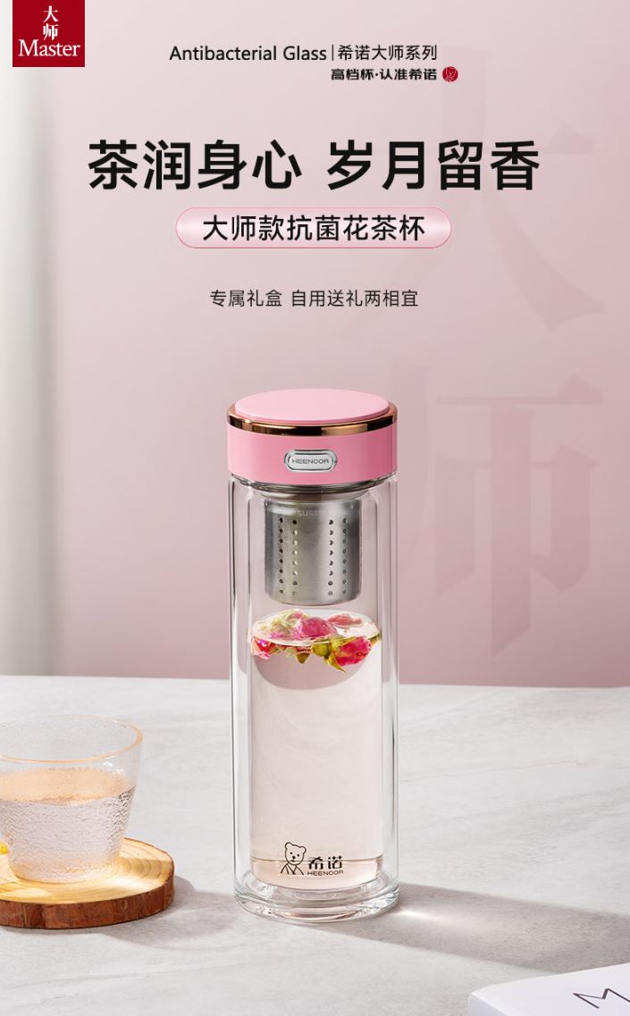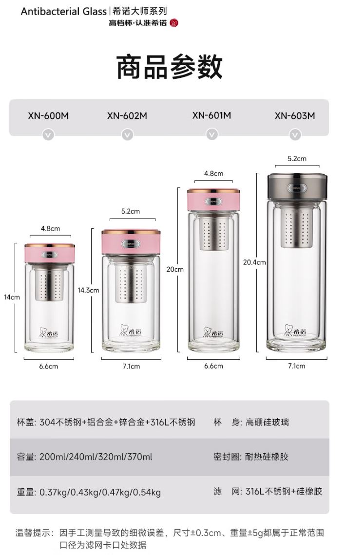 容量 XN-603M: 370ml 规格(mm) XN-603M: 52(杯口直径) x71(直径) x204(高度) 杯体 铂金级高硼硅玻璃、银离子 滤网 SUS316L、食品级硅胶 密封圈 食品级硅胶 条形码 XN-603M: 6951097701629 XN-603M:珠光本色、紫罗兰