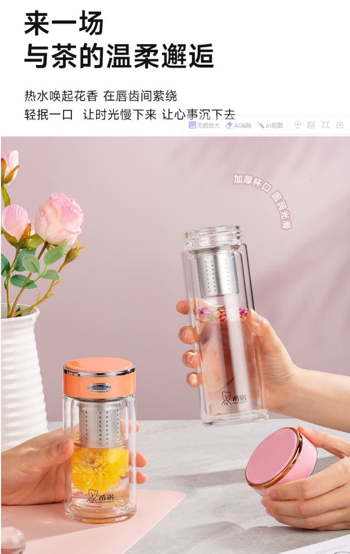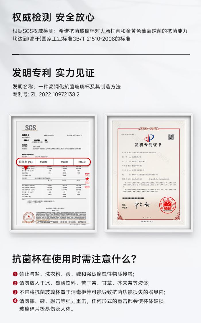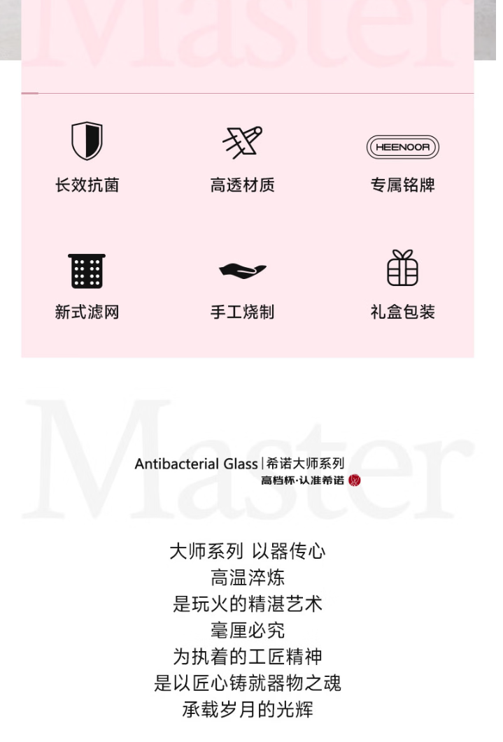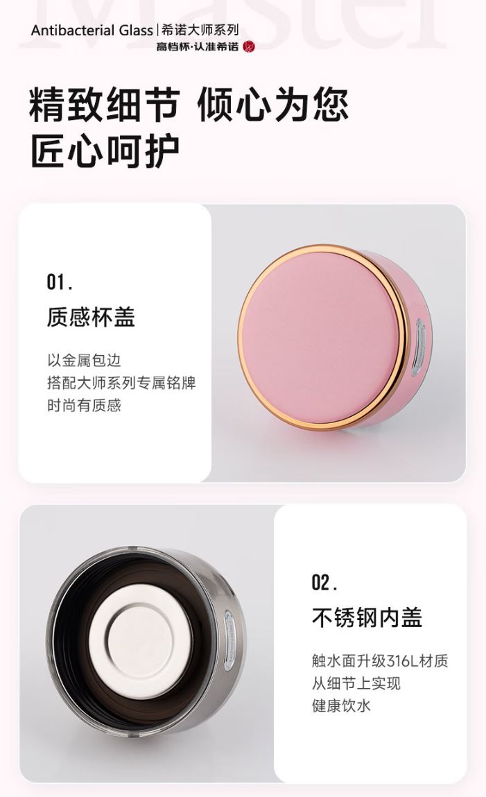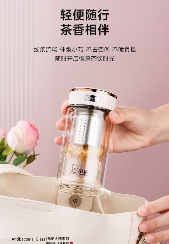 容量 XN-603M: 370ml 规格(mm) XN-603M: 52(杯口直径) x71(直径) x204(高度) 杯体 铂金级高硼硅玻璃、银离子 滤网 SUS316L、食品级硅胶 密封圈 食品级硅胶 条形码 XN-603M: 6951097701629 XN-603M:珠光本色、紫罗兰