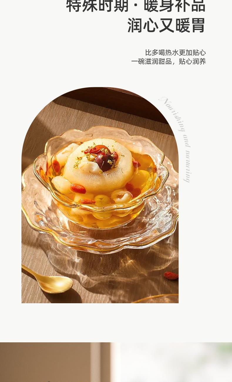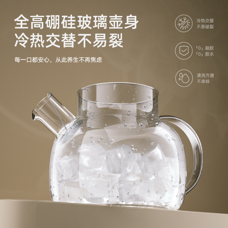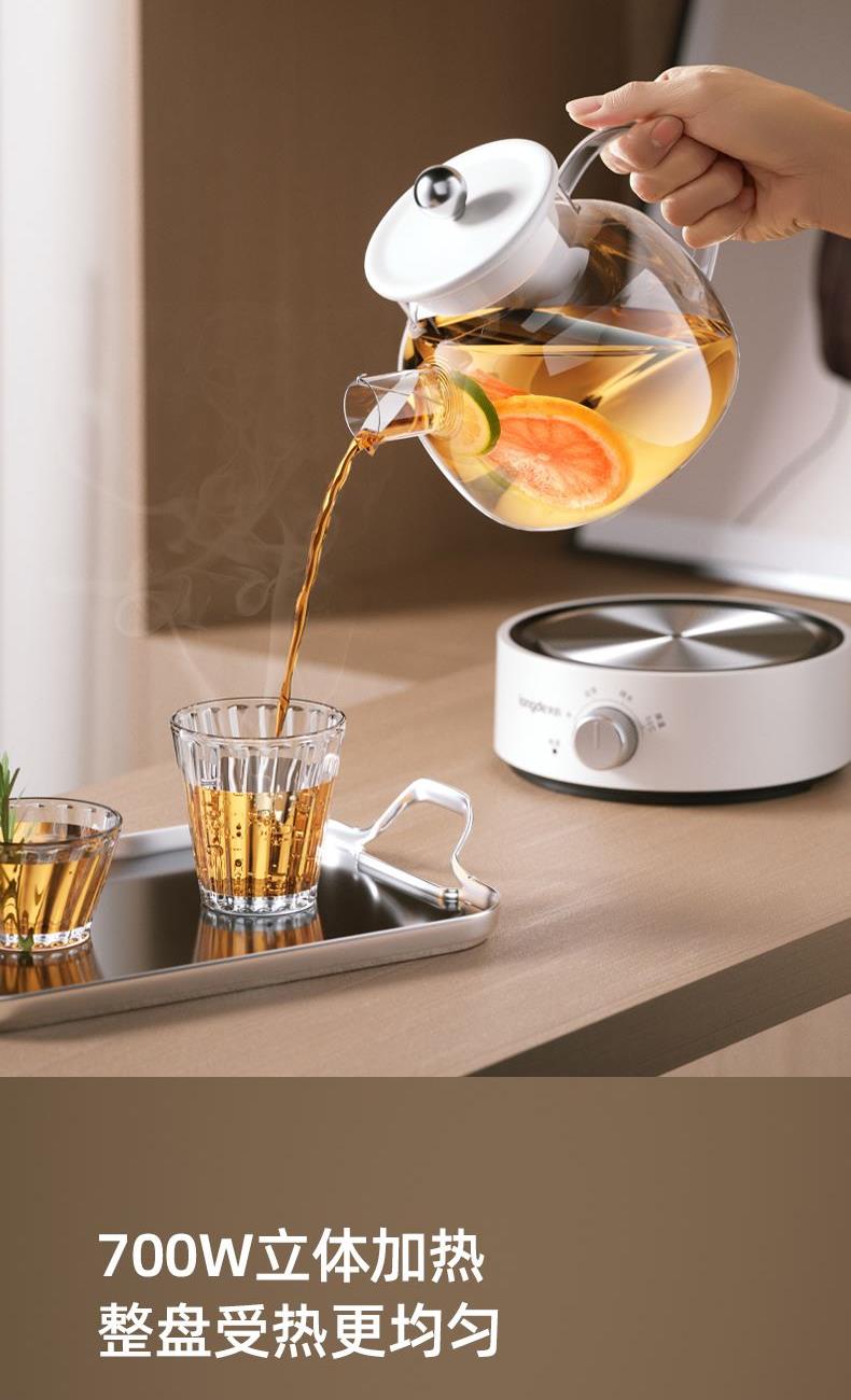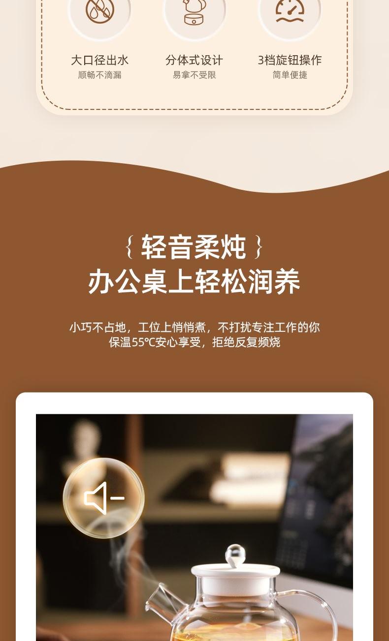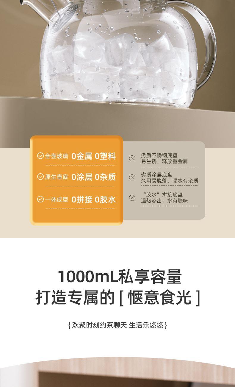 额定功率:700W 产品容量:1000mL 额定电压:220V~ 产品频率:50Hz 产品净重:0.99kg 产品毛重:1.3kg 整箱重量:17.2kg 全玻璃壶身0胶水0涂层,高硼硅玻璃冷热交替不易裂 大口径出水烧水、出水顺畅不滴漏 3档旋钮选择长效保温,集烧水、花茶、营养炖功能于一体 底座壶身分离分体发热盘易清洗,360°全盘发热低音炖煮