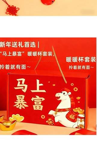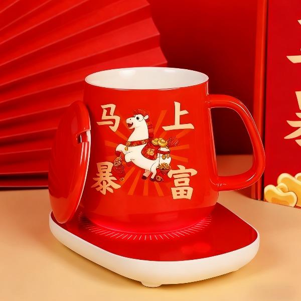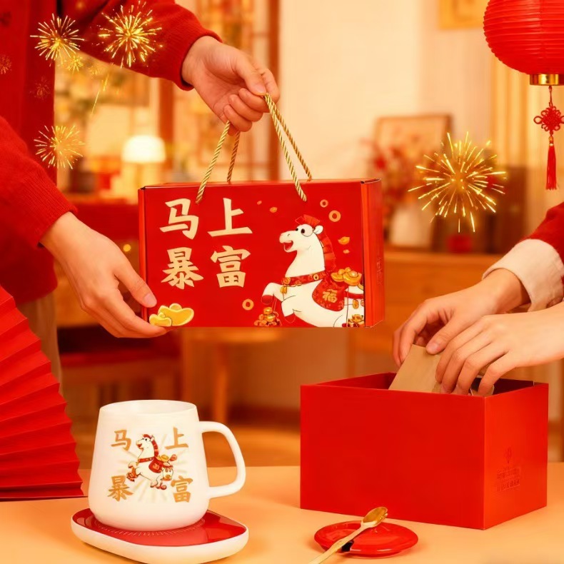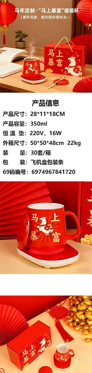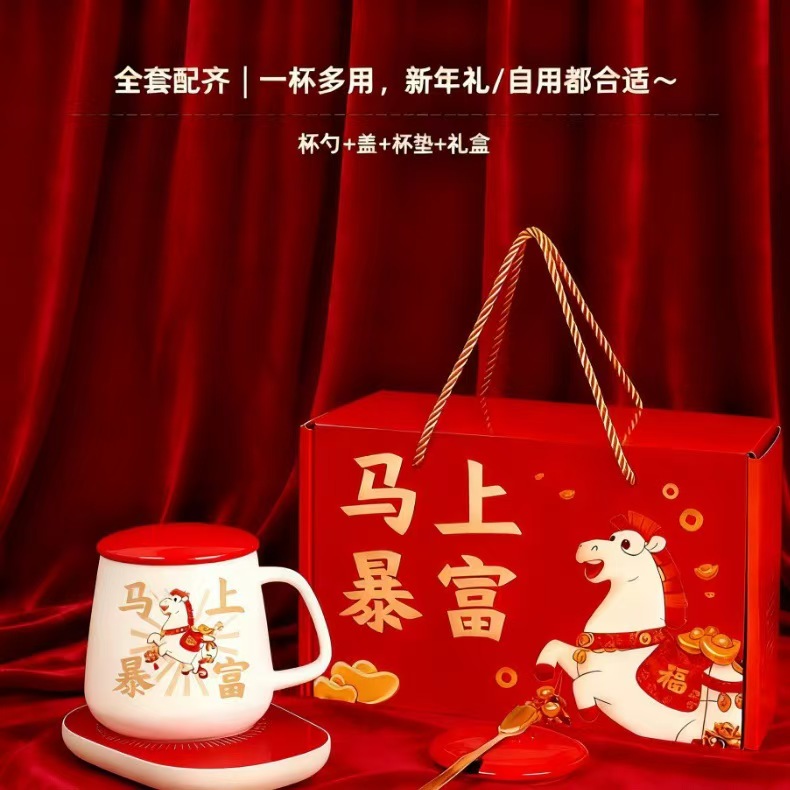 产品尺寸:28*11*18CM 产品容量:350ml 恒温垫:220V,16W 外箱尺寸:50*50*48cm 22kg 包 装:飞机盒包装 产品特点: 国潮马年“马上暴富”恒温杯:让温暖与福气,时刻伴你左右 当国潮风撞上马年吉运,这款红色恒温杯便成了新春里亮眼的心意担当。 杯身那匹驮满金锭的萌马,将“马上暴富”的祈愿具象化,红得热烈又讨喜;搭配同色系恒温底座,让每一口饮品都保持恰好的温度,恰似新年里对生活的热忱始终炽热。从杯、盖、勺到恒温底座,整套礼盒包装红火大气,不管是自留讨个新年彩头,还是送亲友传递“马到成功、富贵绵长”的祝福,都能在举手投足间,把国潮的韵味与马年的祥瑞,一并送到心坎里。