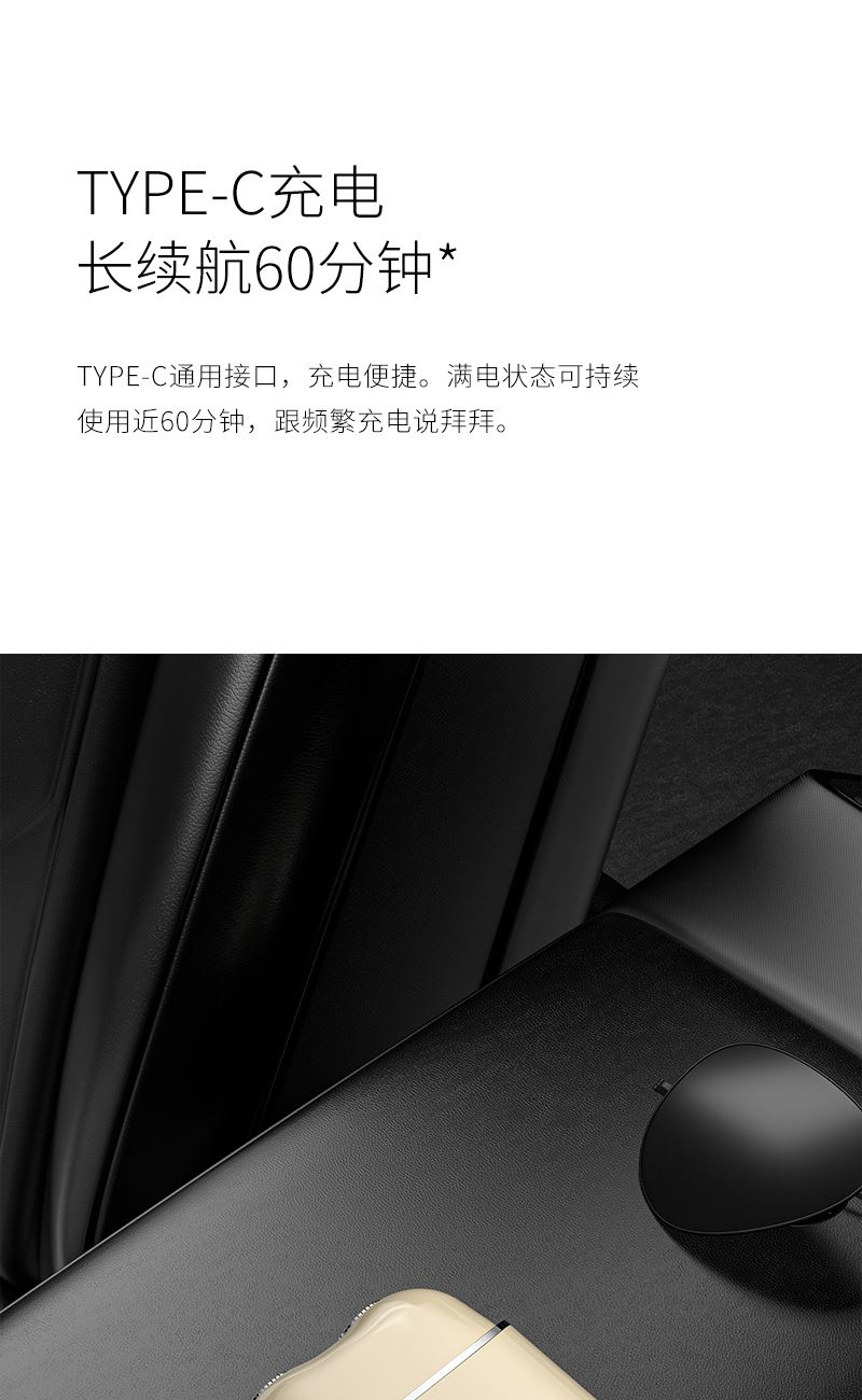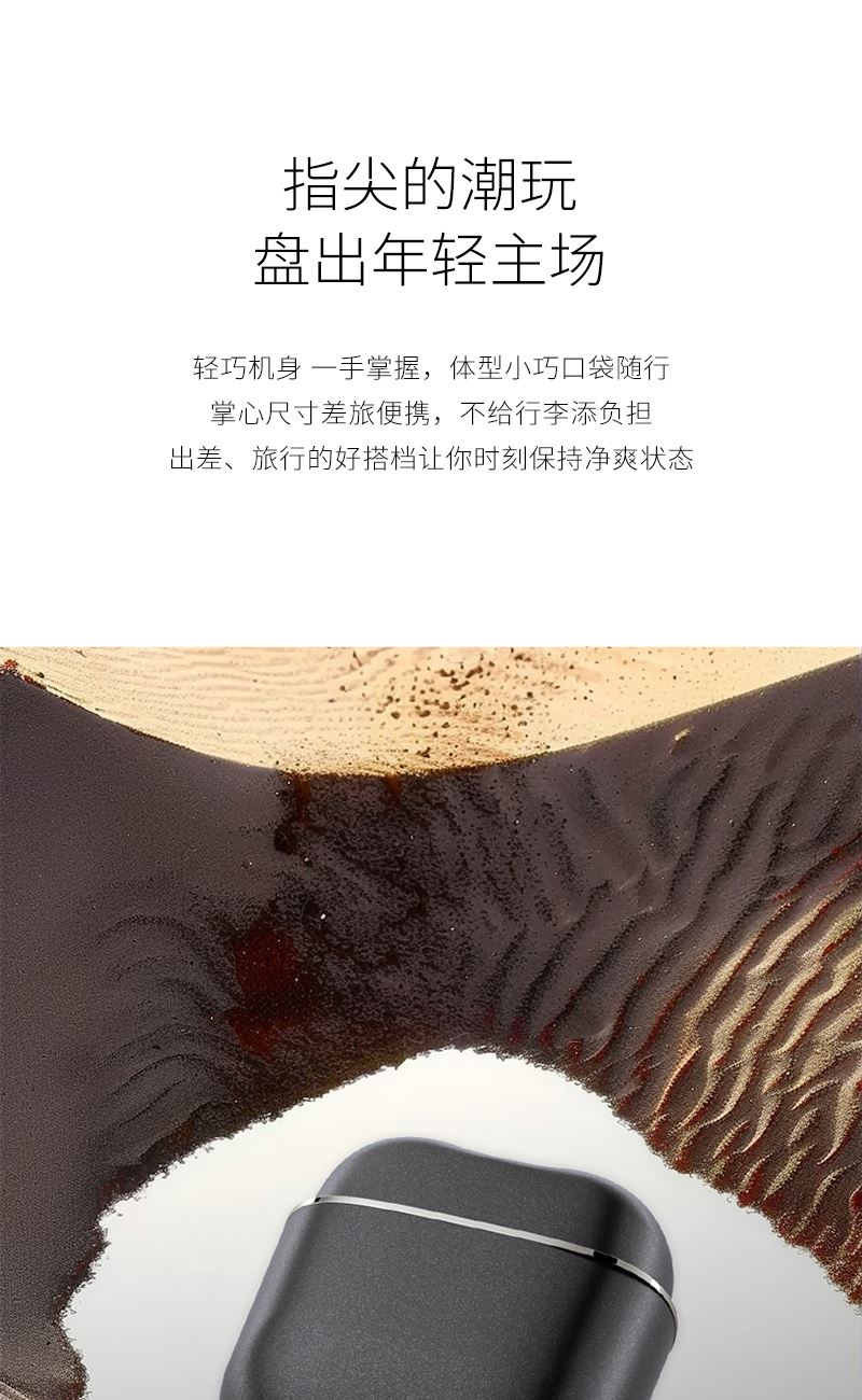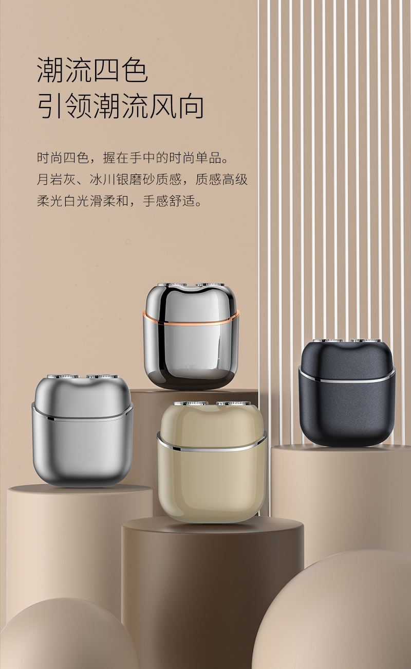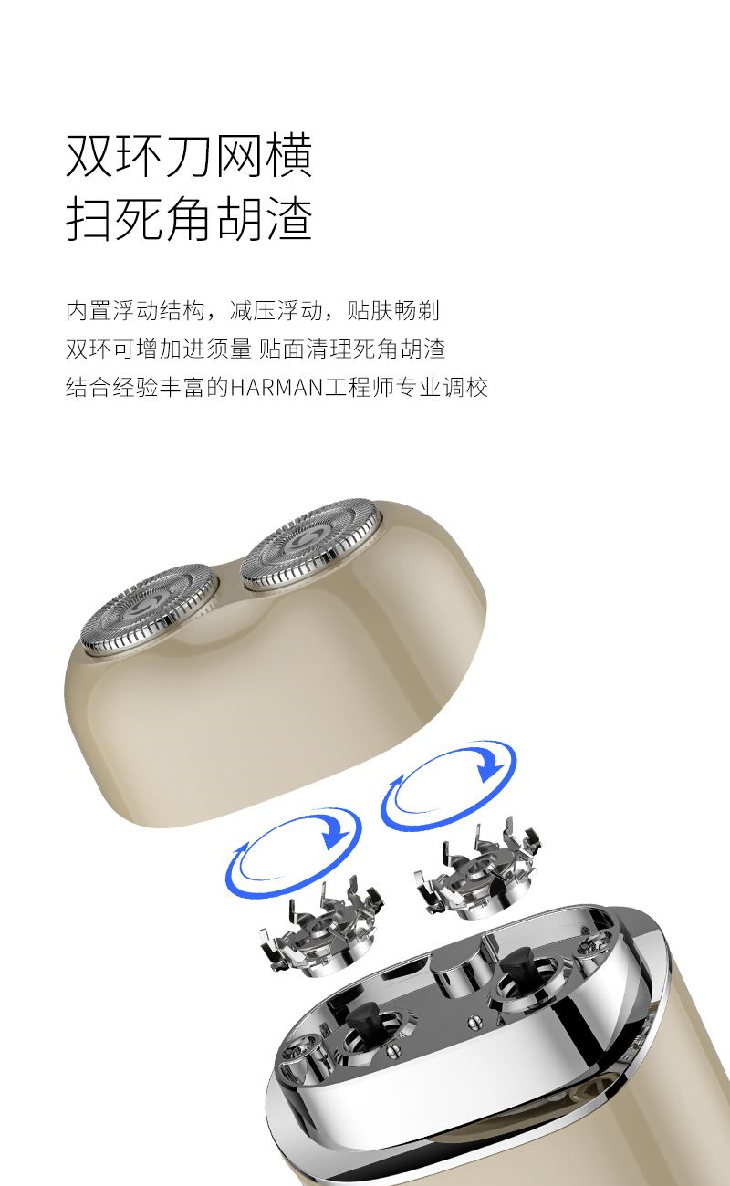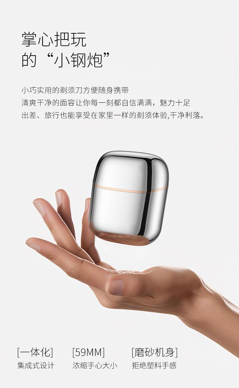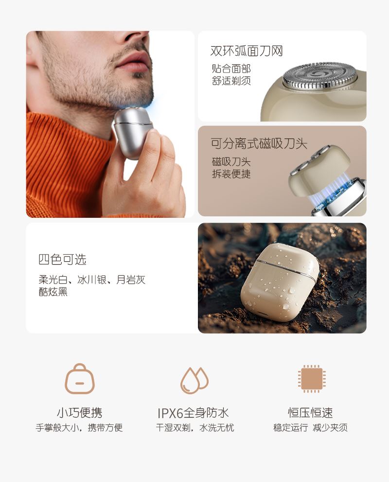 1. 双环弧面刀网,贴合面部舒适剃须; 2. 可分离式磁吸刀头,磁吸刀头拆装便捷; 3. 小巧便携,手掌般大小,携带方便; 4. IPX7全身防水,干湿双剃,水洗无忧; 5. 恒压恒速,稳定运行 减少夹须; 6.智能感应开关,触肌即启;