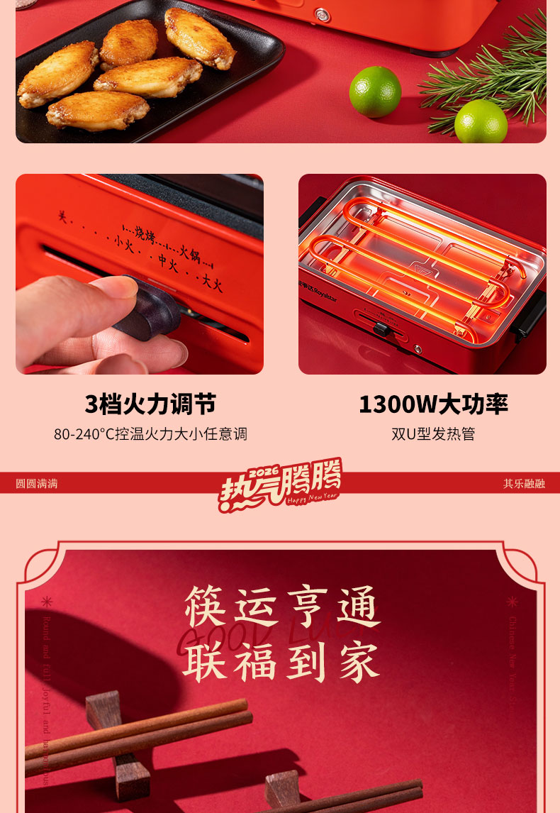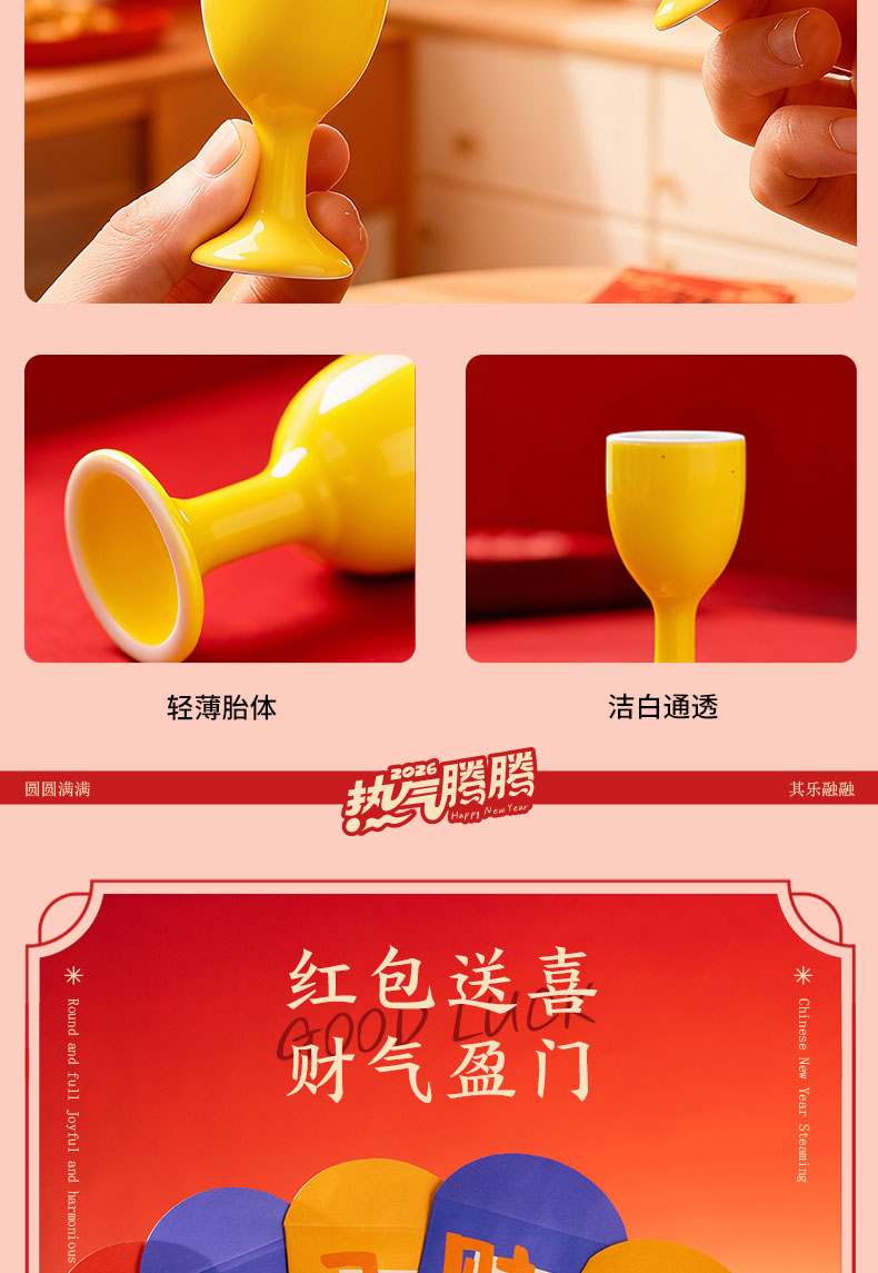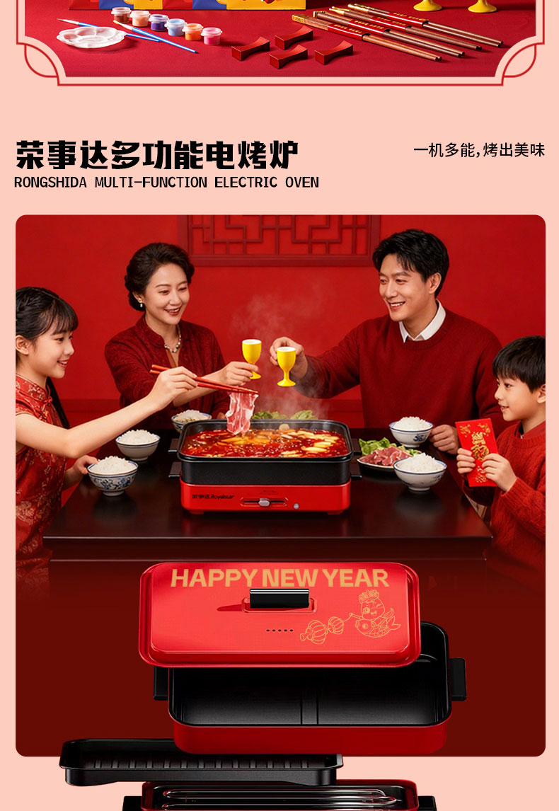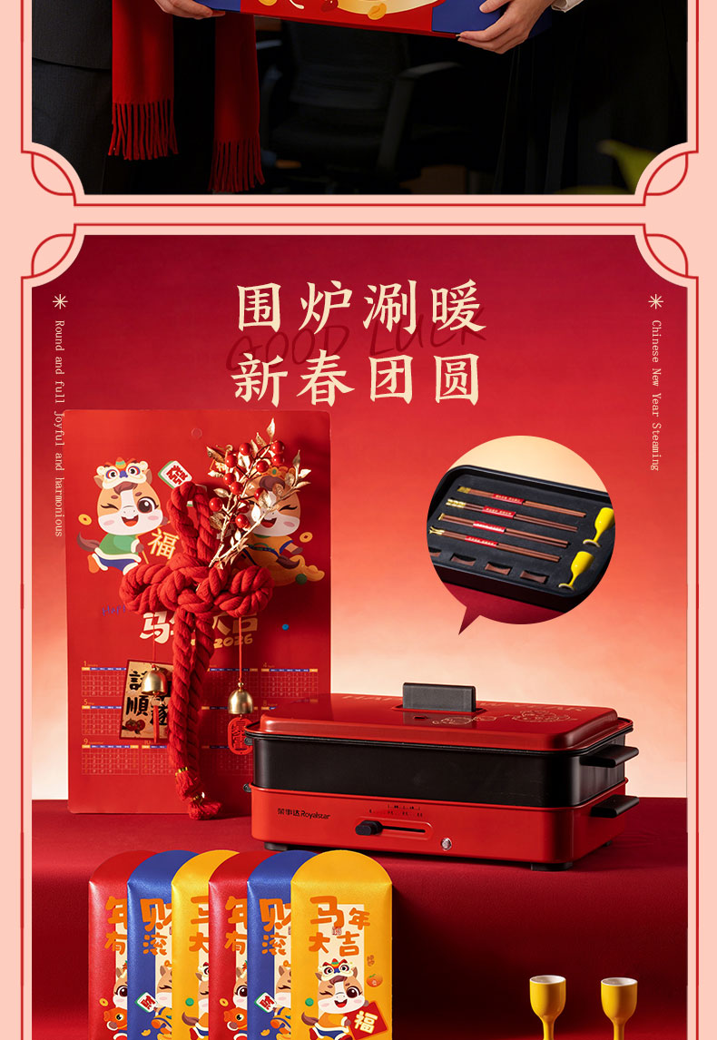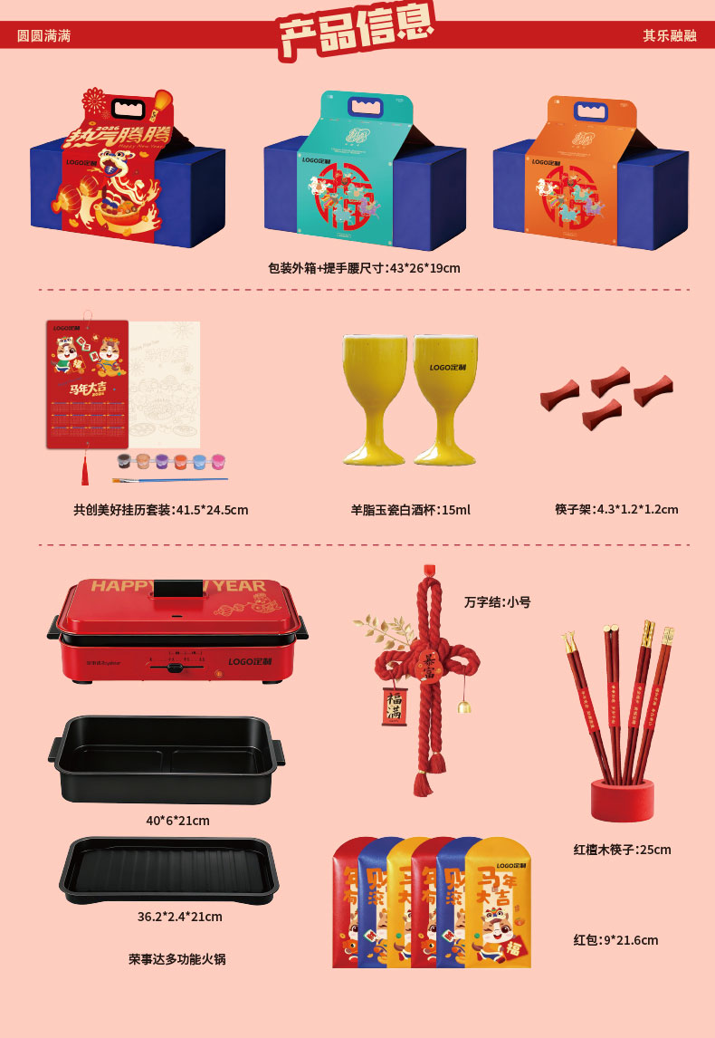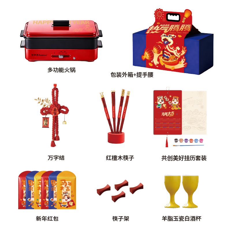 1.多功能双层电火炉 2.共绘美好 挂历 3.万字结*1 4.财源滚滚 红包*6 5.红檀木筷子*4双 6.红檀木筷子架*4 7.羊脂玉瓷白酒杯*2