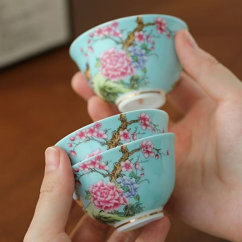 壶:12*10厘米 200ml 品茗杯:6*5厘米40ml 精选高岭土等优质原料,珐琅彩工艺,经高温烧制而成,质地致密,气孔率小,吸水率低,不易吸附异味,清洗便捷。