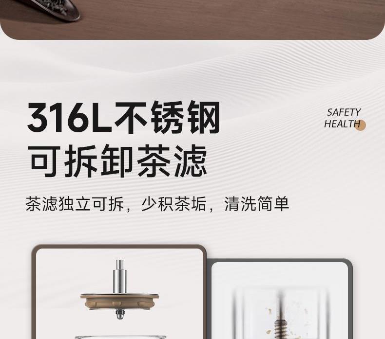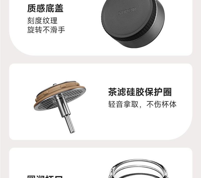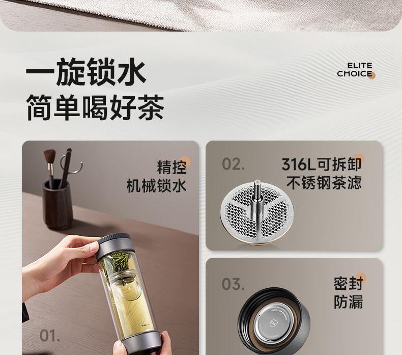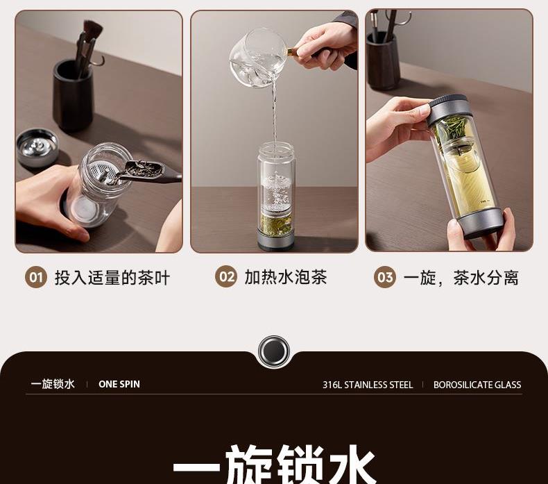 容量:360ml 578*463*268mm 15.80kgs 材质:316不锈钢+高硼硅 卖点: 1.双仓设计,一旋茶水分离 2.茶滤可拆易清洁 3.4秒极速出水,好茶不用等 4.底盖设计:耐脏易清洁 5.顶盖设计:塑件触底,轻音设计