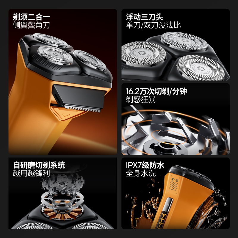 电机转速:9000转/min 刀头材质:精钢 刀头数量:3个 产品尺寸:149*57*64mm 产品净重:0.14kg 电压:5V 防水等级:IPX7,可全身水洗 充电时间:1.5小时快充 续航:60天 1、剃须二合一,侧翼鬓角刀; 2、浮动3刀头,54叶刀片,剃须效率更高; 3、9000转高速静噪电机,够性能才够快; 4、 顺滑贴肤,干湿两剃; 5、IPX7级防水等级,可全身水洗;