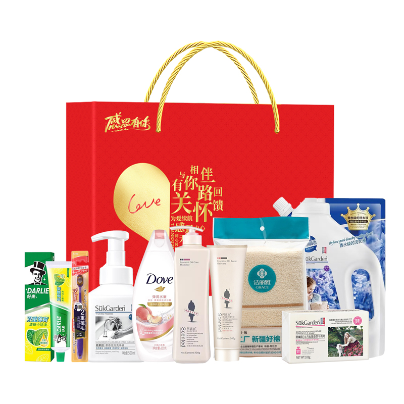 礼盒尺寸:32*8.5*24.5cm 包装尺寸:66*46.5*51CM 产品配置:(香型随机) 阿道夫洗发水300ml 阿道夫护发素260ml 多芬沐浴露300ml 蔬果园洗衣液500g 洁丽雅毛巾69*33cm 好来牙膏90g 进口宽头软毛牙刷2重植毛 蔬果园洗手液500ml 蔬果园马赛宅101g