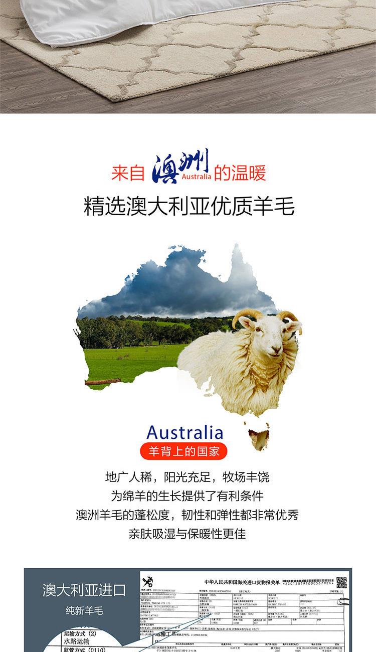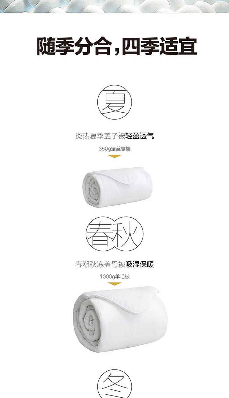 子被填充柞蚕丝,吸湿透气,体感舒爽 ,亲肤贴身,适合夏季使用;母被填充羊毛,≥45mm的羊毛长度,形成高度自然卷曲,使羊毛纤维间形成空气层,可有效锁住热量防止失散;