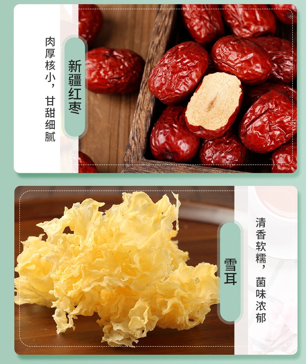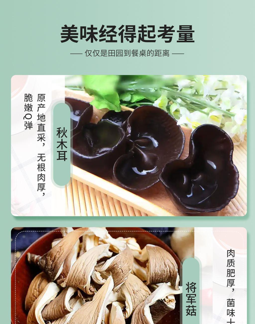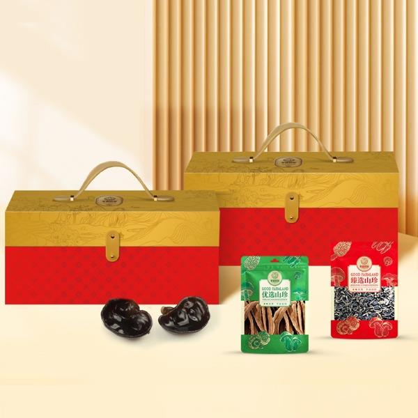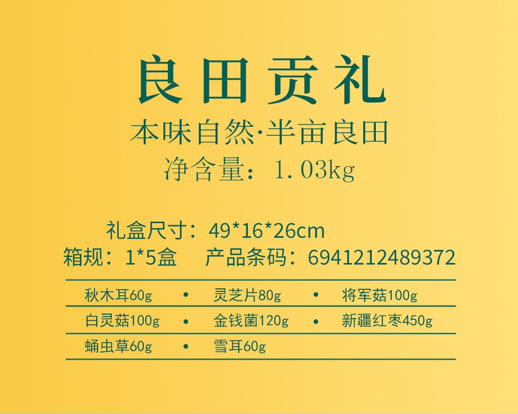 产品配置: 野生秋木耳60g 精选灵芝片80g 精选将军菇100g 精选白灵菇100g 野生金钱菌120g 新疆红枣450g 精选蛹虫草60g 精选雪耳60g 净含量:1.03kg 礼盒尺寸:49*16*26cm 野生菌邂逅滋补果干,珍有食材集结。一盒囊括自然精华, 无论是自享还是赠友,都是品质之选。