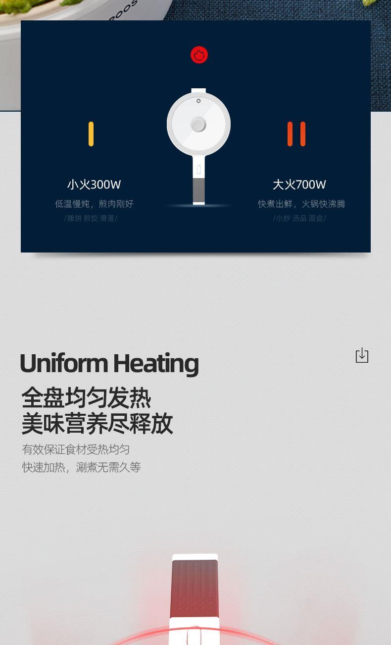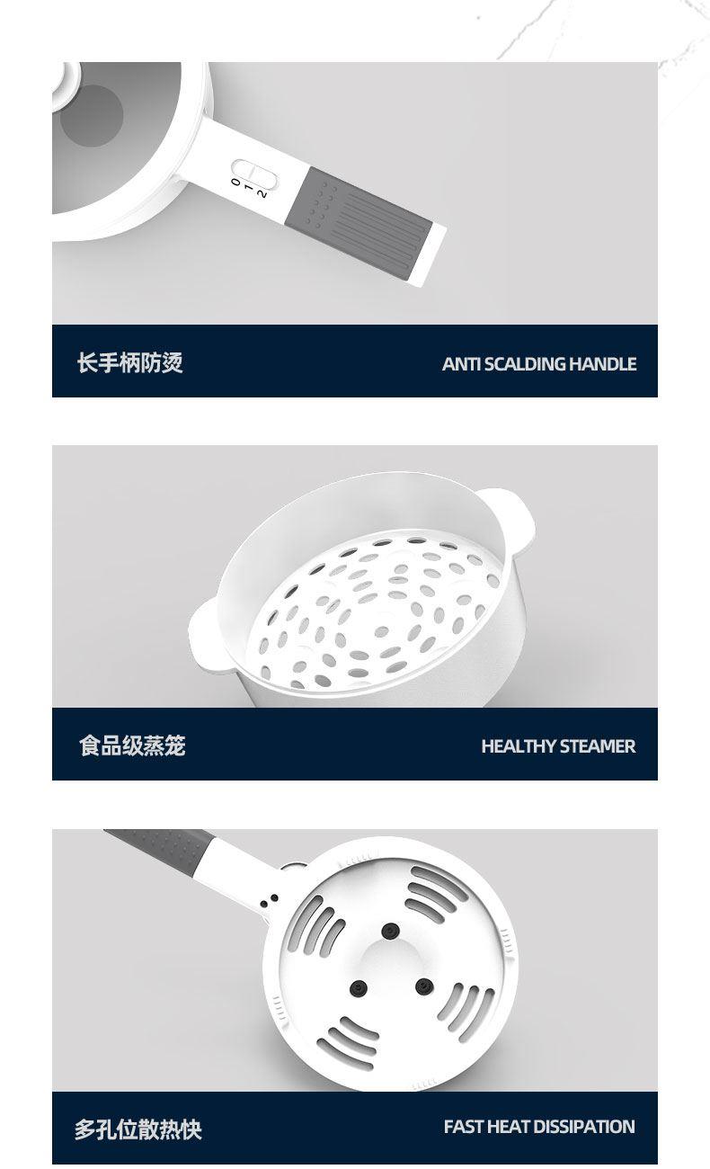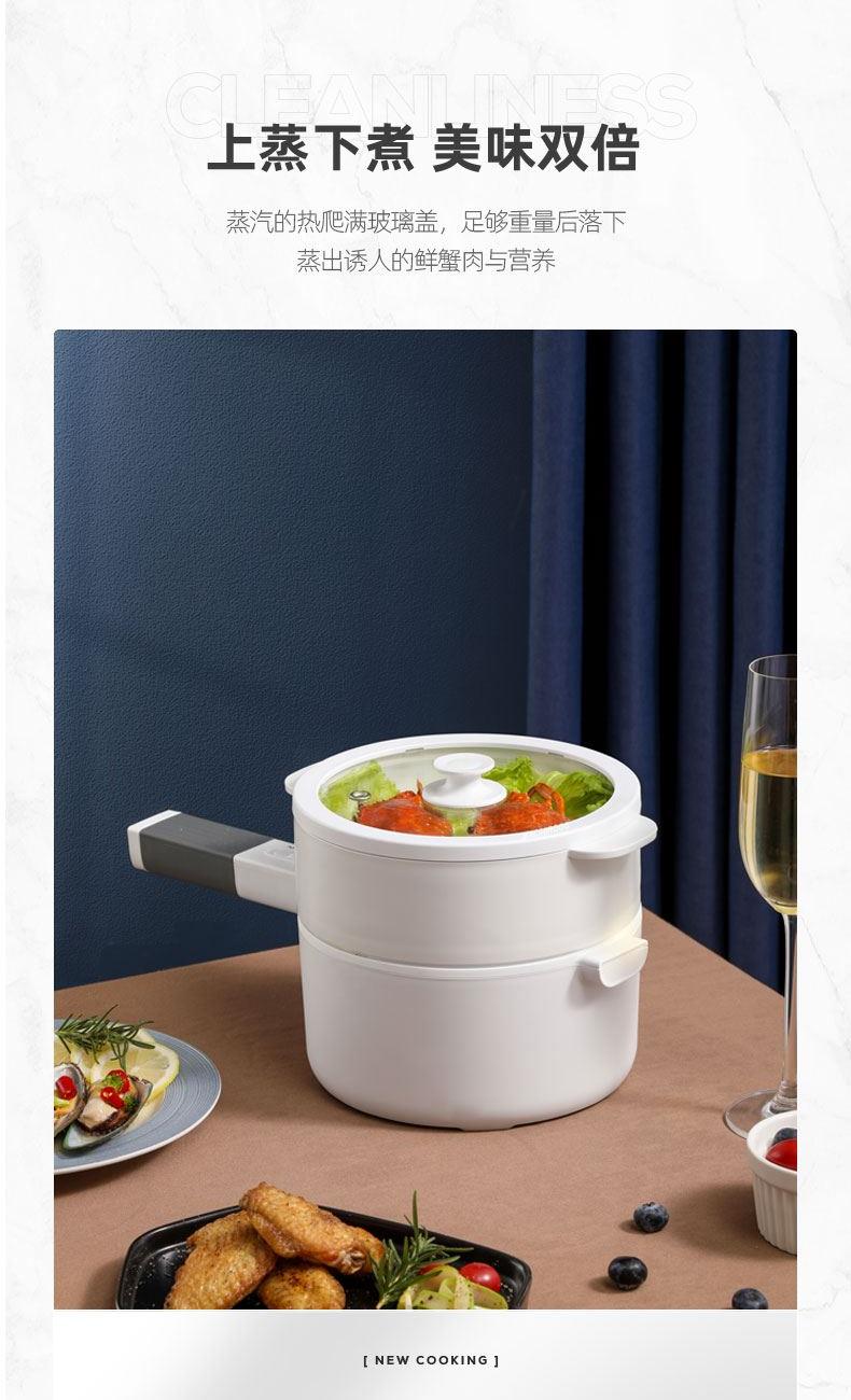 额定功率:700W 额定容量:1.5L 额定电压:220V~ 额定频率:50Hz 产品净重:1.3kg 产品毛重:1.5kg 整箱重量:13.0kg 一锅多用蒸、煮、煎、涮,一锅多用,加长手柄,轻松烹饪; 陶瓷油不粘锅胆一体成型,材质安全无异味,可煎/可煮,易清洗; 两档火力推钮开关调节,大火快煮,小火慢炖,内置优质温控,控温; 上蒸下煮食品级蒸笼,双层防烫锅体,干烧保护。