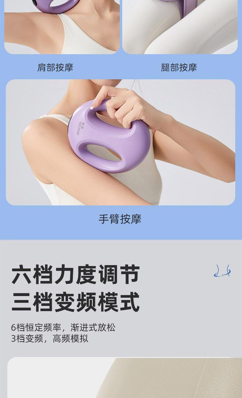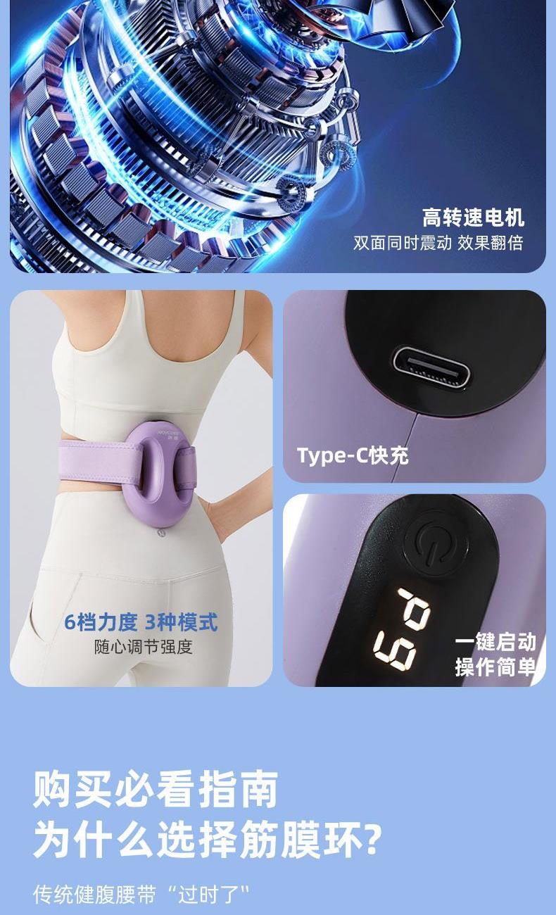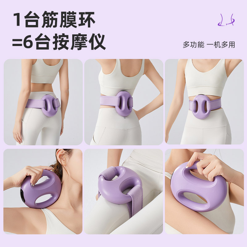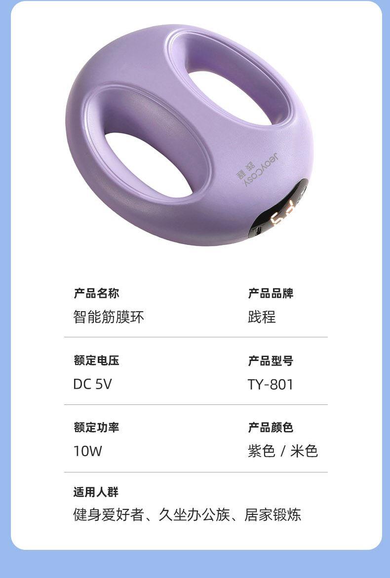 产品功能:震动按摩 产品材质:ABS 供电方式:TYPE-C充电 1200mAh 产品颜色:紫色 米色 产品型号:TY-801 额定电压:DC 4.2V 额定功率:12W 产品净重:0.42kg 产品尺寸:14x16x5cm 条形码:6952679802062 1、升级体验,高频震动,让全身脂肪运动甩起来 2、1台筋膜环=6台按摩仪,一机多用,多部位按摩,贴合身体各部位,臀部、腰部、腹部、等多角度按摩 3、六档力度调节,三档变频模式,渐进式放松 4、Type-C接口,便捷充电