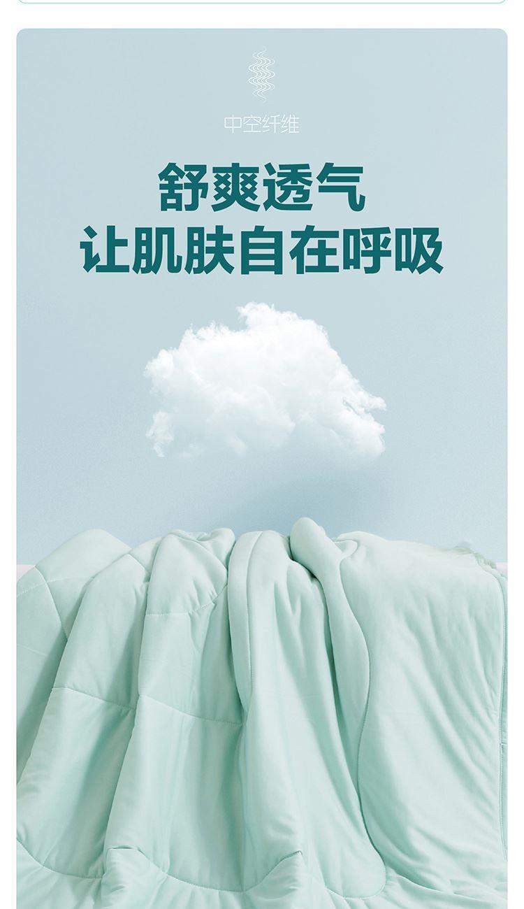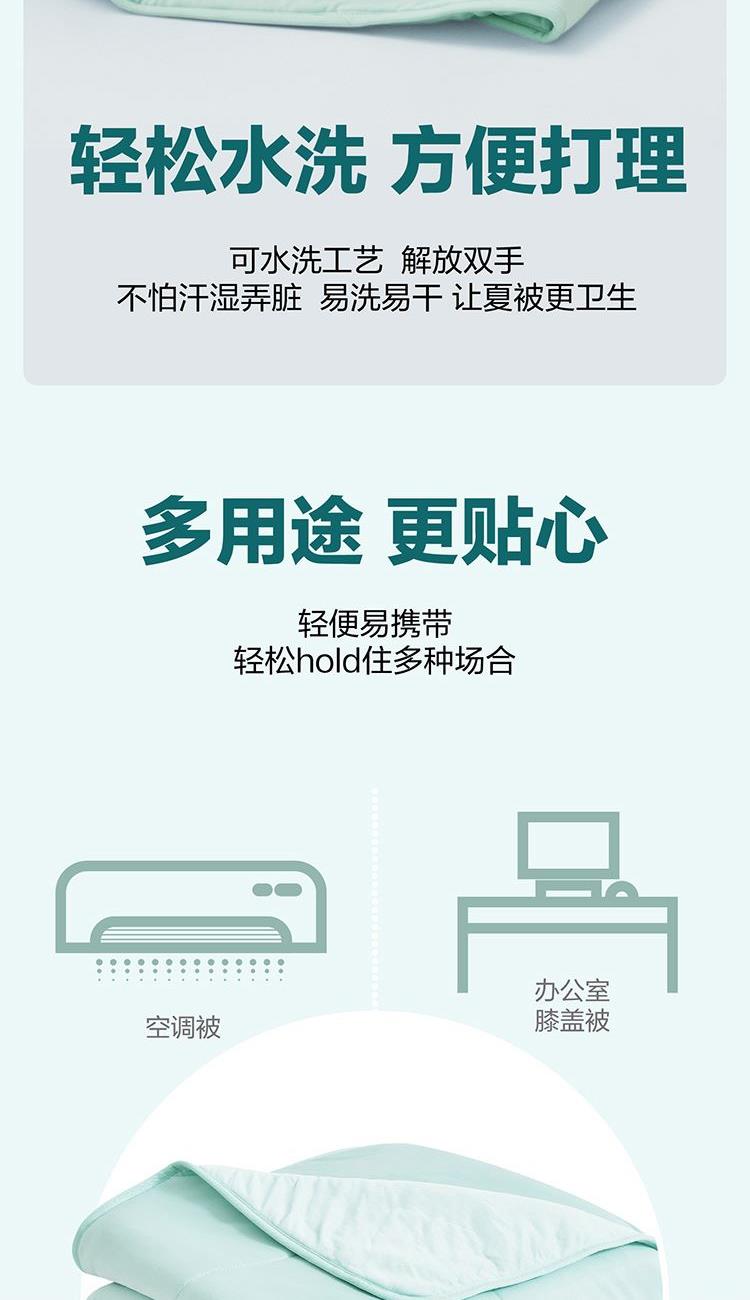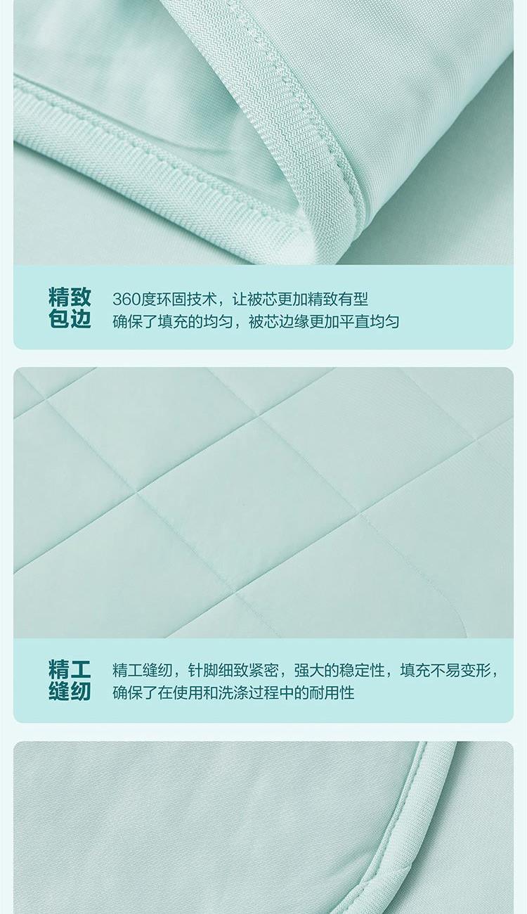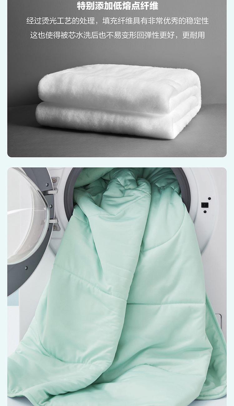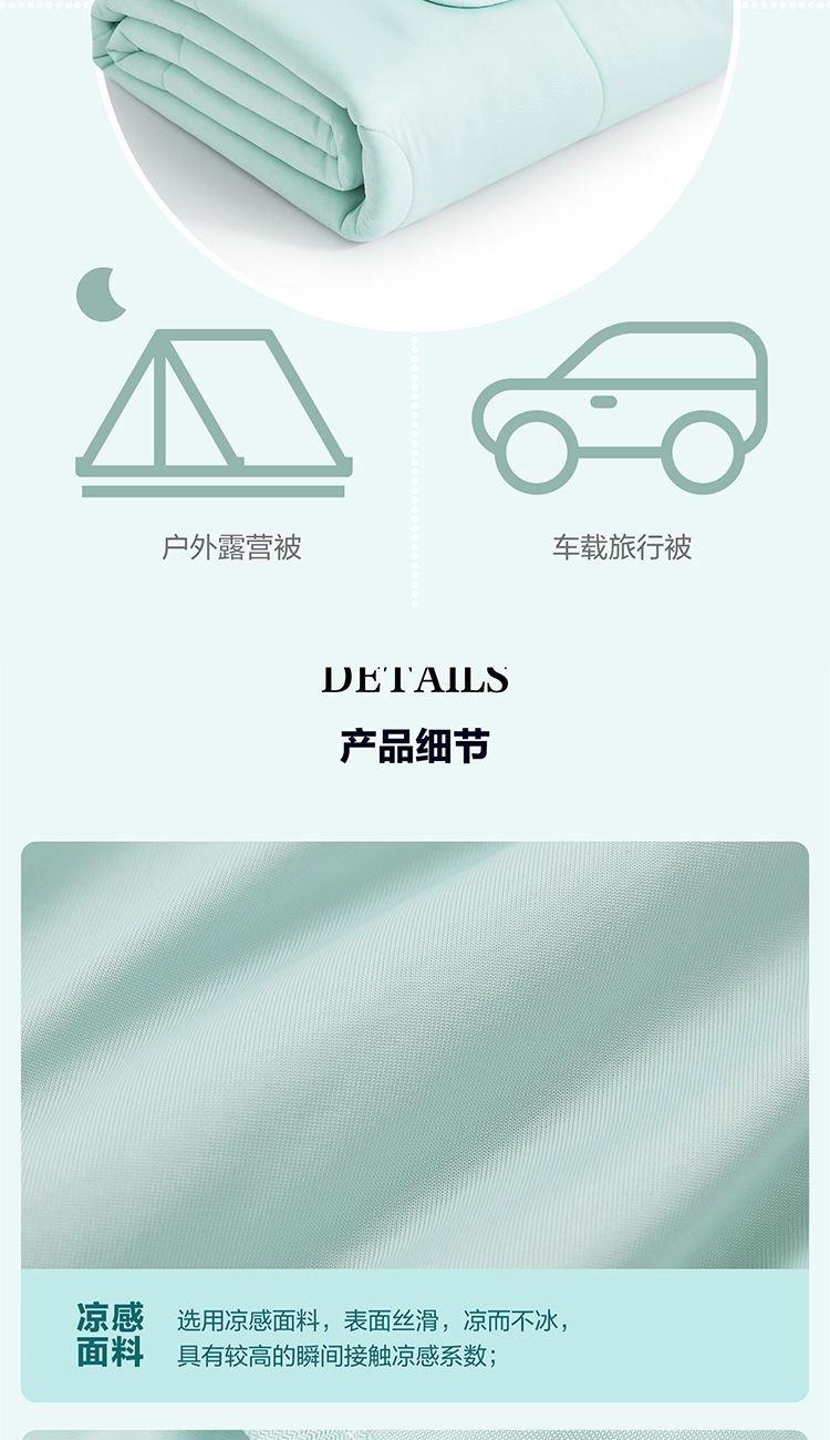 面料材质: 锦纶 填充材质: 聚酯纤维 规格尺寸:150*200cm 填充重量:228g/350g 外箱尺寸: 54*44*76cm 选用 锦纶凉感面料,表面丝滑,凉而不冰,具有较高的瞬间接触凉感系数; 填充中空纤维,经过精细配棉、开松、铺棉等多道工序加工而成,采用层层叠加的形式手感更加的柔软舒适,后道烫光工艺使得被芯更加不容易跑毛,更加经久耐用; 薄荷绿自然清新,可水洗设计,方便清洁,保持健康睡眠环境。