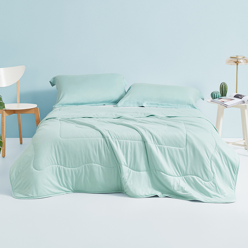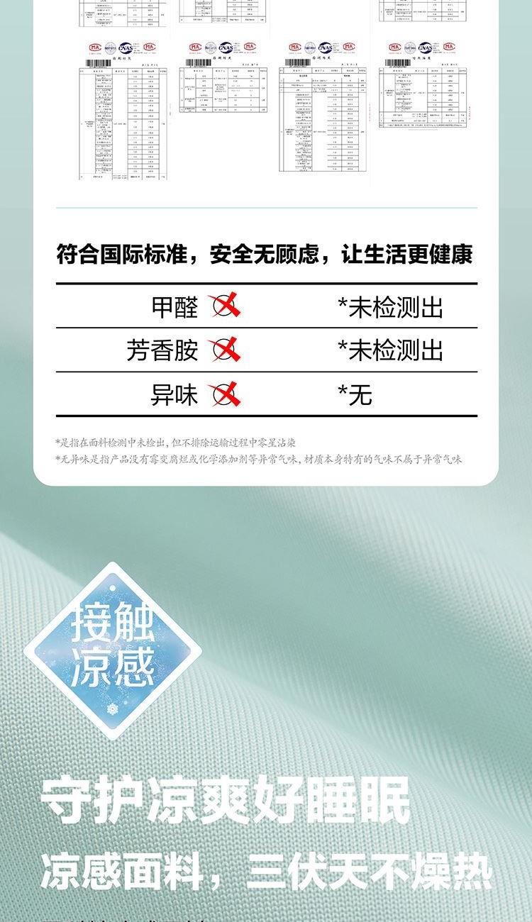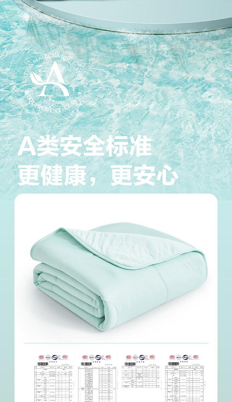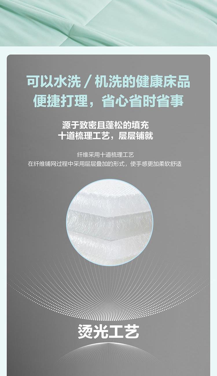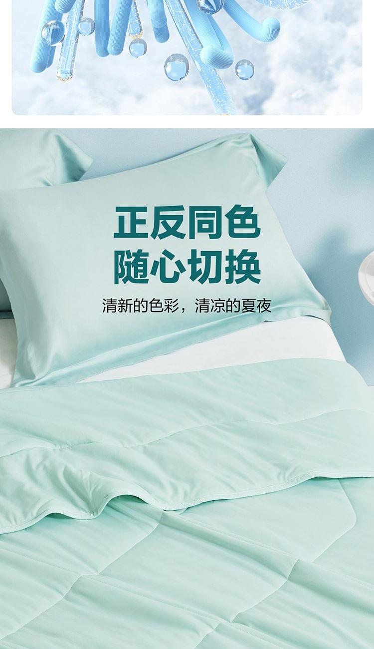 面料材质: 锦纶 填充材质: 聚酯纤维 规格尺寸:150*200cm 填充重量:228g/350g 外箱尺寸: 54*44*76cm 选用 锦纶凉感面料,表面丝滑,凉而不冰,具有较高的瞬间接触凉感系数; 填充中空纤维,经过精细配棉、开松、铺棉等多道工序加工而成,采用层层叠加的形式手感更加的柔软舒适,后道烫光工艺使得被芯更加不容易跑毛,更加经久耐用; 薄荷绿自然清新,可水洗设计,方便清洁,保持健康睡眠环境。