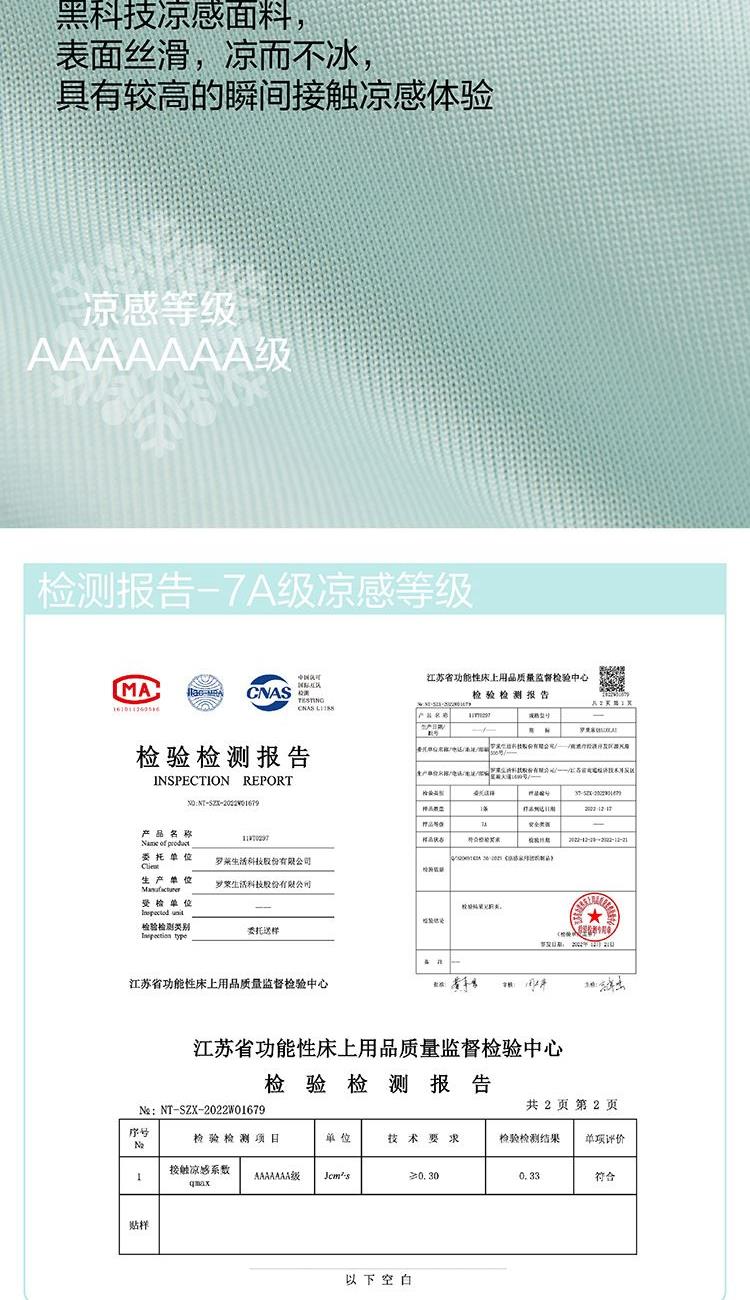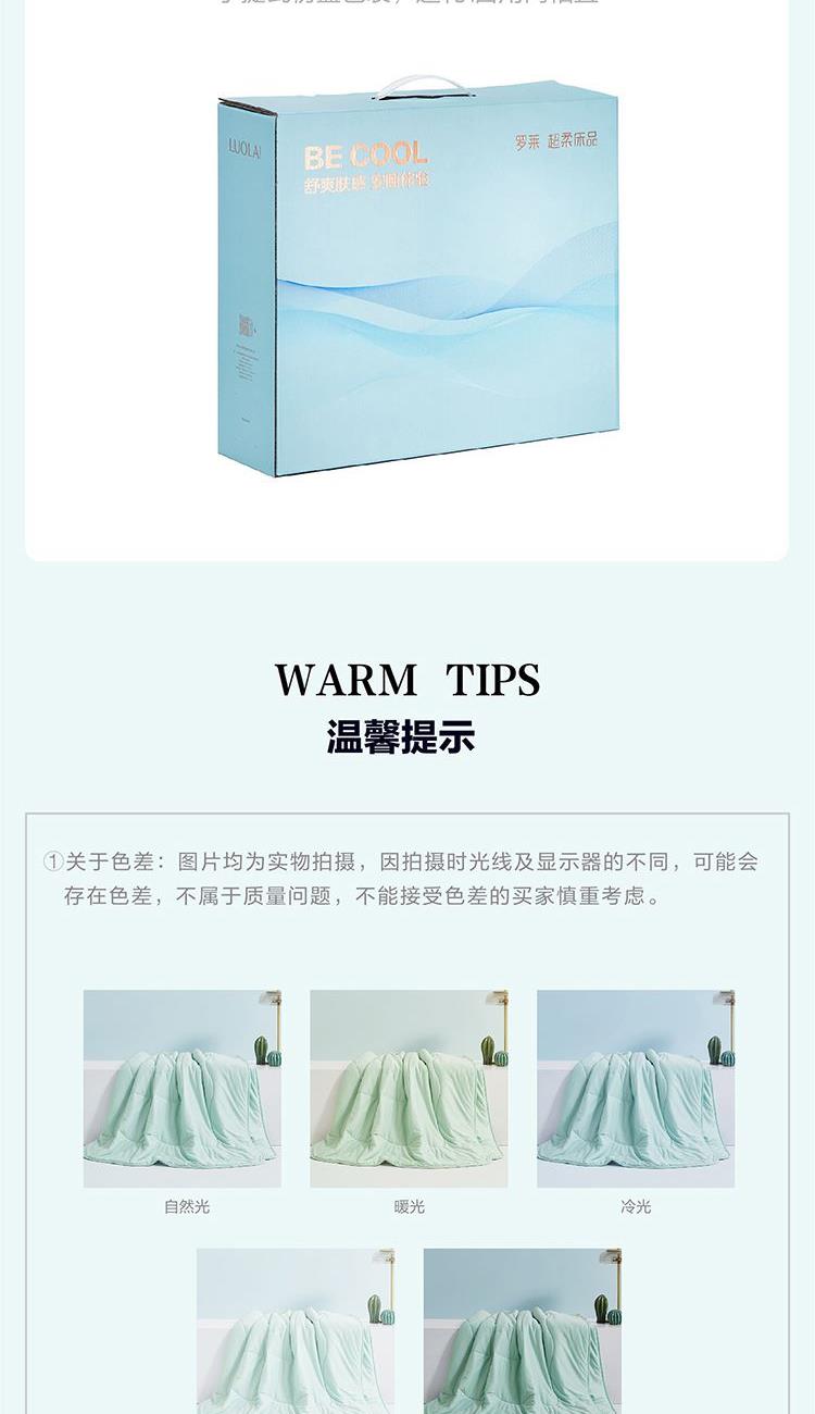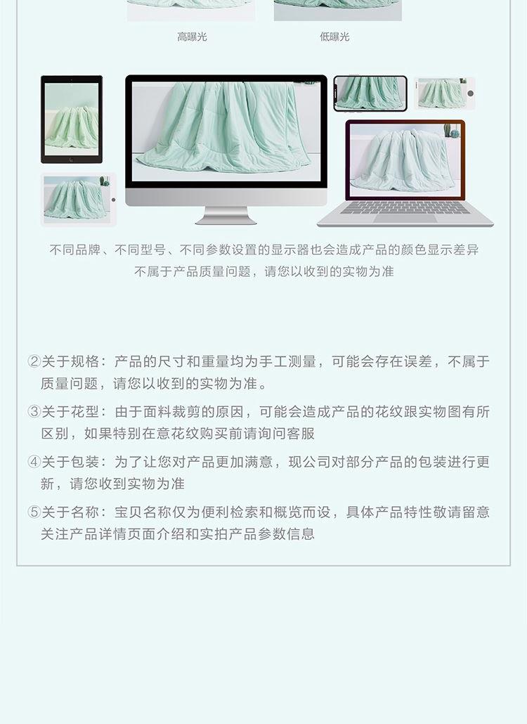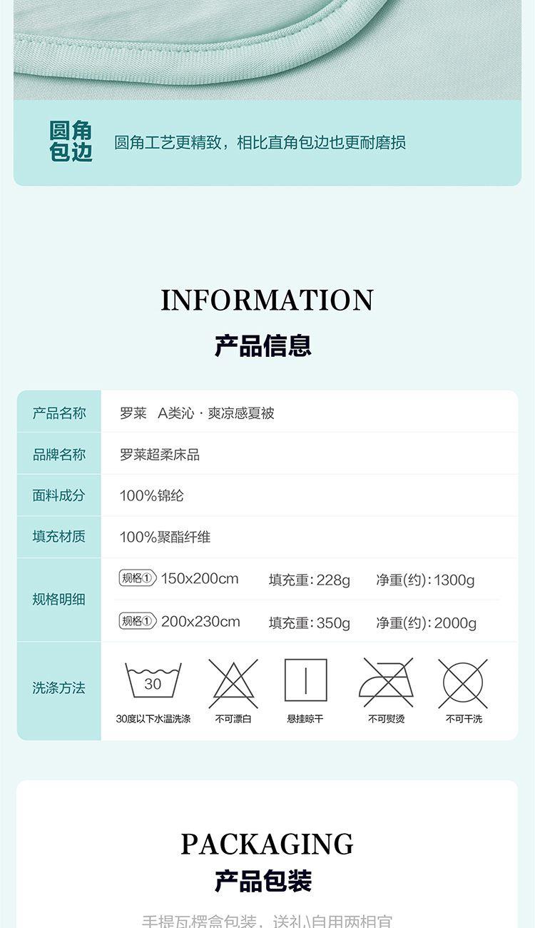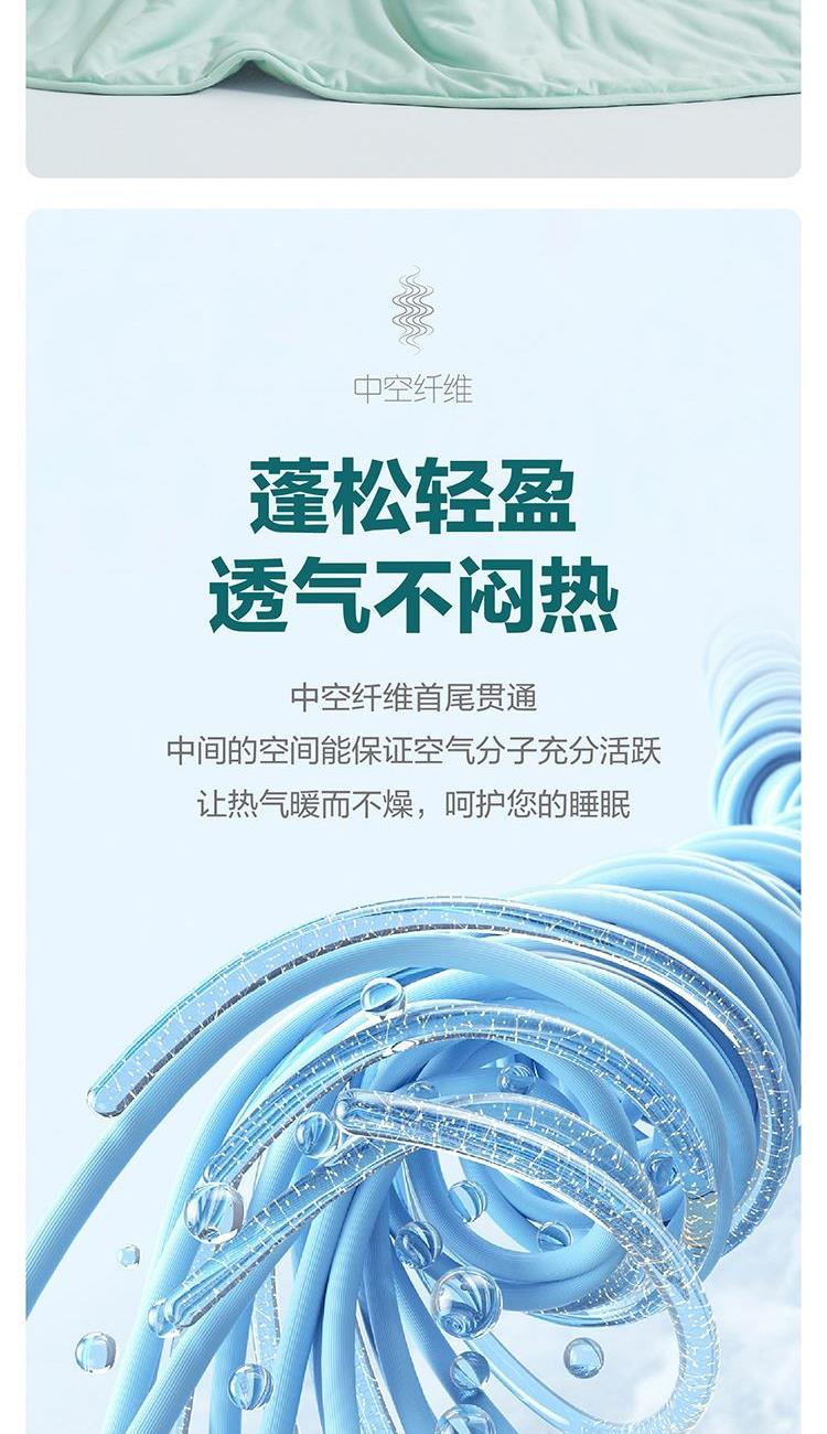 面料材质: 锦纶 填充材质: 聚酯纤维 规格尺寸:150*200cm 填充重量:228g/350g 外箱尺寸: 54*44*76cm 选用 锦纶凉感面料,表面丝滑,凉而不冰,具有较高的瞬间接触凉感系数; 填充中空纤维,经过精细配棉、开松、铺棉等多道工序加工而成,采用层层叠加的形式手感更加的柔软舒适,后道烫光工艺使得被芯更加不容易跑毛,更加经久耐用; 薄荷绿自然清新,可水洗设计,方便清洁,保持健康睡眠环境。