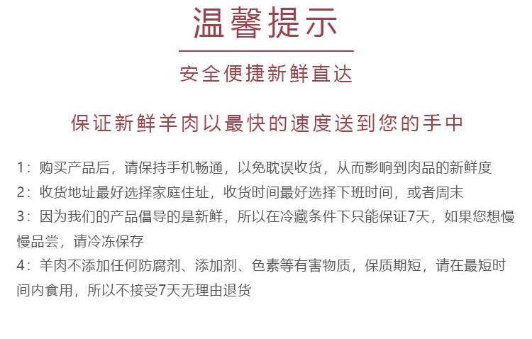 产品:羊肉礼盒C款 保质期:冷冻储存12个月 包装:塑封真空无污染 净含量:4000g 产品规格: 内蒙盖羊切块1000gx1袋 内蒙盖羊带肉羊颈排1000gx1袋 内蒙盖羊带肉羊脖骨1000gx1袋 内蒙羔羊带骨羊小腿1000gx1袋 农场放养管理,造就每一块珍品羊肉 专业冷链屠率工艺,48小时经过排酸经冷却的排酸过的羊肉肉质细腻有利于人体消化吸收,食用更健康 及时时间送达 保证新鲜