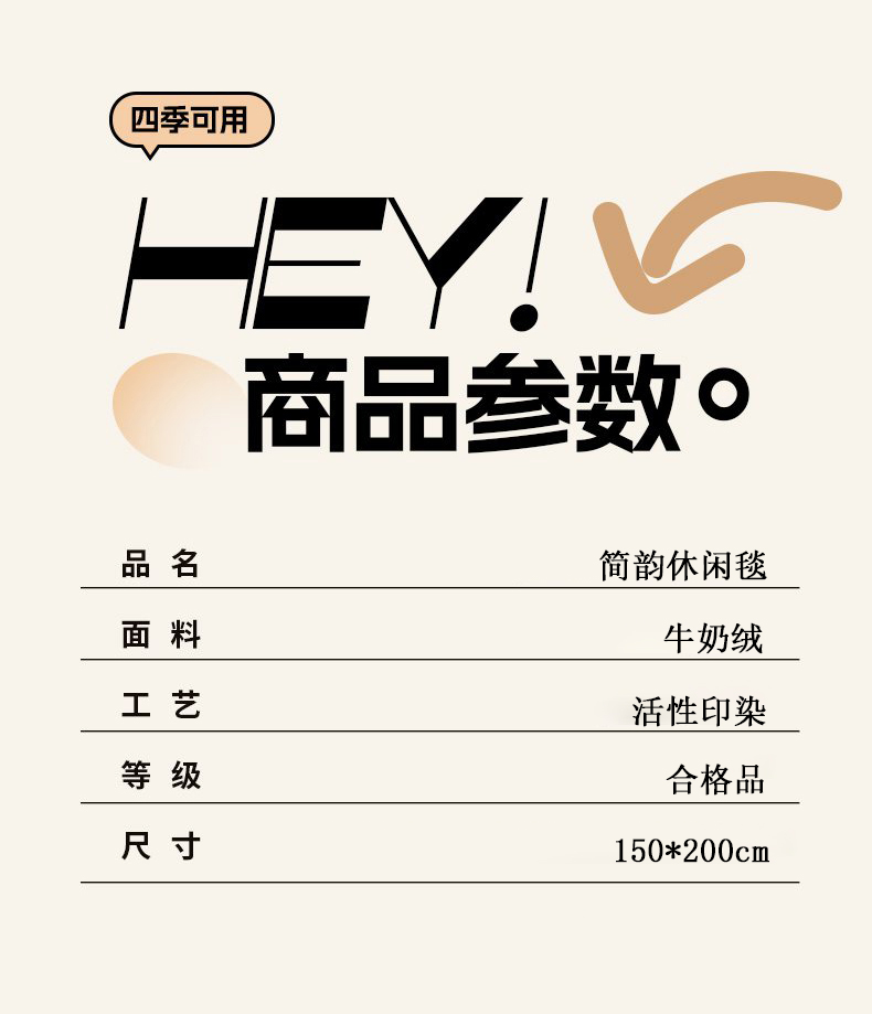 规格:150*200cm 面料:牛奶绒 克重:900g 产品包装:精美礼盒 包装尺寸:42*33*11cm 特点:牛奶绒面料,充分吸收汗气蒸发产生的热量, 舒适透气,精美大方,绒感细腻,呵护您娇嫩 肌肤新型植绒技术,绒毛结构丰盈紧实,不 易掉毛告别掉毛烦恼。