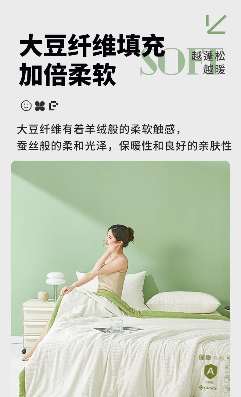 品 名:A类双拼大豆&夏被 规 格:1.5米/1.8米床通用 尺 寸:150*200 克 重:0.95Kg 填 充:90%聚酯纤维+10%大豆蛋白纤维 面 料:聚酯纤维