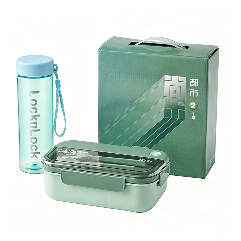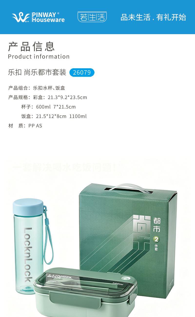 产品型号:26079 产品组合:乐扣杯+饭盒 产品规格:彩盒:21*23.5*8.3cm 杯子:600ml 7*21.5cm 饭盒:21.5*12*8cm 1100ml 材 质: PP AS 包 装:彩盒 重量/套: 465g