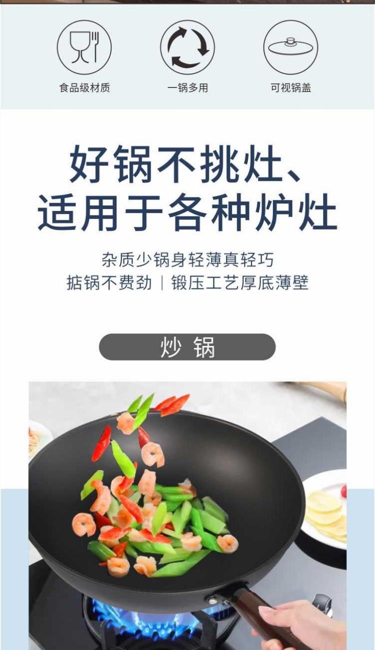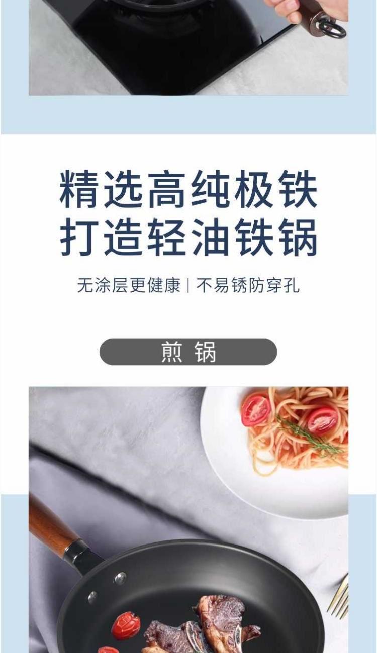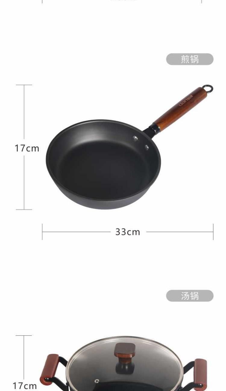 口径:炒锅 32cm、汤锅 24cm、煎锅 24cm 产品净重:3.8kg 产品毛重:4.5kg 整箱毛重:18.5kg 产品尺寸:炒锅 540 ⅹ 330 ⅹ 100mm 汤锅 360 ⅹ 255 ⅹ 160mm 煎锅 470 ⅹ 255 ⅹ 60mm 彩盒尺寸:600 ⅹ 155 ⅹ 365mm 外箱尺寸:630 ⅹ 600 ⅹ 380mm 材质:精铁 1、一日三餐煎、炒、炸、煮,栖饪三件套驾驭; 2、精选高纯极铁,打造轻油铁锅,无涂层更健康,不易锈防穿孔; 3、杂质少锅身轻薄真轻巧,掂锅不费劲,锻压工艺厚底薄壁; 4、锅底加厚储热性更好,锅壁薄传热快,快速升温,更适合烹煮; 5、好锅不挑灶,适用于明灶、电磁炉。