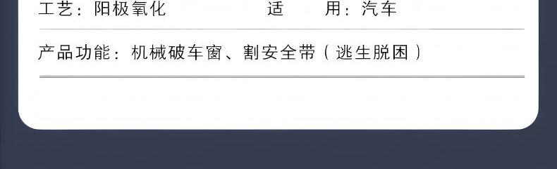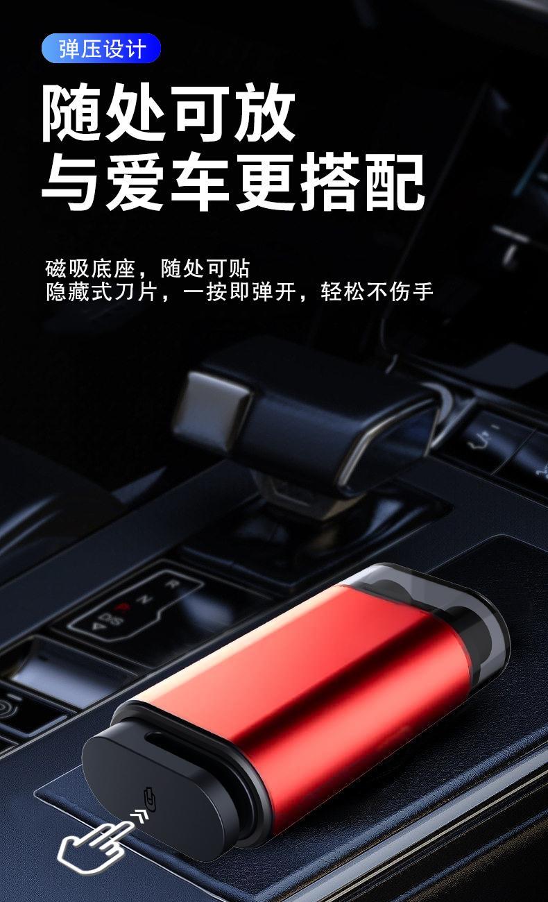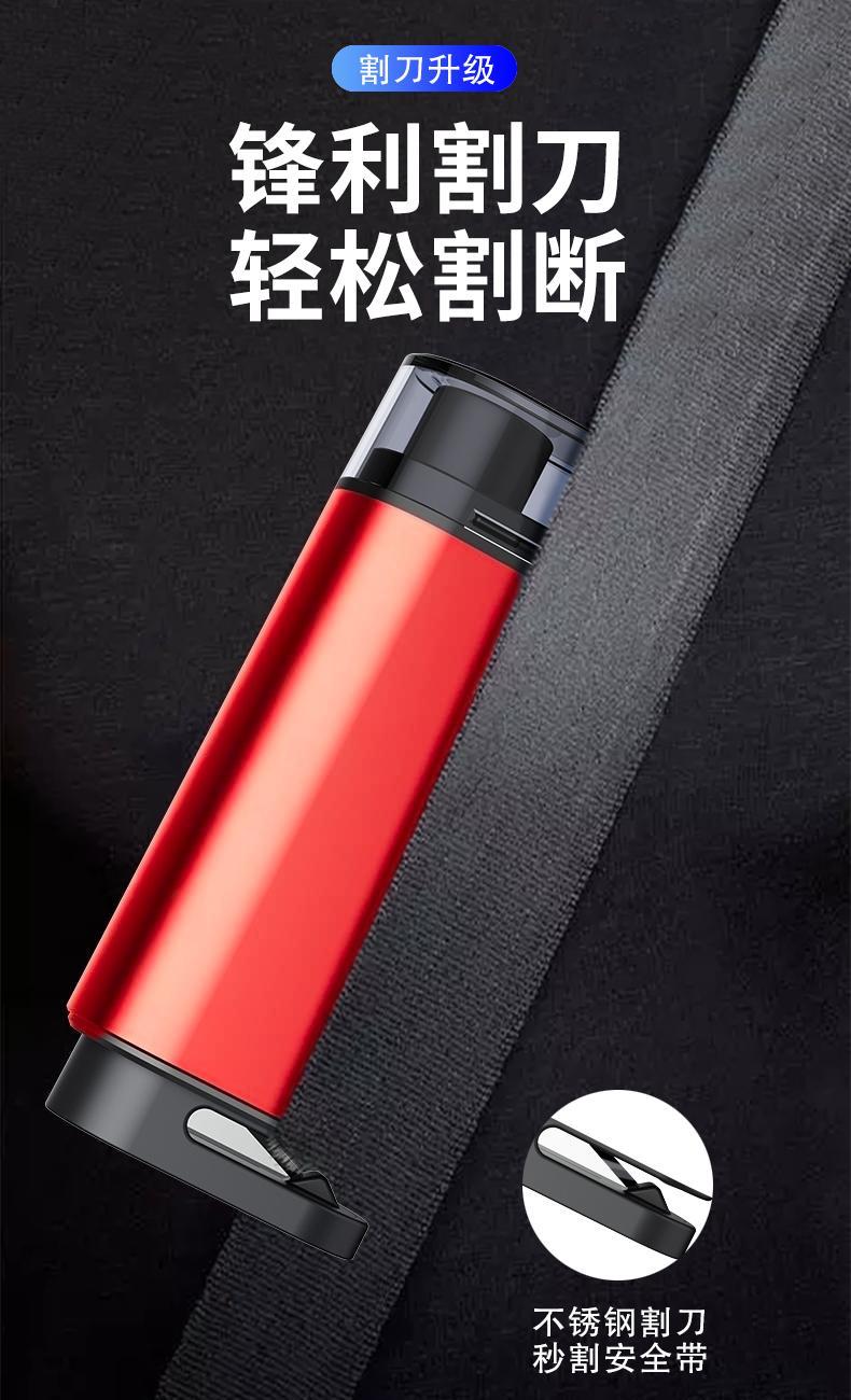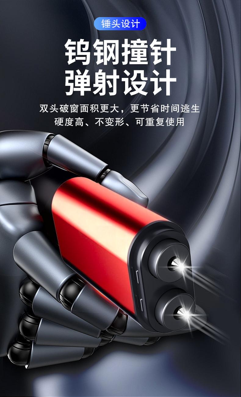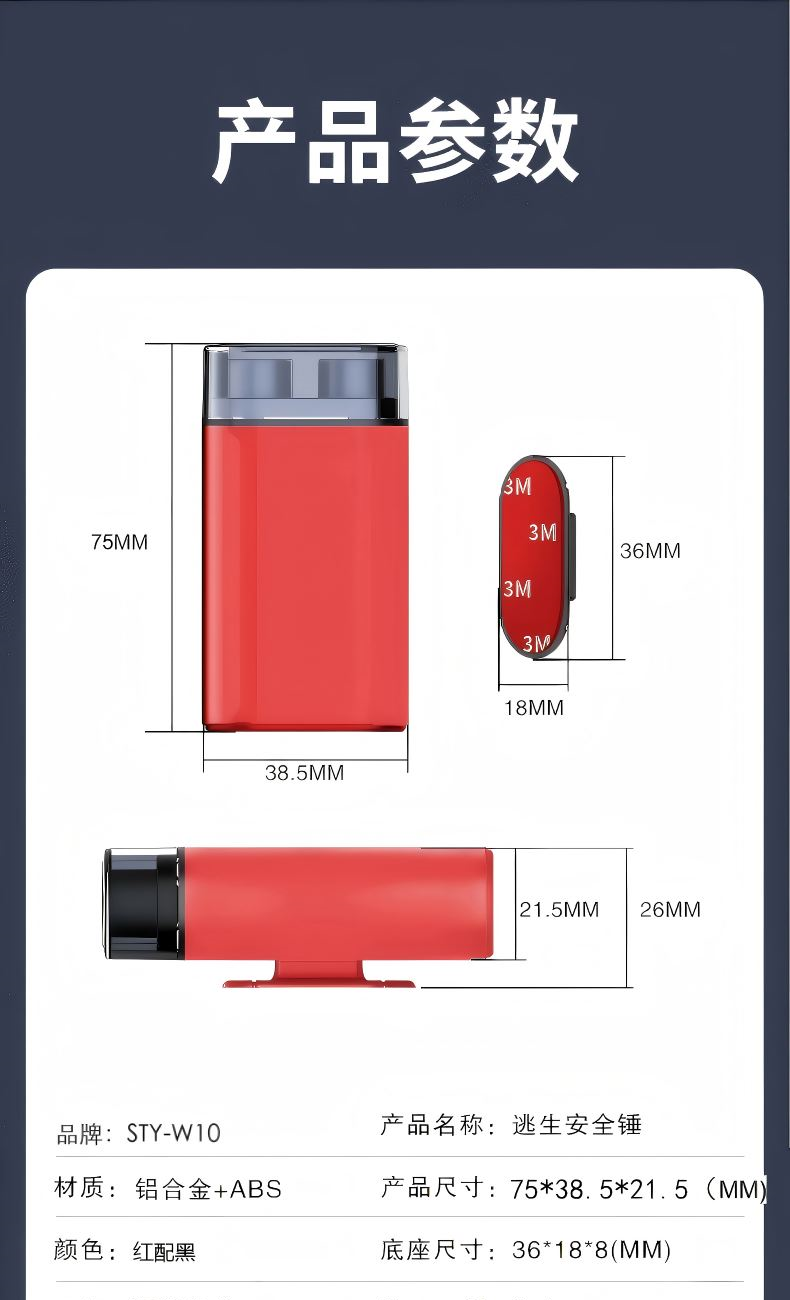 颜 色: 红配黑 材 质: 铝合金、PC+ABS 产品尺寸:73*38.5*21.5mm 产品包装尺寸:127*85*38mm 产品净重:56.4g ● 双钨钢钢头,无坚不摧,轻松破窗 ● 金属外壳,弹簧按压,秒割安全带,弹出式刀片不伤手 ● 不惧水压,水下也能用 ● 配合底座、放置便利