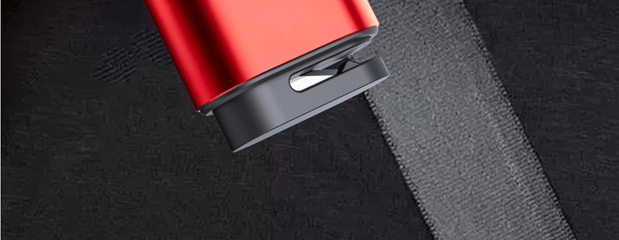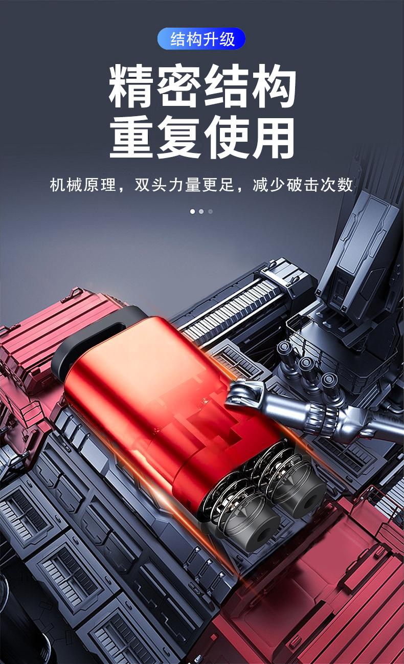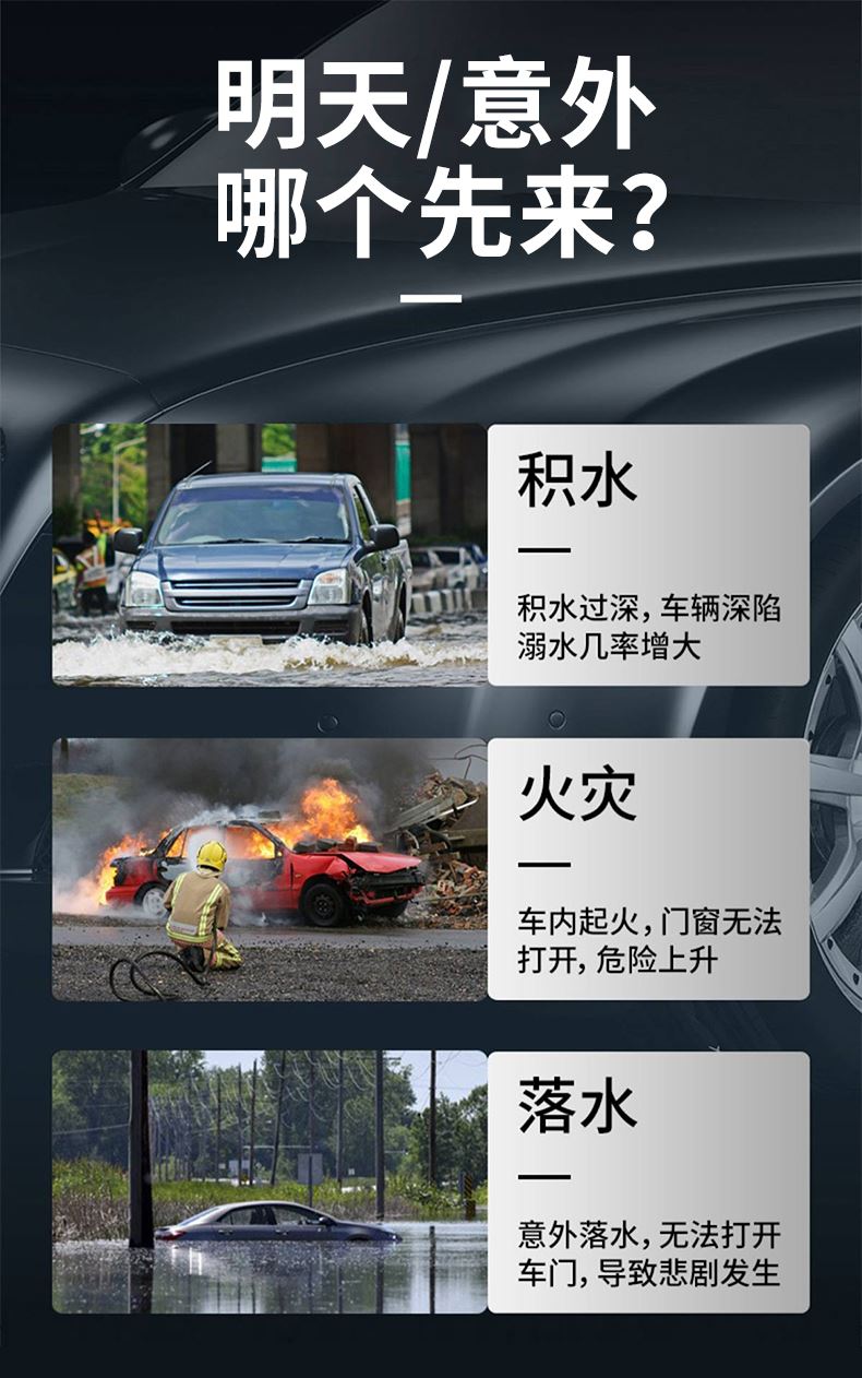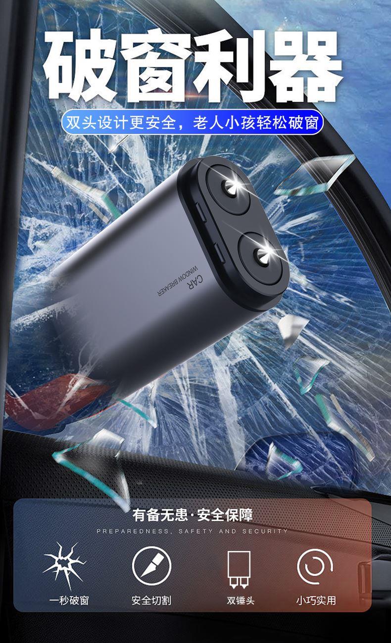 颜 色: 红配黑 材 质: 铝合金、PC+ABS 产品尺寸:73*38.5*21.5mm 产品包装尺寸:127*85*38mm 产品净重:56.4g ● 双钨钢钢头,无坚不摧,轻松破窗 ● 金属外壳,弹簧按压,秒割安全带,弹出式刀片不伤手 ● 不惧水压,水下也能用 ● 配合底座、放置便利