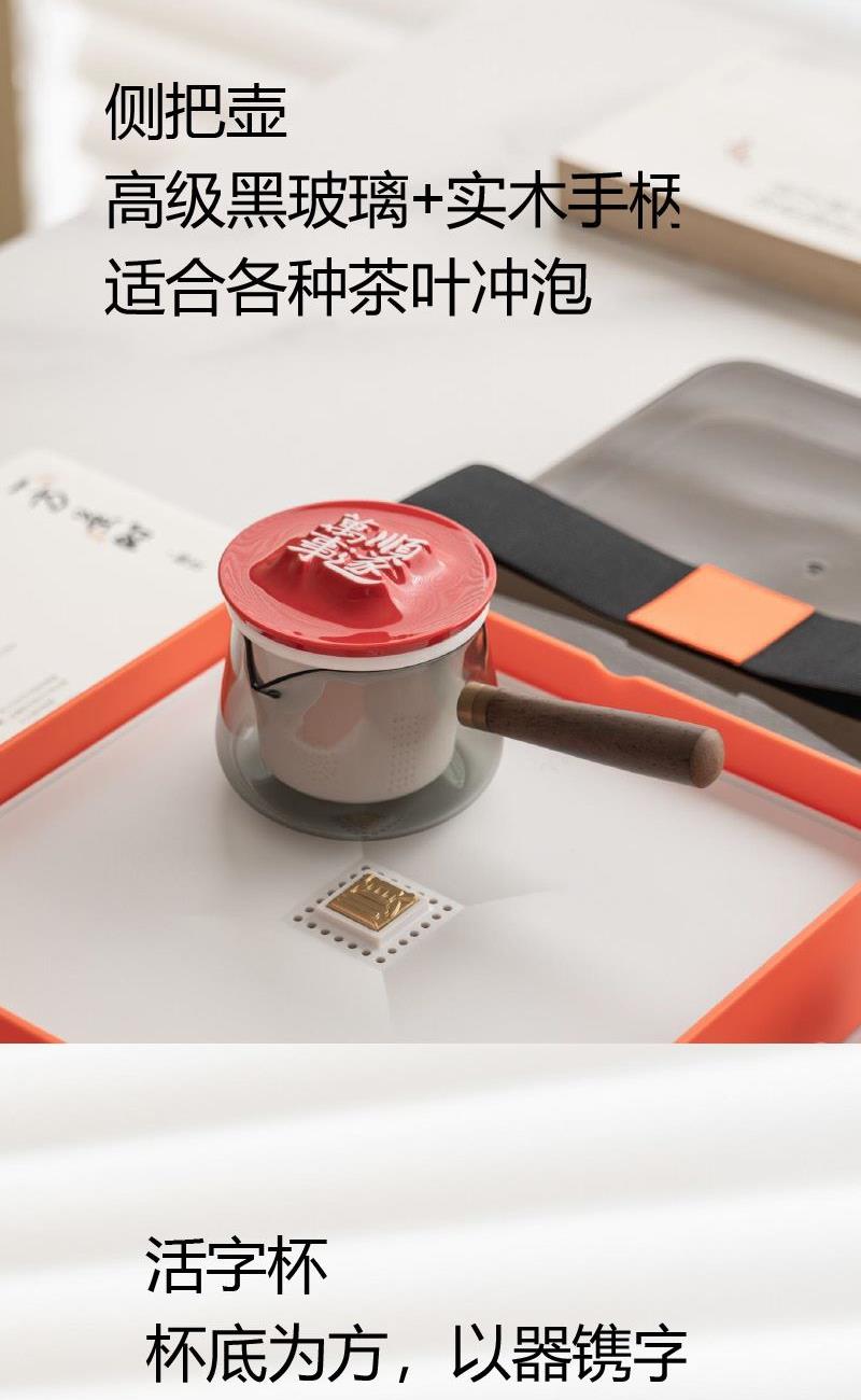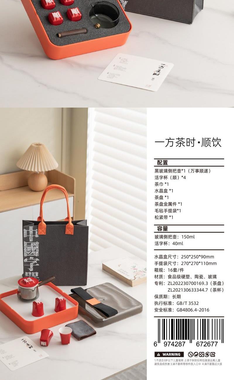 1:汉字杯历经1300度以上高温烧制,不含铅和镉等重金属。 2:杯底为方,杯口为圆,结合中国传统祝福文字,手工塑形。 3:黑玻璃+实木手柄,简洁易用。 4:水晶盒包装,既是储水茶盘也是收纳盒。 5:毛毡手提袋,简约大气 配置:顺字杯*4 黑玻侧把壶*1(万事顺遂)茶巾*1 水晶盒*1 茶盘*1 材质:白玉瓷胎 颜色:中国红 尺寸:包装包装260*260*95mm 容量:壶150ml杯40ml